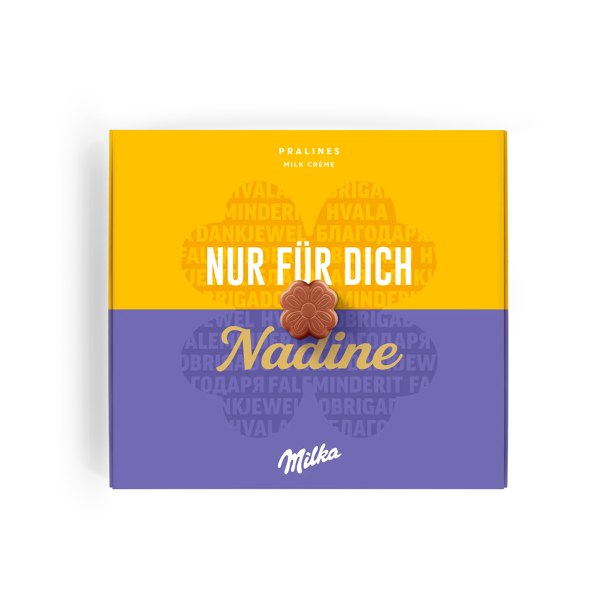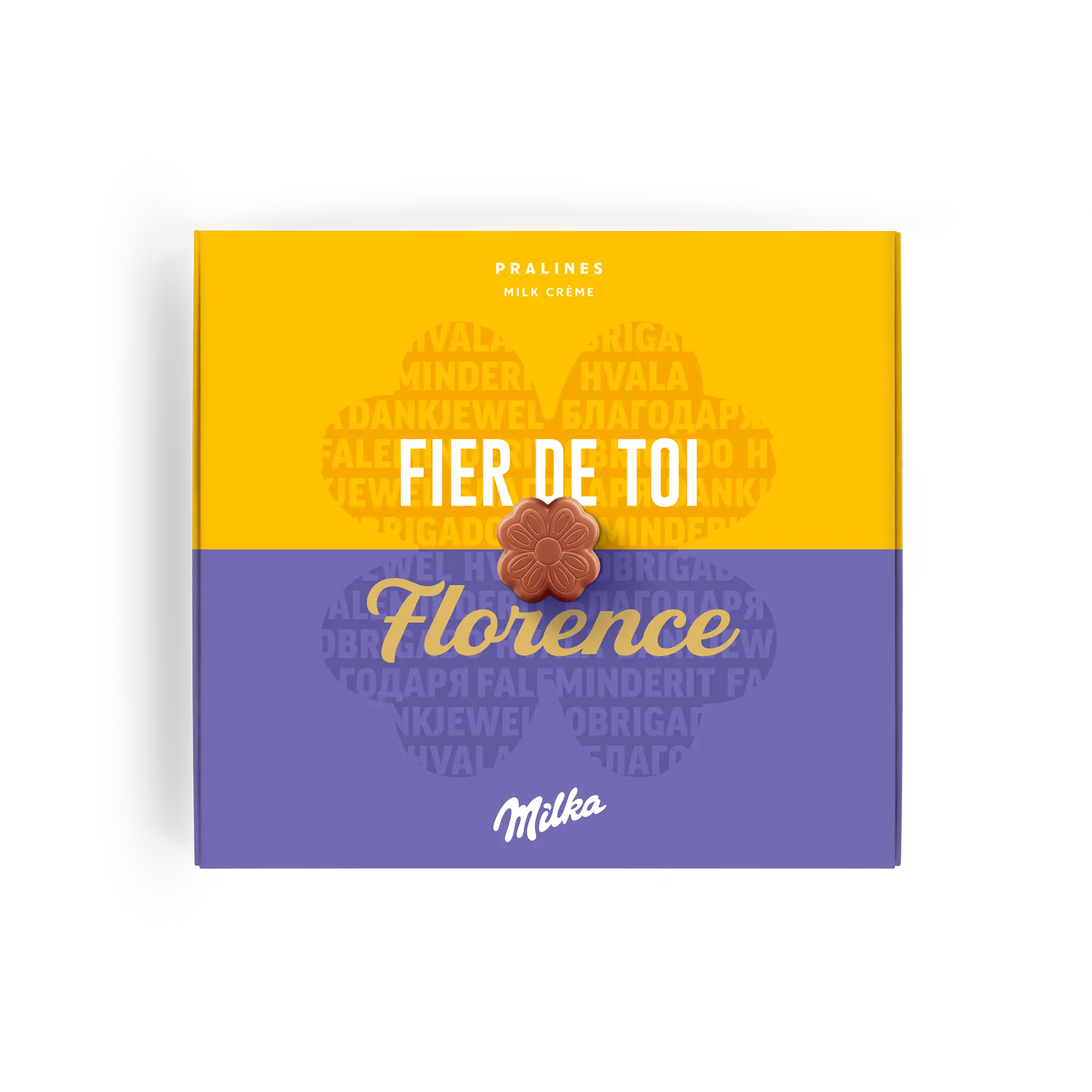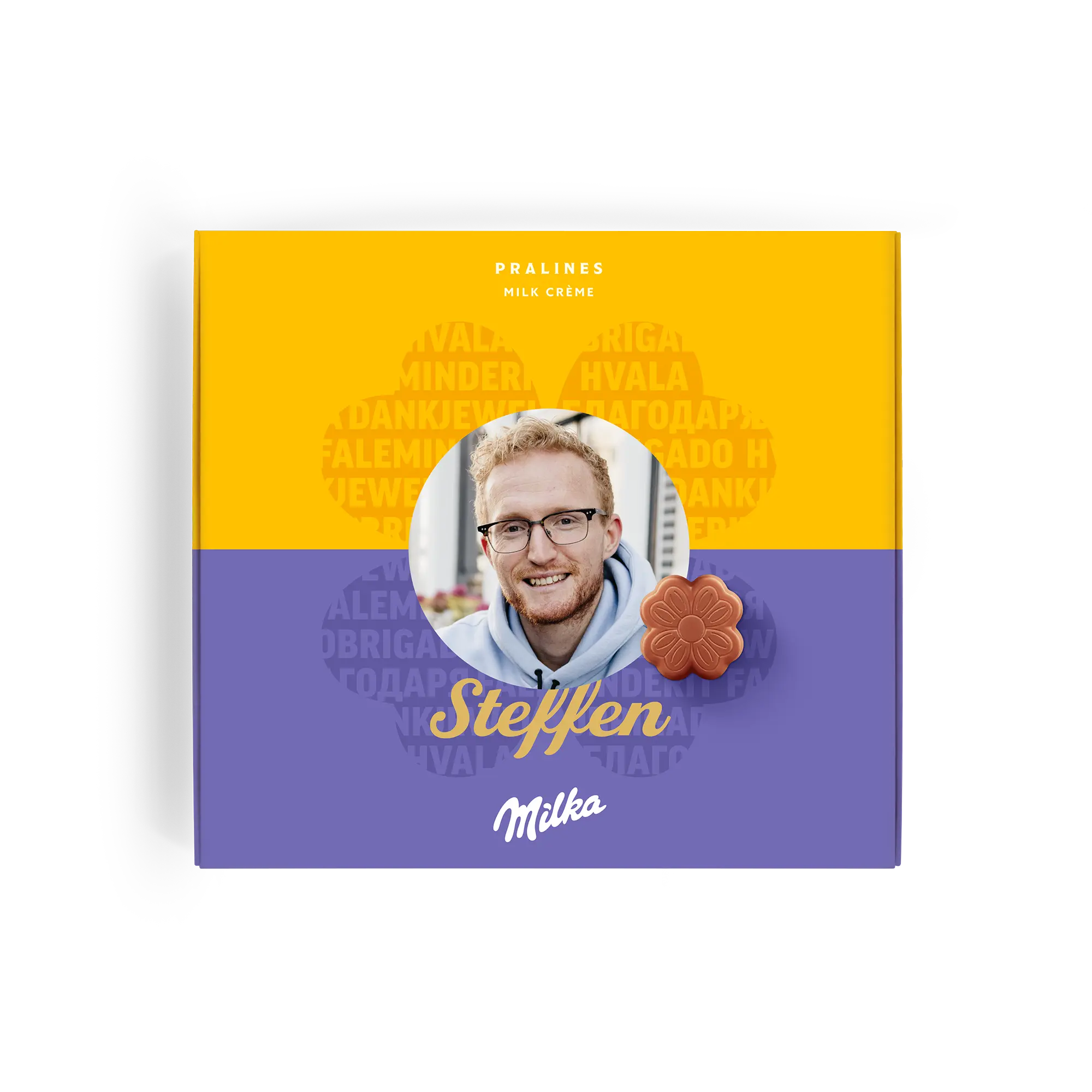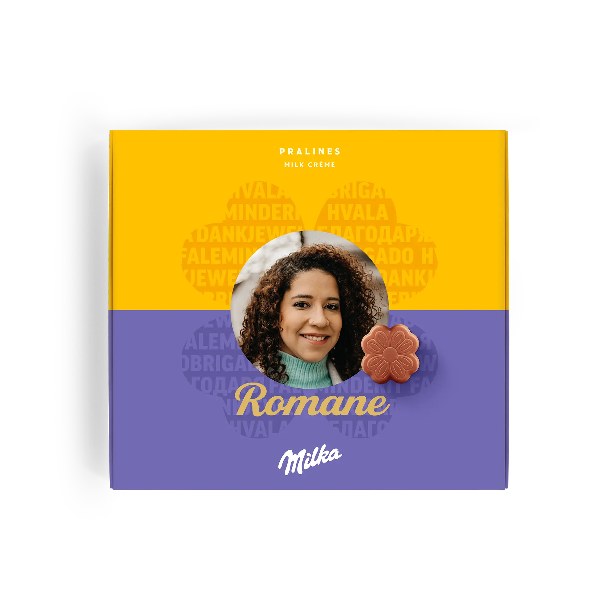 A personalised 'Say it with Milka' gift box makes the most delicious thank you. A personalised chocolate gift with name, photo and message.More information on the Milka thank you gift:Chocolate: Alpine milk chocolate with cream fillingPraline shape: flowersAmount of pralines: 20Weight: 110 gramsDimensions: 19.50 x 18 x 2 cmPersonalisation: photo, name and personal messagePrint: picture perfect and in full colourIngredients: Sugar, palm oil, cocoa butter, skimmed milk powder, whey (milk) powder, cocoa mass, milk fat, emulsifiers (soy lecithin, E476), hazelnut paste, flavourings. 7% skimmed milk powder in the milk cream filling.Allergens: Contains hazelnuts, milk and soy. May contain other nuts and gluten.Good to know:When the outside temperature is 25 degrees Celsius or above we will not be able to guarantee the quality of the chocolate. If you have any questions regarding your chocolate orders please contact our customer service team.For technical reasons, it is not possible to process Cyrillic, Turkish, Arabic, Asian or special characters.