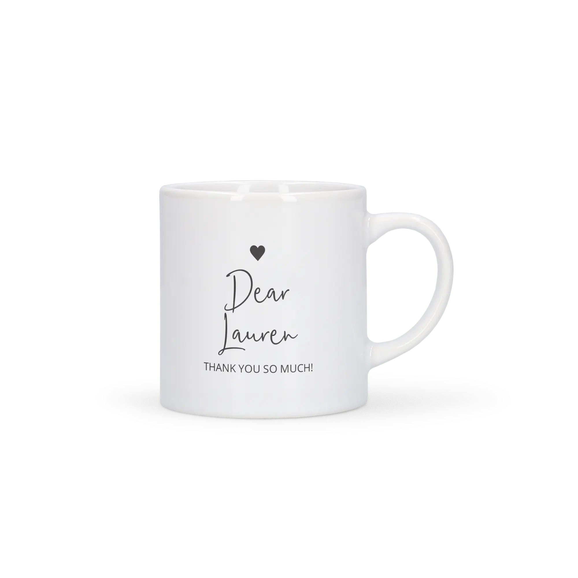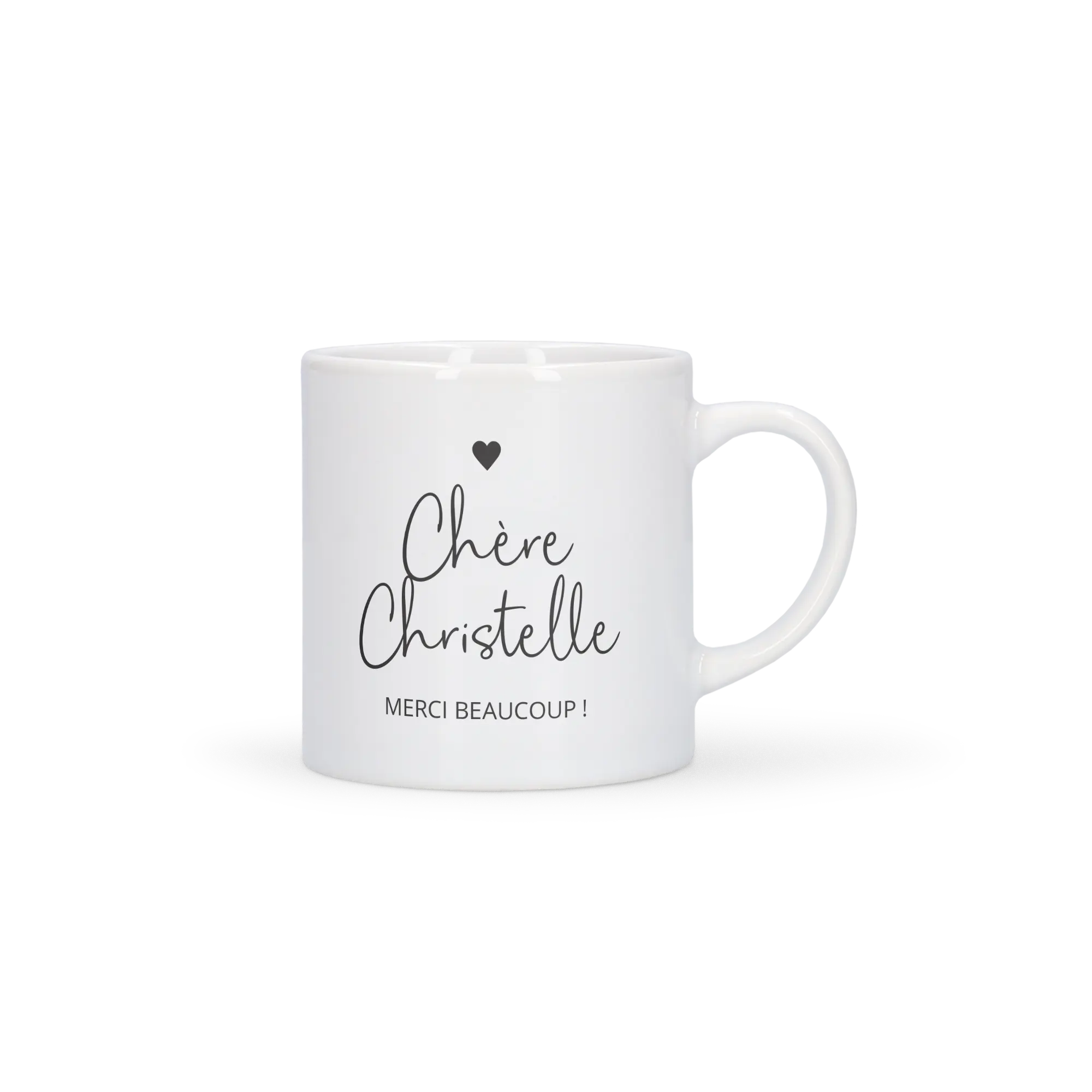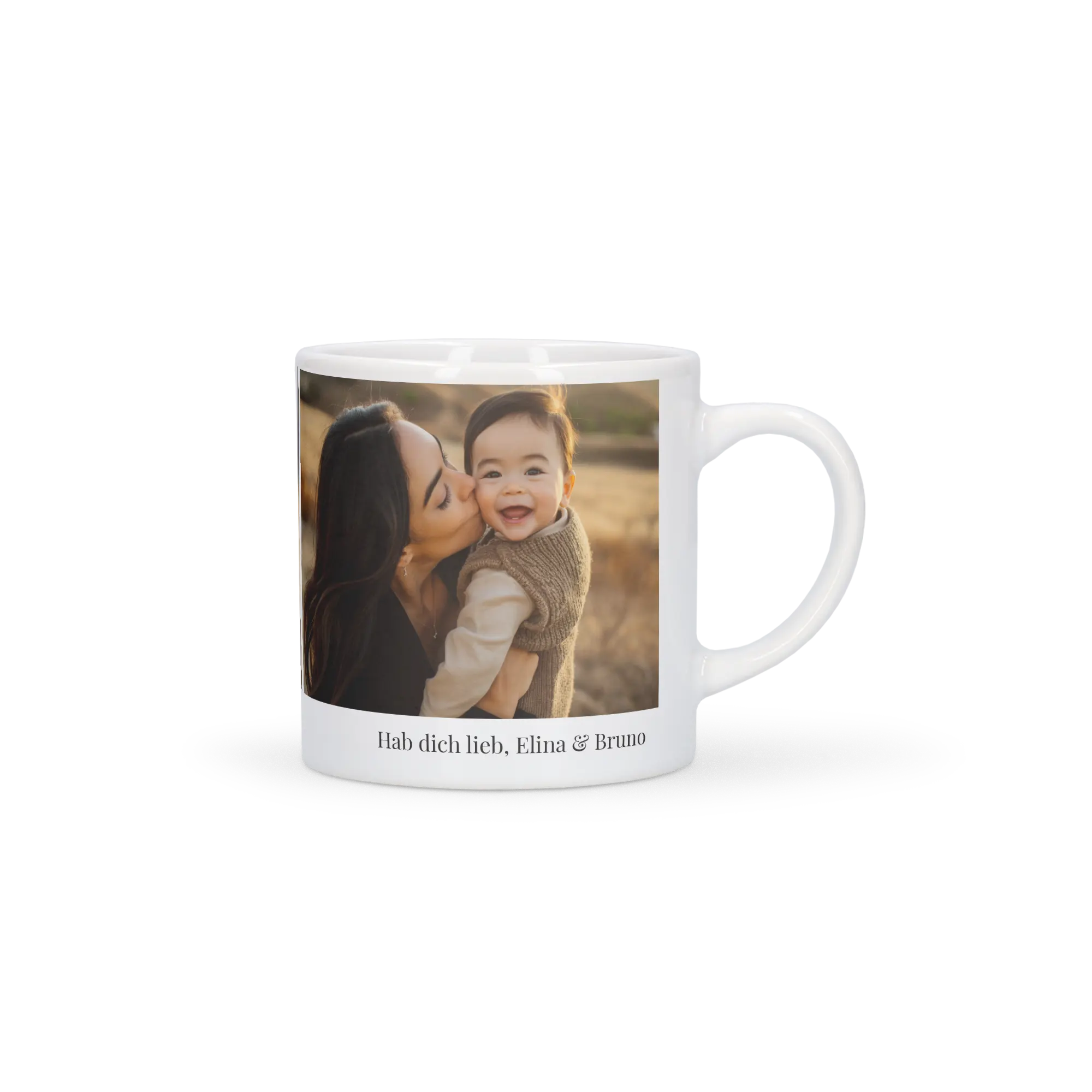 Have a small coffee cup printed with the photo or logo of your choice. No minimum quantity. High-quality ceramics. 100% dishwasher-safe.More information on the small coffee cup:Colour: whiteMaterial: high-quality glossy ceramicHeight: 7 cm / 2.8"Diameter: 6.8 cm / 2.7"Capacity: 175 ml Personalisation: with photo and/or textPrint: high quality and in full colourExtra: the cup is dishwasher and microwave safe