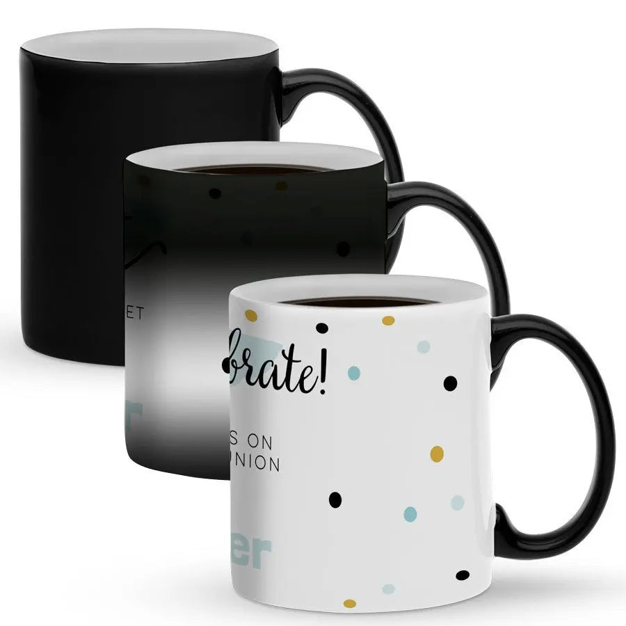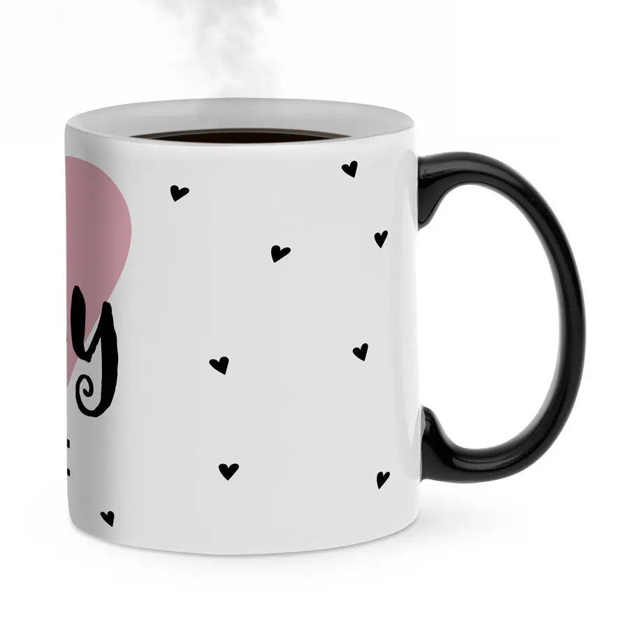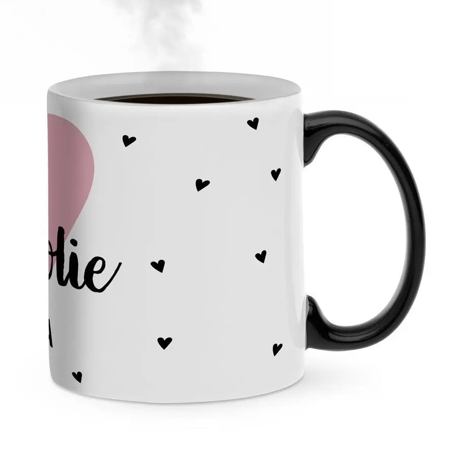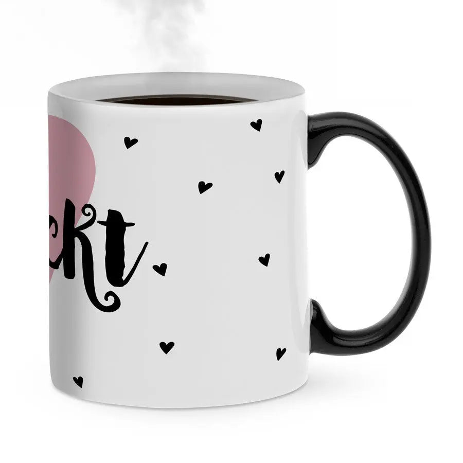 A magic mug with your name or favourite text. Unique: image appears when the mug is filled with a hot drink! A great gift!More information about the magic mug: Material: ceramic Height: 9,5 cm / 3.7" Diameter: 8,2 cm / 3.2" Content: 325 ml Please note: The mug will be entirely black when delivered. Your design will only become visible after filling the mug with a hot beverage. The image will always be slightly visible through the magic layer and is not dishwasher-proof and not suitable for the microwave!