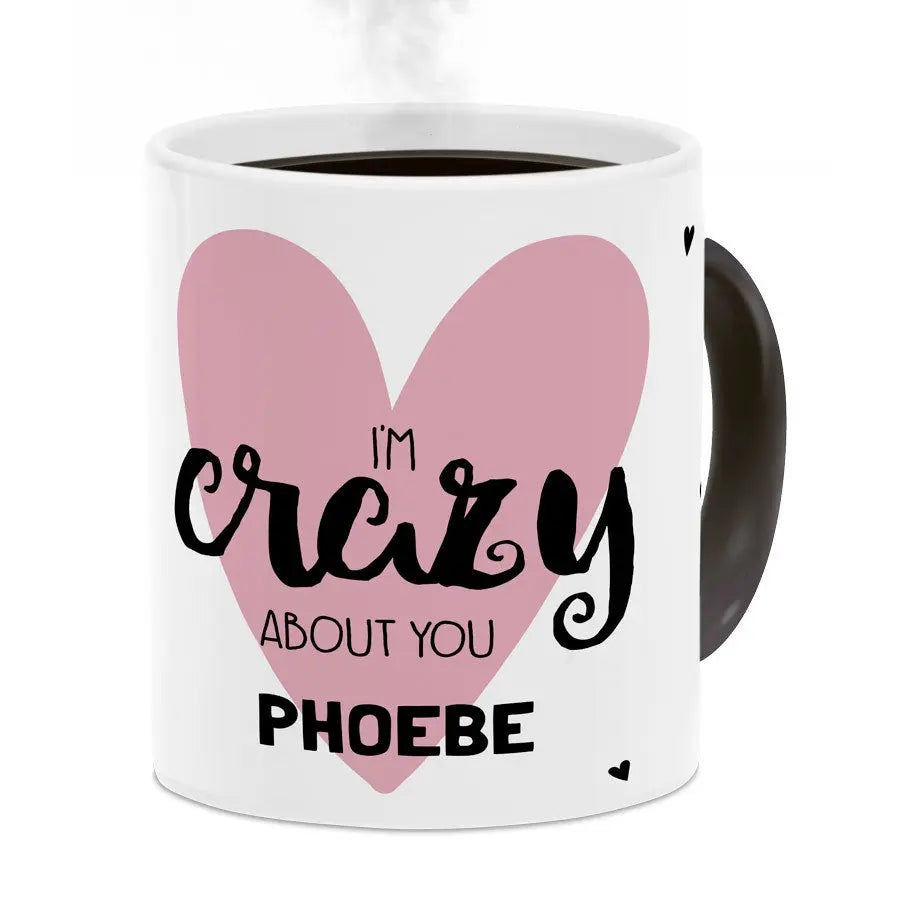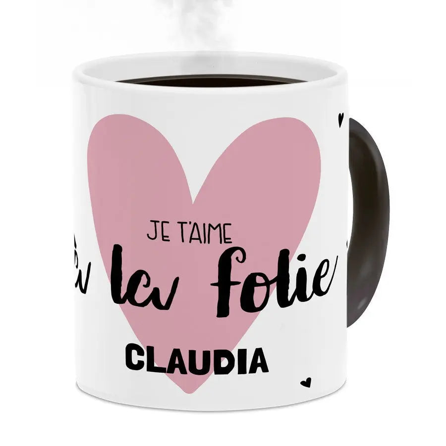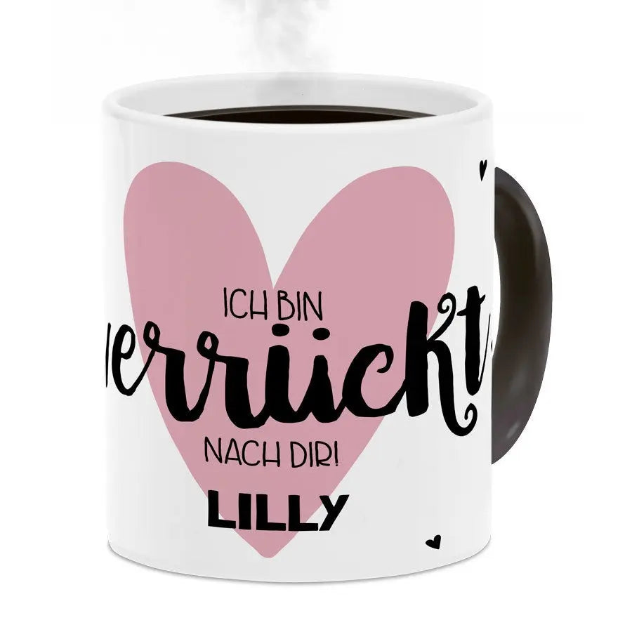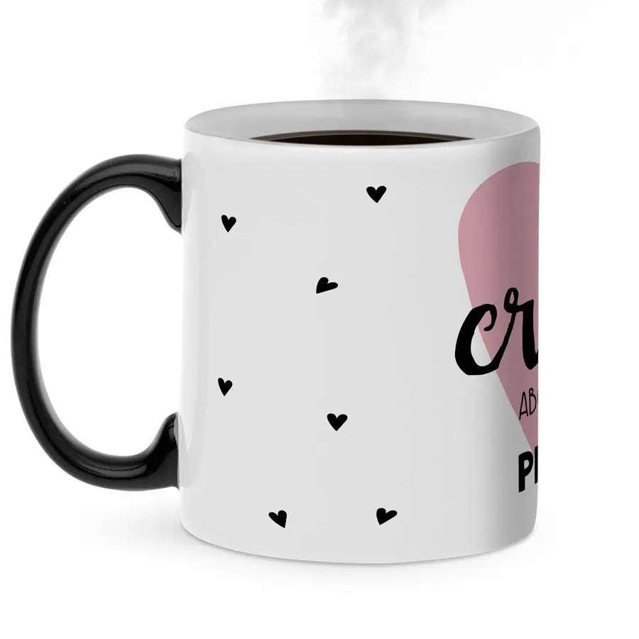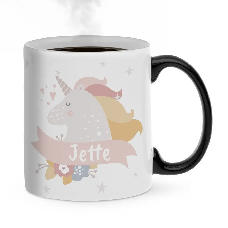 A magic mug with your name or favourite text. Unique: image appears when the mug is filled with a hot drink! A great gift!More information about the magic mug: Material: ceramic Height: 9,5 cm / 3.7" Diameter: 8,2 cm / 3.2" Content: 325 ml Please note: The mug will be entirely black when delivered. Your design will only become visible after filling the mug with a hot beverage. The image will always be slightly visible through the magic layer and is not dishwasher-proof and not suitable for the microwave!