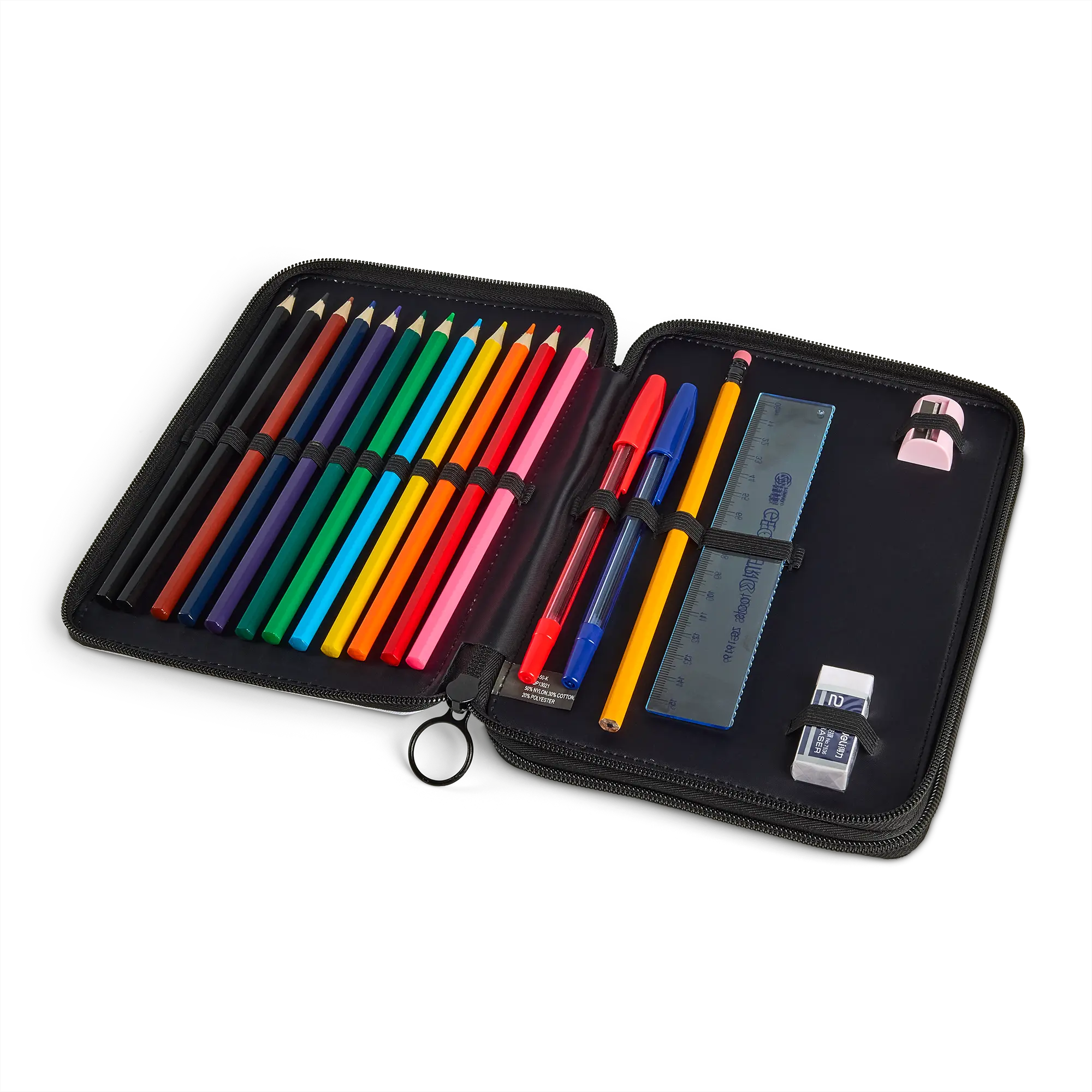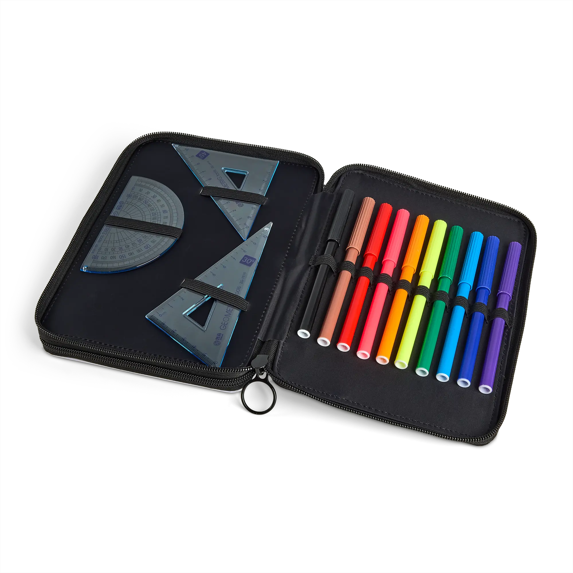 A useful 32-piece drawing set in personalised case, printed with your own photo and text!More information about the drawing set:Size: 15 x 21 cm.Material case: cotton/polyesterContents: 12 colour pencils, 10 felt-tip pens, 1 lead pencil, 2 ballpoint pens, 5-piece ruler set, pencil sharpener and eraser