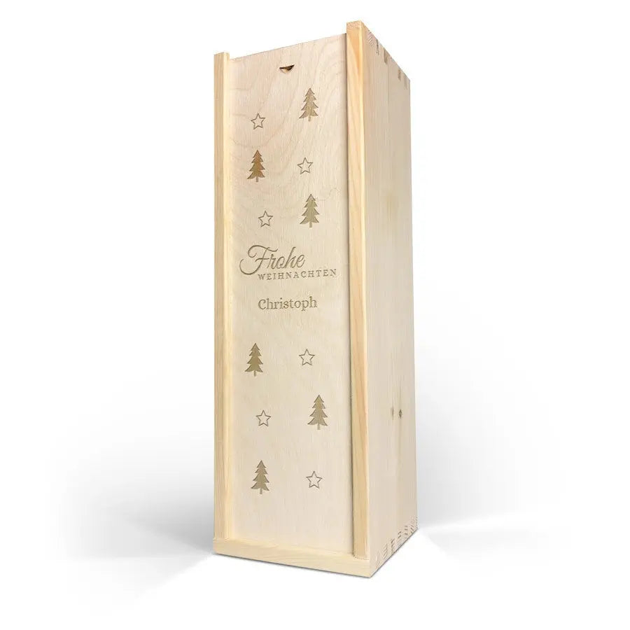 More information on the deluxe wooden case:Personalisation: with name and/or textPersonalisation placement: on wooden case lidPersonalisation method: high-quality laser-engravingCase dimensions: 36.5 x 12 x 11 cmLid dimensions: 35.6 x 10.2 x 0.3 cmAdditional information: the deluxe wooden case is made with FSC-certified woodMore information on the wine:Brand: Maison de la SurpriseType: redContents: 750 mlCountry of origin: FranceGrape: MerlotCharacter: Maison de la Surprise Merlot has notes of dark fruit and a hint of vanilla. Pairs well with poultry and roasted meat.