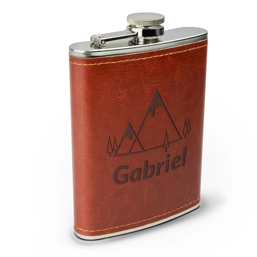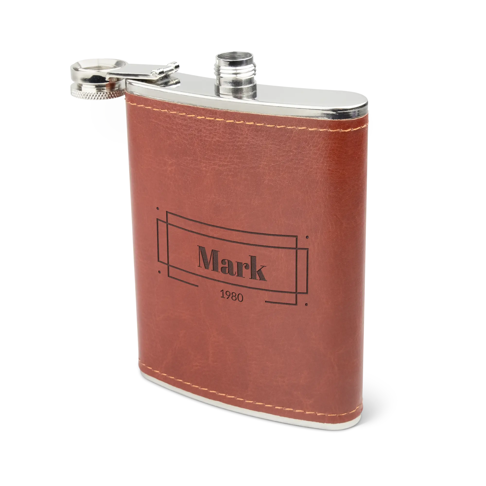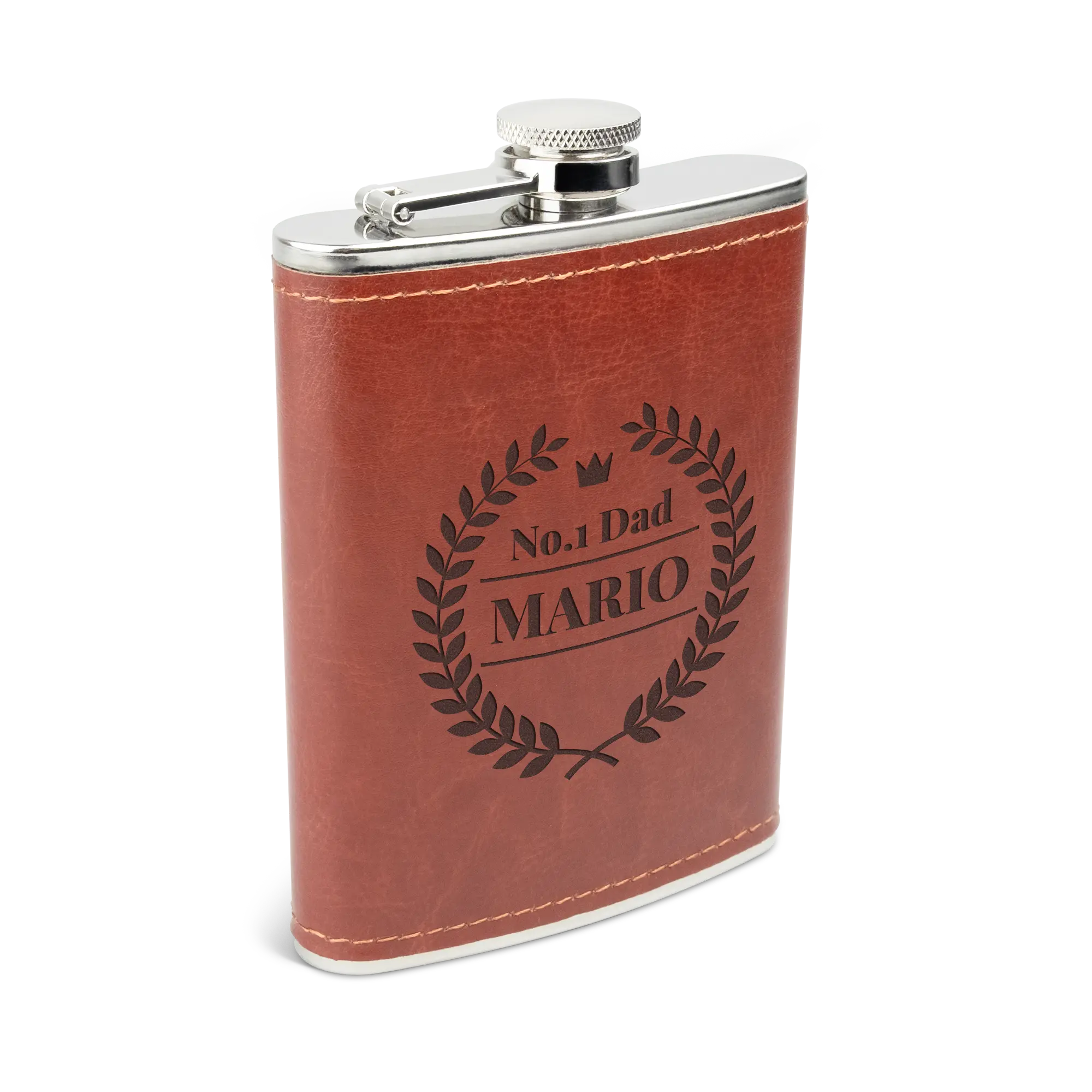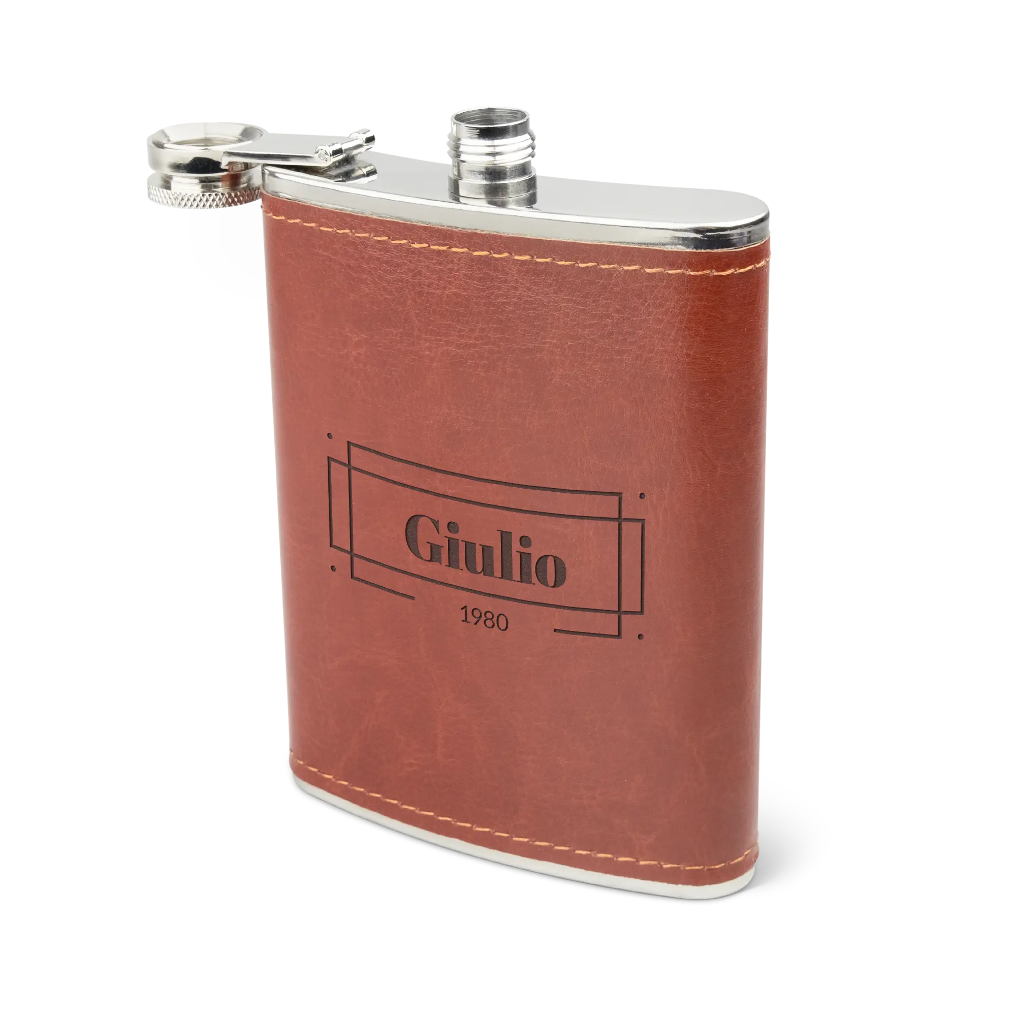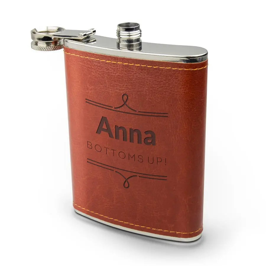 who will you surprise with a personalized flask? A unique gift with an engraved name or text. Stainless steel with an elegant leather case. Cheers!More information about the engraved flask: Material: high-quality stainless steel with leather case. Color: cognac Dimensions: 3.74 x 4.80 x 1.06 in Capacity: +/- 8.5 oz Personalization: with name or text Personalization method: high-quality laser engraving Extra: practical screw cap