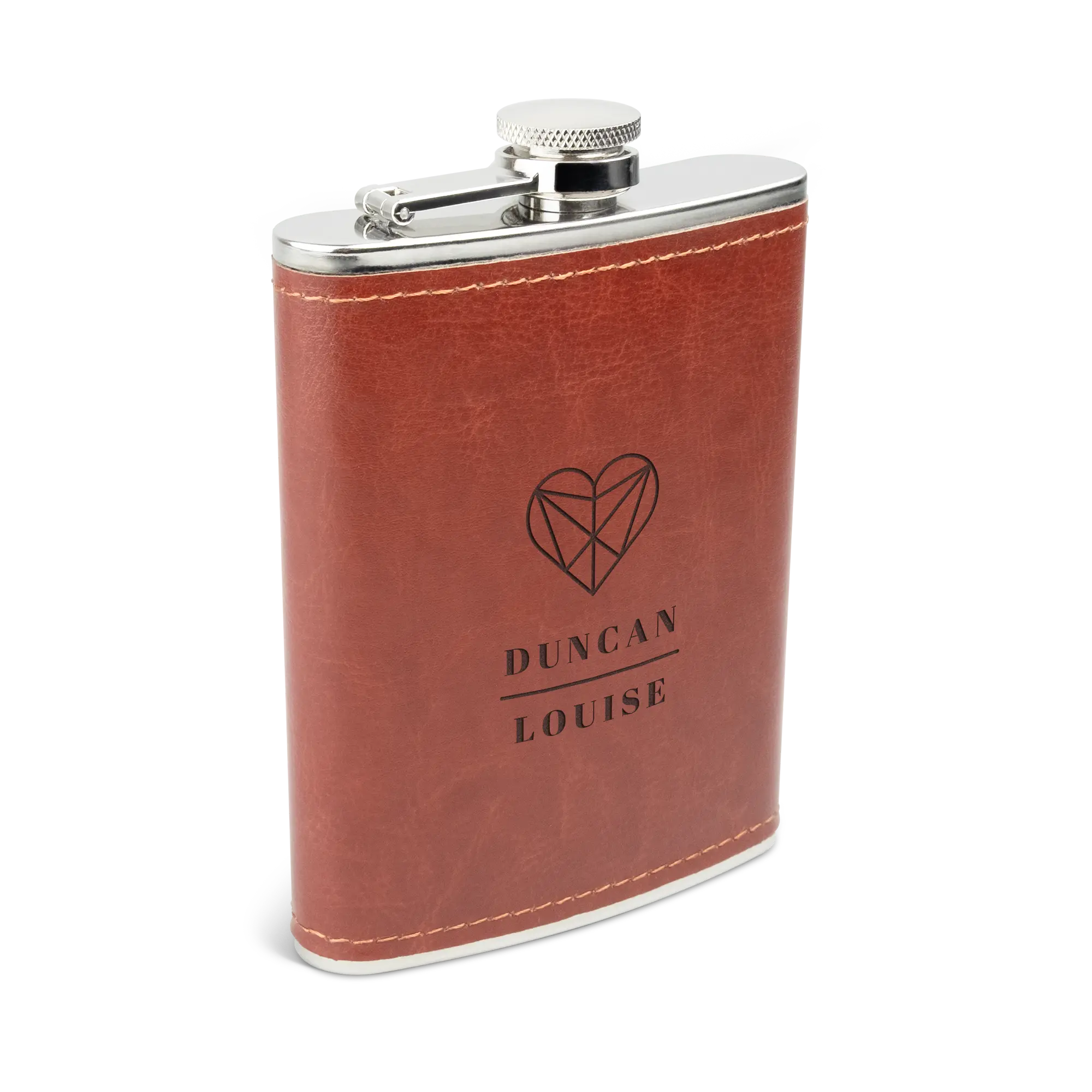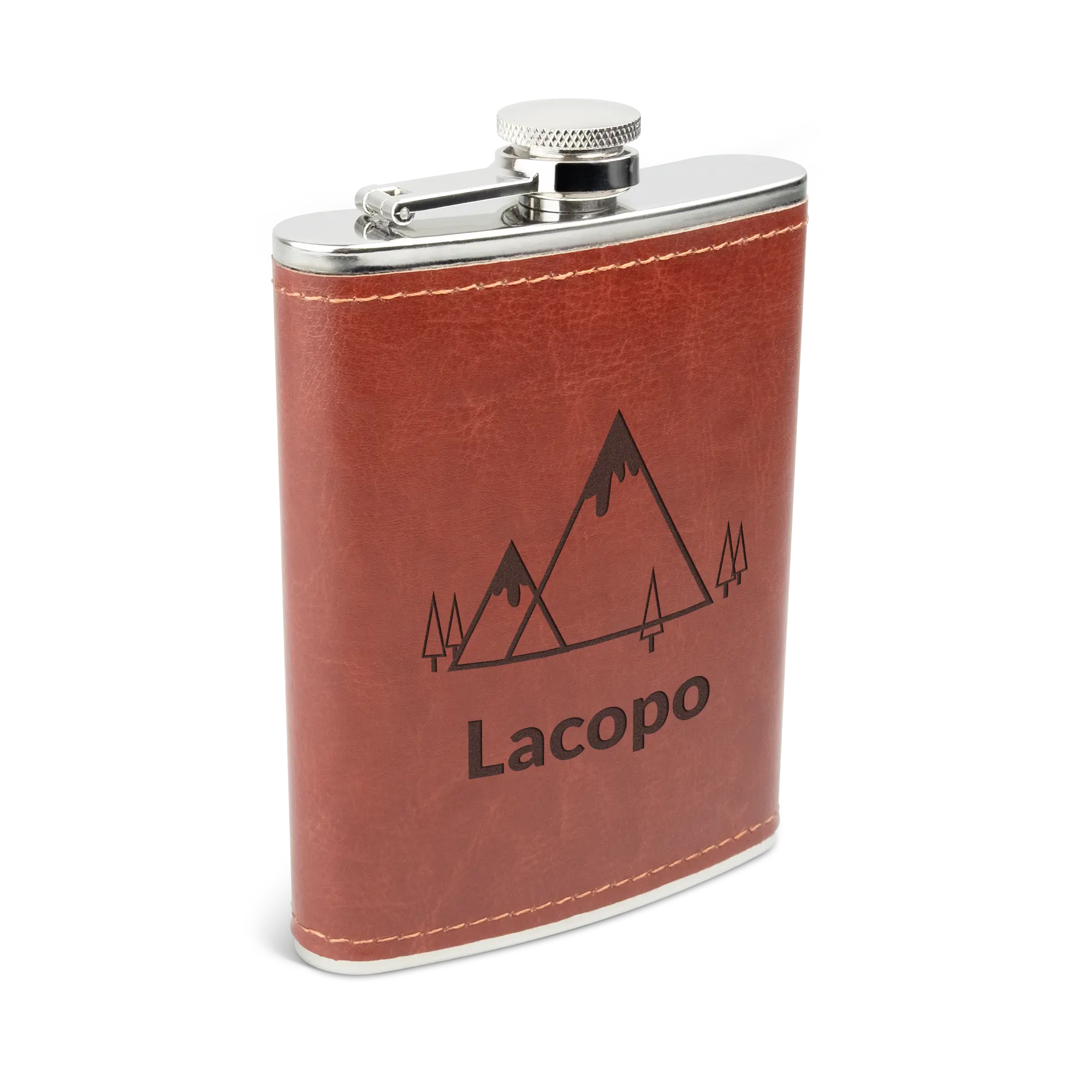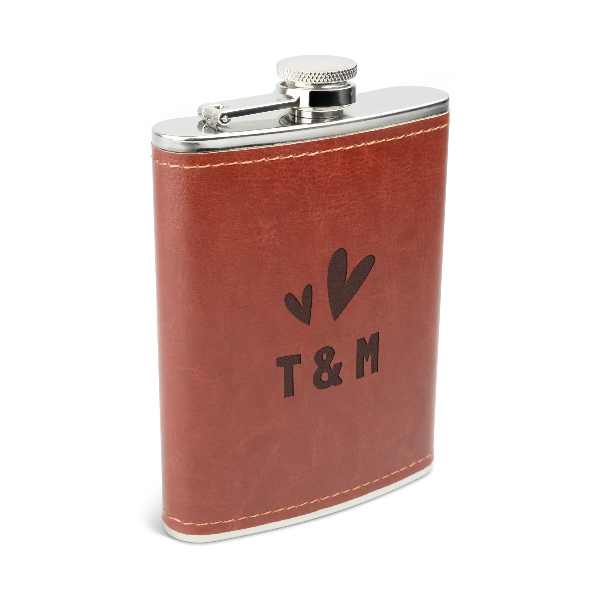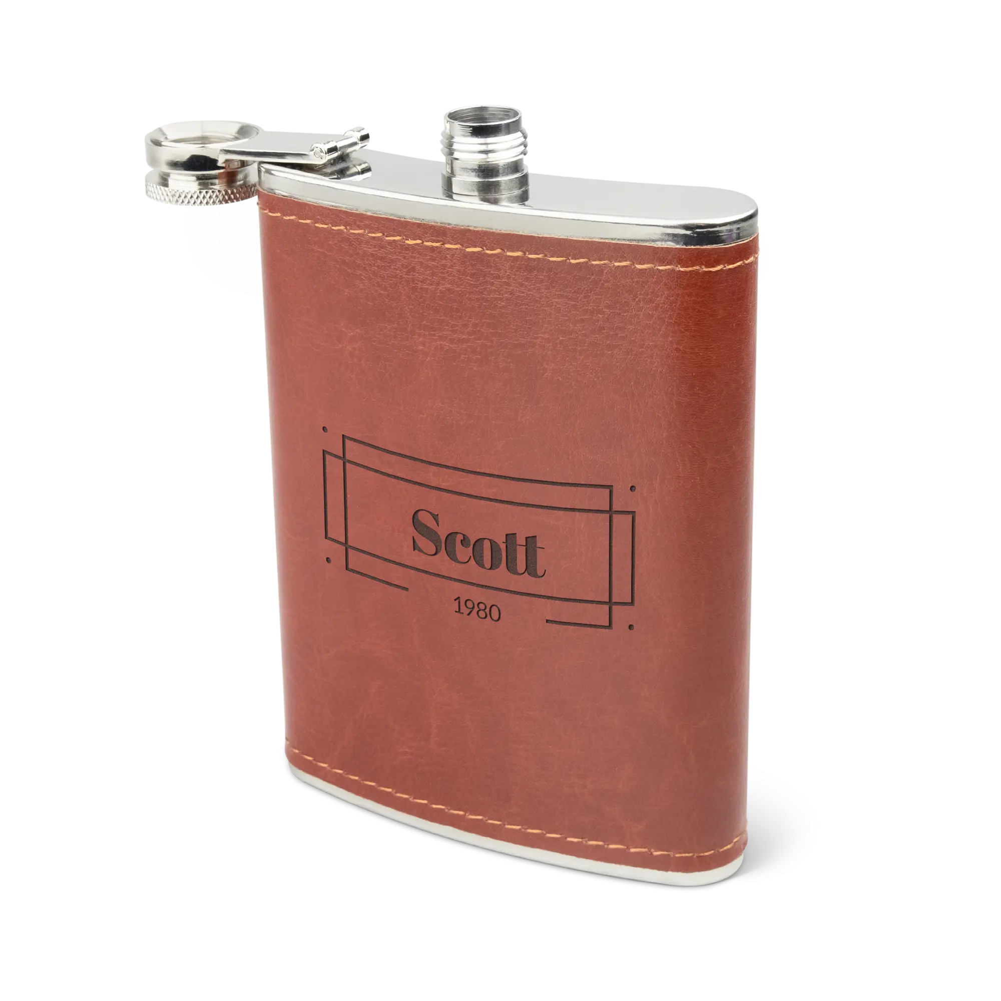 who will you surprise with a personalized flask? A unique gift with an engraved name or text. Stainless steel with an elegant leather case. Cheers!More information about the engraved flask: Material: high-quality stainless steel with leather case. Color: cognac Dimensions: 3.74 x 4.80 x 1.06 in Capacity: +/- 8.5 oz Personalization: with name or text Personalization method: high-quality laser engraving Extra: practical screw cap