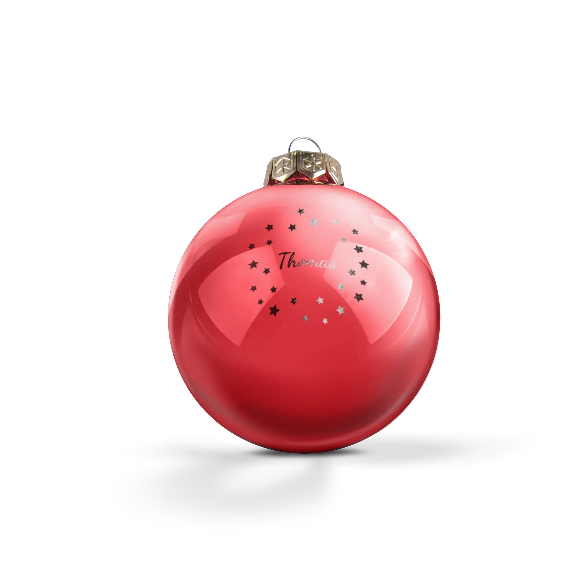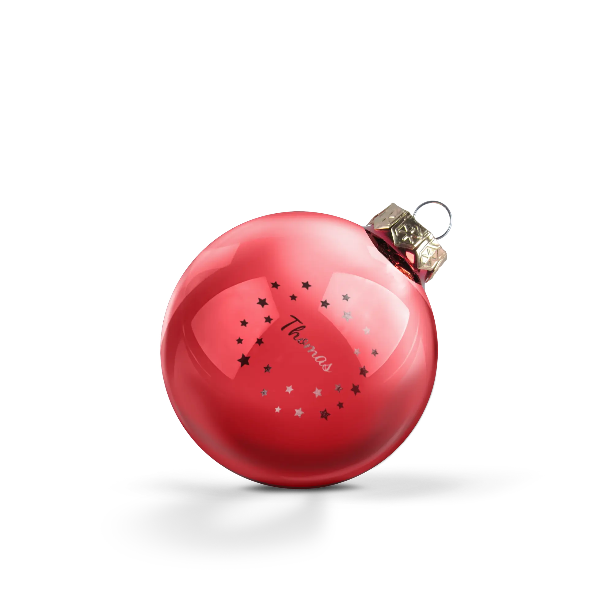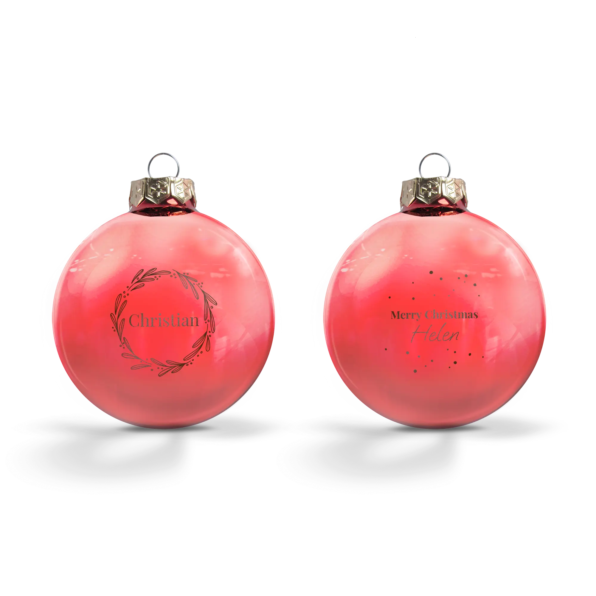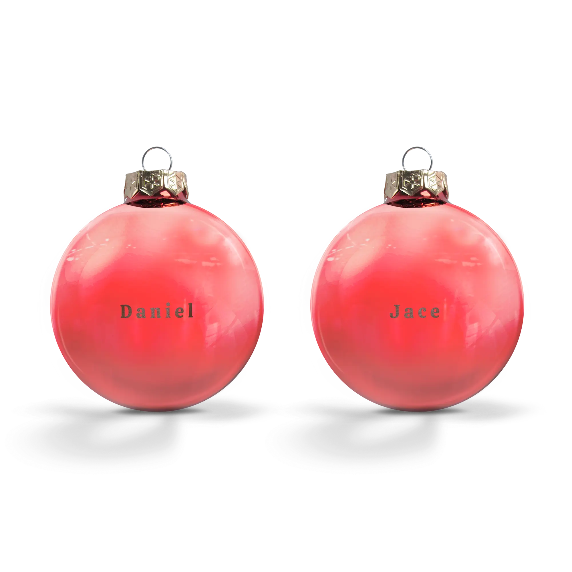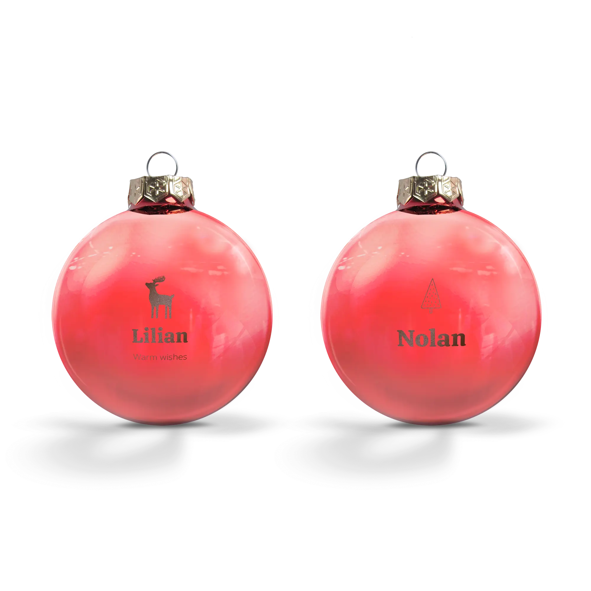 Want to engrave a personal Christmas ornament with a name? Choose one of the merry Christmas designs and really complete the surprise with a name or text!More information on the glass Christmas baubles: Amount: set of 2 Size: Ø 8 cm Material: high-quality glossy glass (non-transparent) Colors: gold, silver and red Personalisation: With a name and/or text Engraving: high-precision laser technique Location: single-sided middle on the ball Crown: gold with string