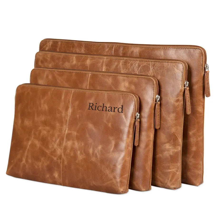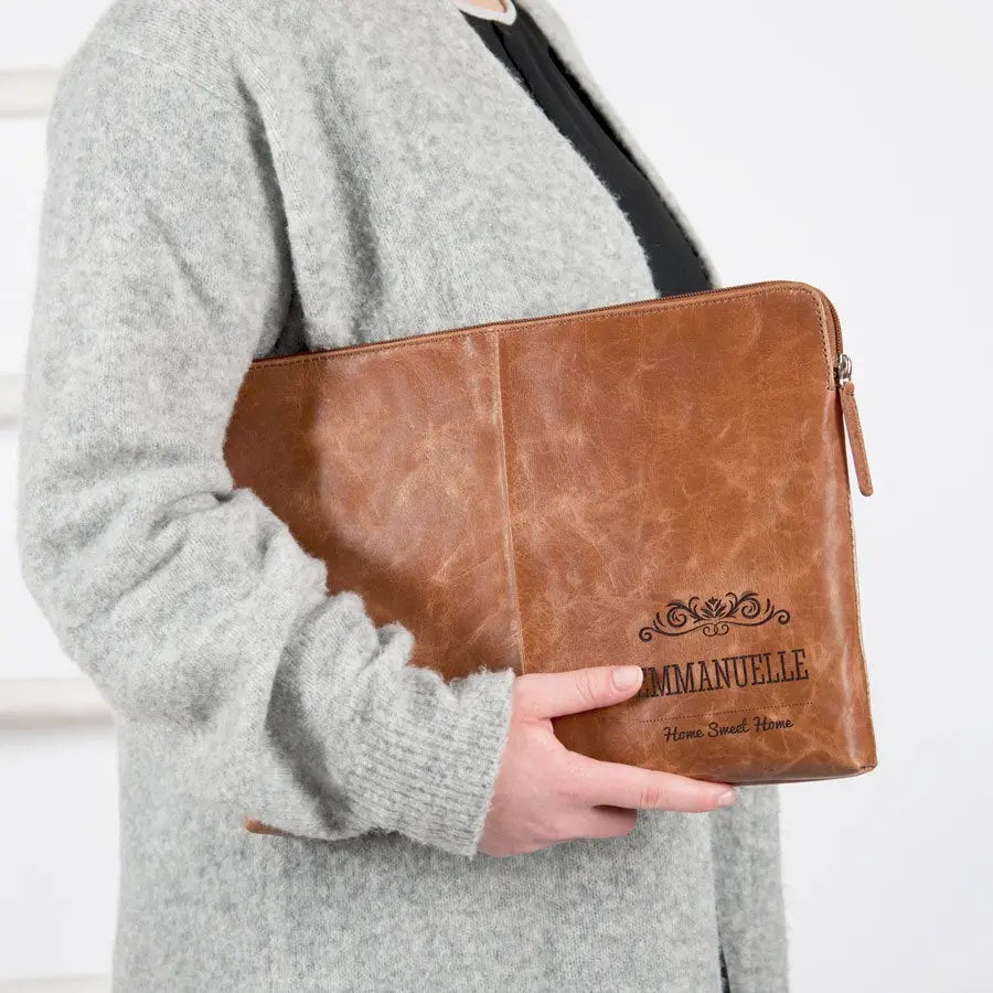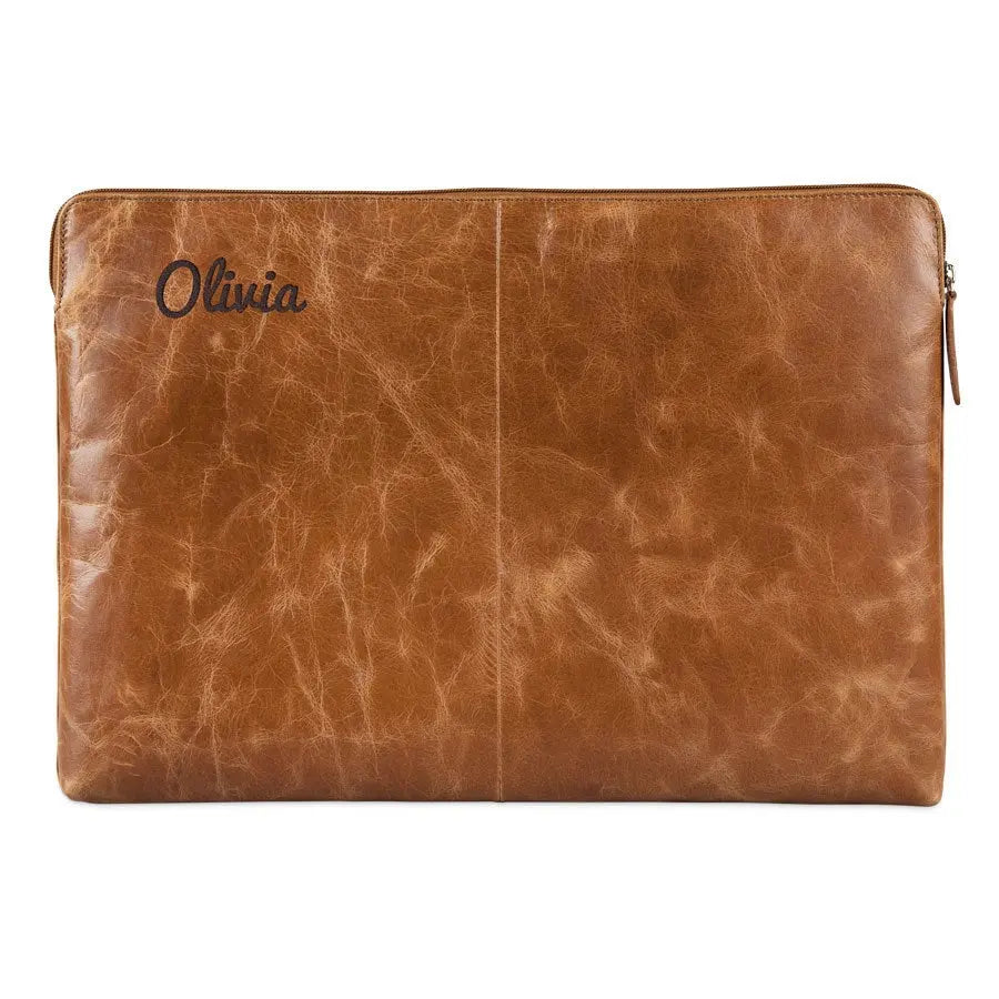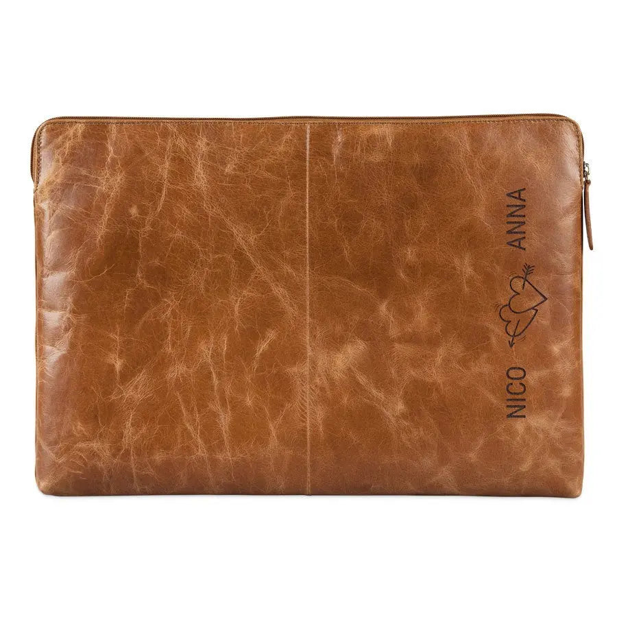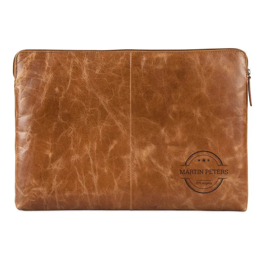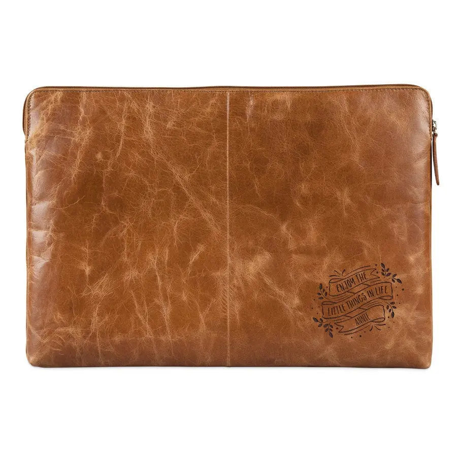 Protect your laptop in a luxury leather laptop sleeve. Unique and personalized with your name or text in a luxury engraving. The finest quality leather!More information on the leather laptop sleeve with engraving:Type: 17 inch Sleeve dimensions: 44 x 31 cm Maximum laptop dimensions: 42 x 29 cmMaterial: Vegetable tanned full grained buffalo leather Finish: With a soft lining for extra protection Color: brown (brandy) Finish: high-quality laser engraving Personalisation: With a name and/or text Extra: Leather is a natural product. This means your gift may differ slightly from the example photo.