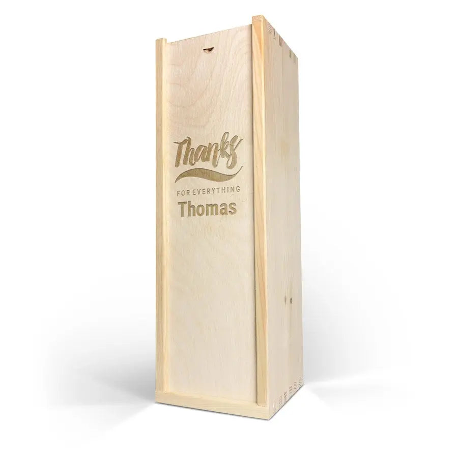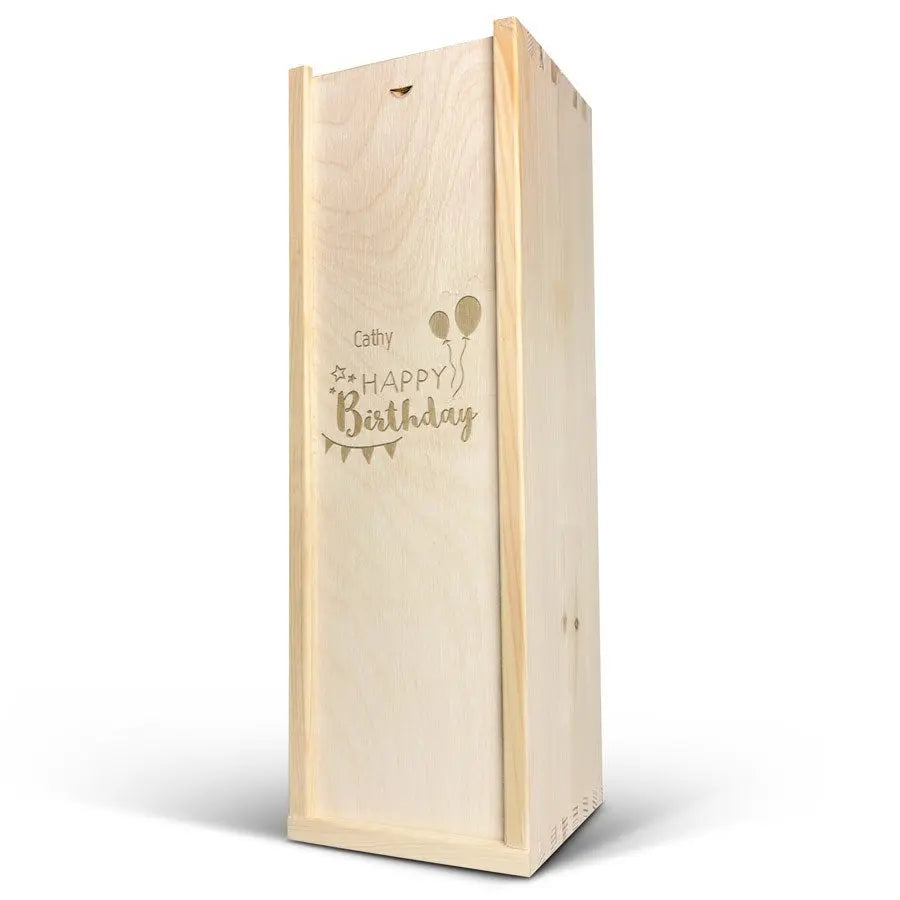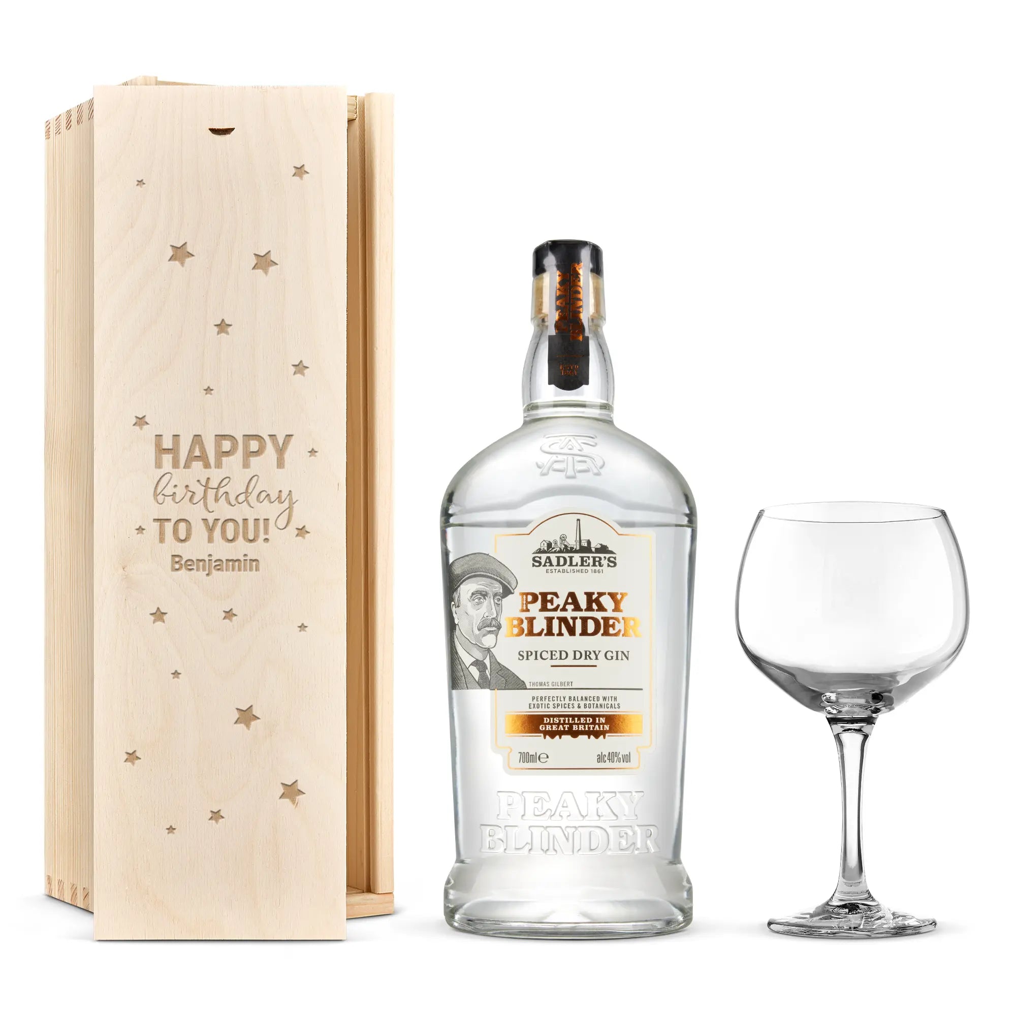 Based on the popular TV show. Who will you surprise with a Peaky Blinders gin set? Including a gin-tonic glass in engraved case.More information on the personalisationPersonalisation: with name or text Personalisation method: high-quality laser glass engravingColour of engraving: brownBox dimensions: 36.5 x 12 x 11 cmExtra: the wooden box is FSC-certifiedMore details on the ginName: Sadler's Peaky BlinderType of gin: dry spicedContents: 700 mlCountry: England Alcohol percentage: 40% Character: Peaky Blinder gin is a dry gin with exotic herbs and spices, such as ginger, black pepper and cassia.