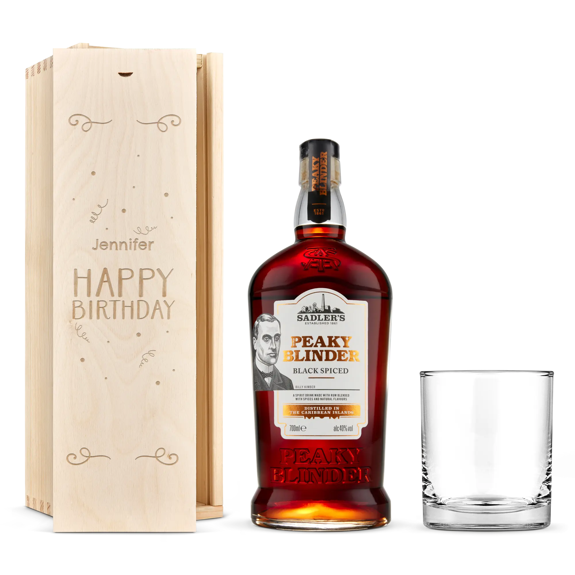 Based on the popular TV show. Who will you surprise with a Peaky Blinders rum set? Including a rum glass in engraved case.More information on the personalisationPersonalisation: with name or text Finish: high-quality laser glass engravingColour of engraving: brownBox dimensions: 36.5 x 12 x 11 cmExtra: the wooden case is FSC-certifiedMore details on the rumName: Sadler's Peaky BlinderType of whisky: black spicedContents: 700 mlCountry: England Alcohol percentage: 40% Character: Peaky Blinder Black Spiced rum is distilled with various spices. With orange and nutmeg aroma's. You will taste delicious notes of clove, vanilla and pineapple.