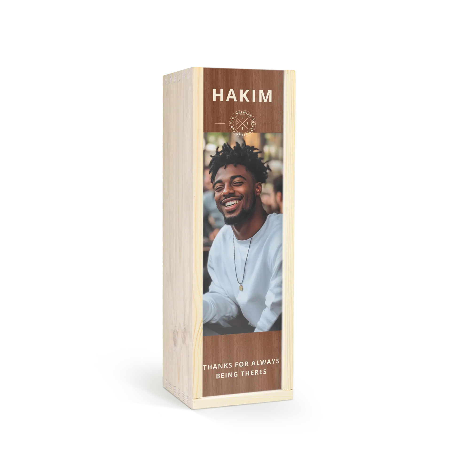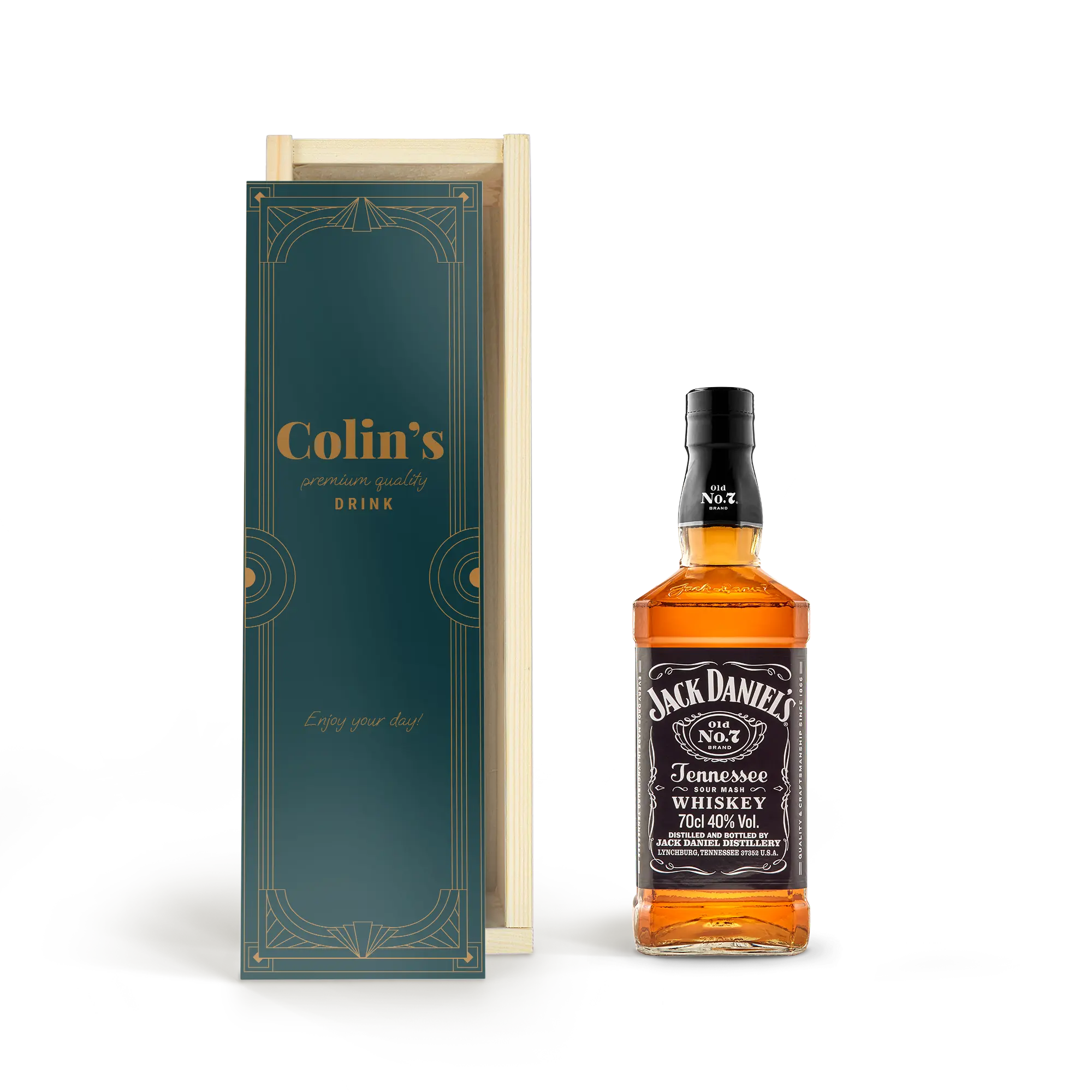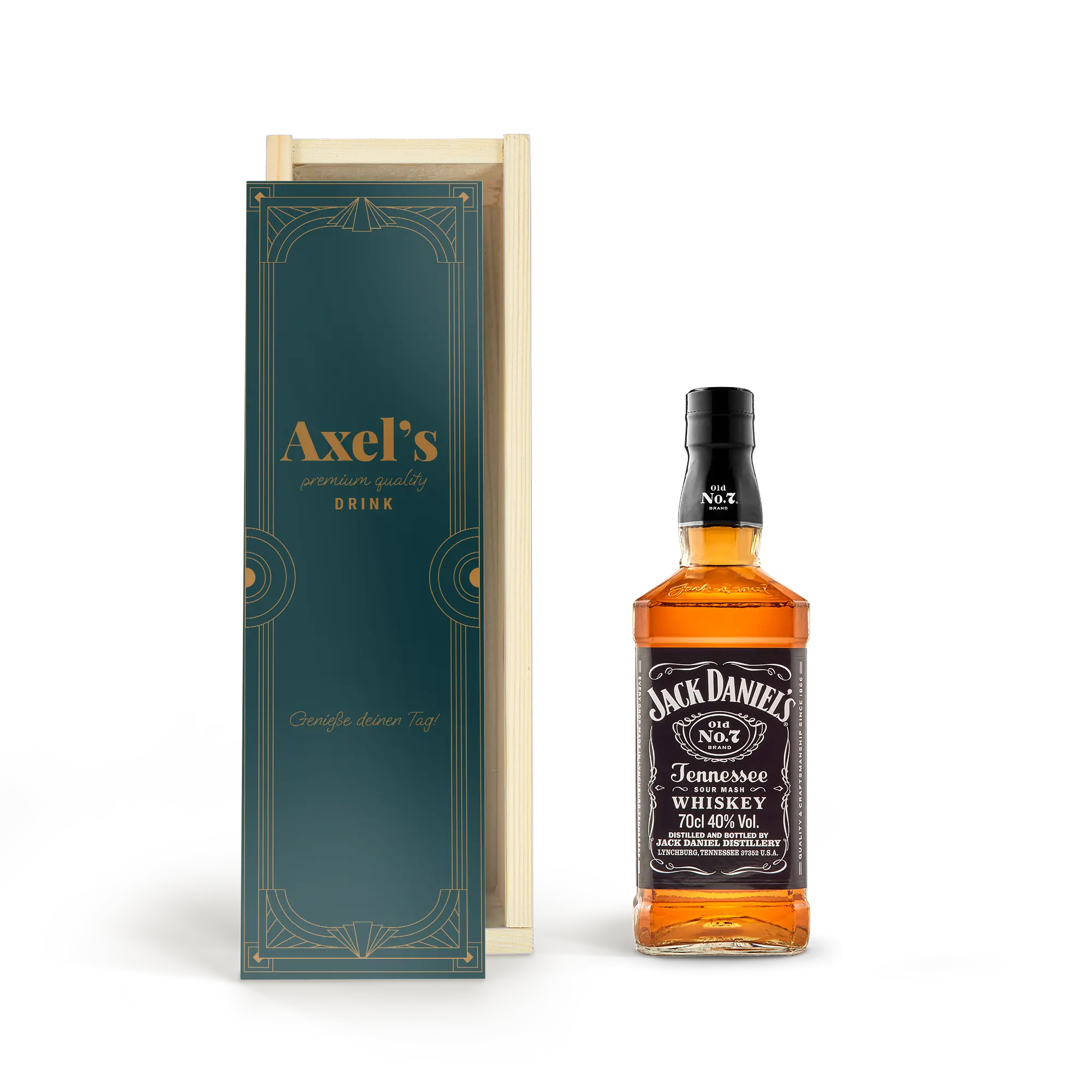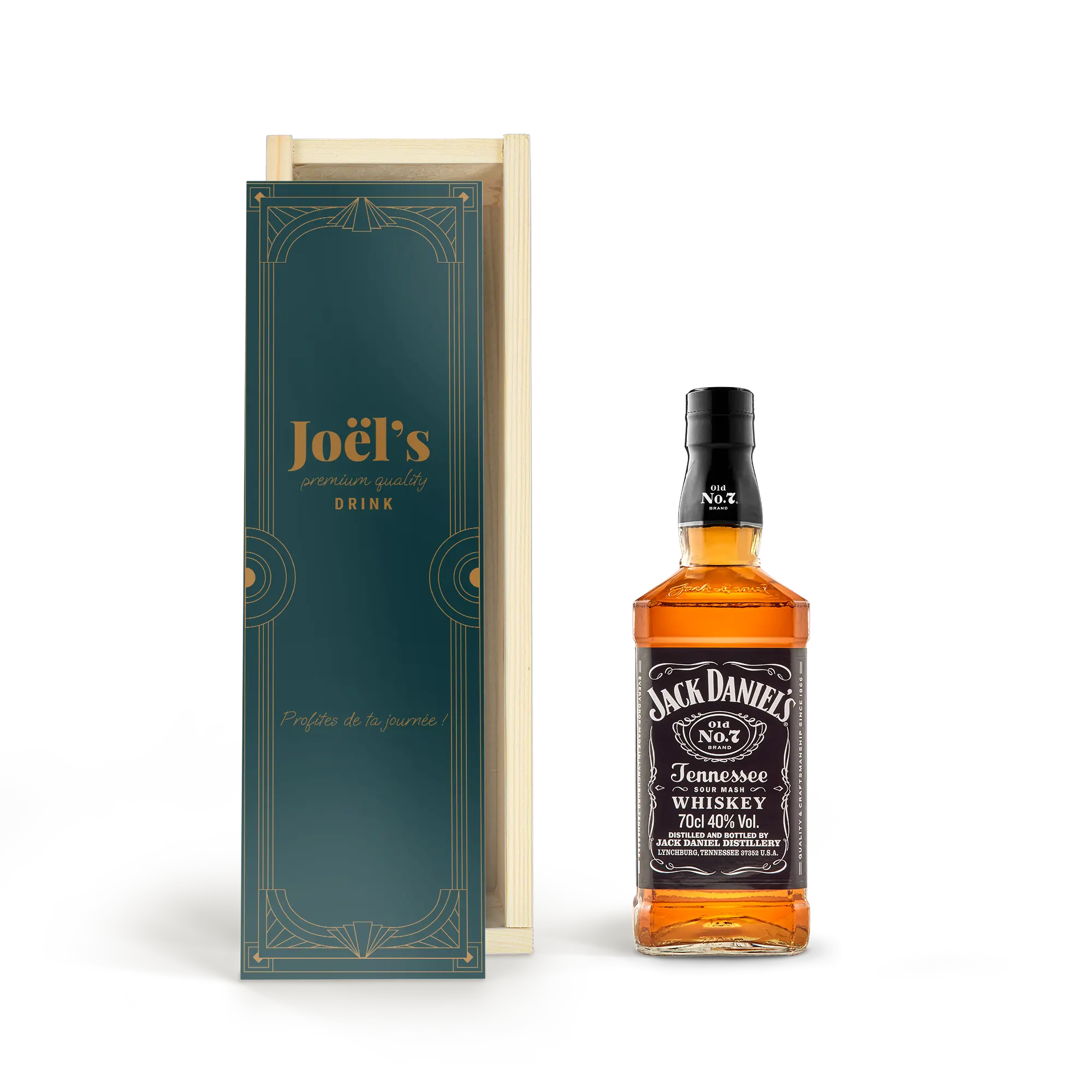 Design your own custom box for this delicious bottle of Jack Daniels whisky. Unique lid with your photo, logo or text. Cheers!More information about the personalisation:Personalisation: on the lid Print: full-colour in HD photo qualityDimensions box: 36,5 x 12 x 11 cmDimensions lid: 35,6 x 10,2 x 0,3 cm Extra: the wooden box is FSC certifiedMore information about this whisky:Name: Jack DanielsCountry of origin: AmericaContent: 0,7 lAlcohol percentage: 40%Characteristics: Jack Daniels Tennessee whisky has a light fruity mix of caramel, vanilla, spices and roasted oak.