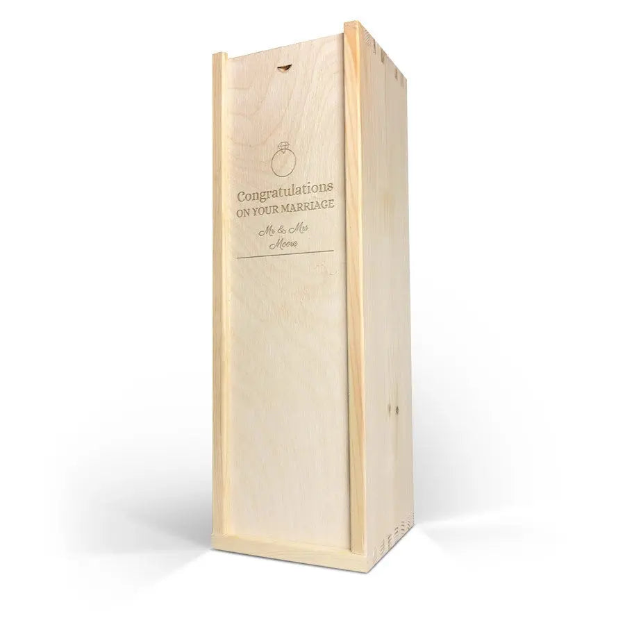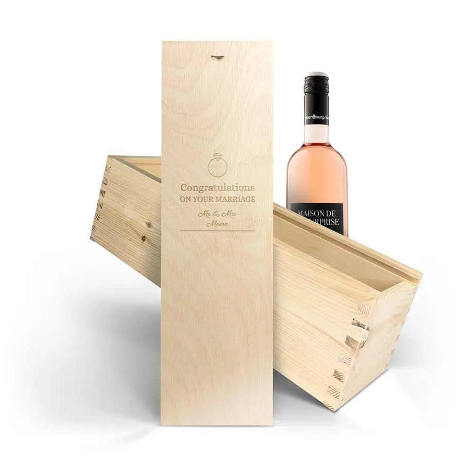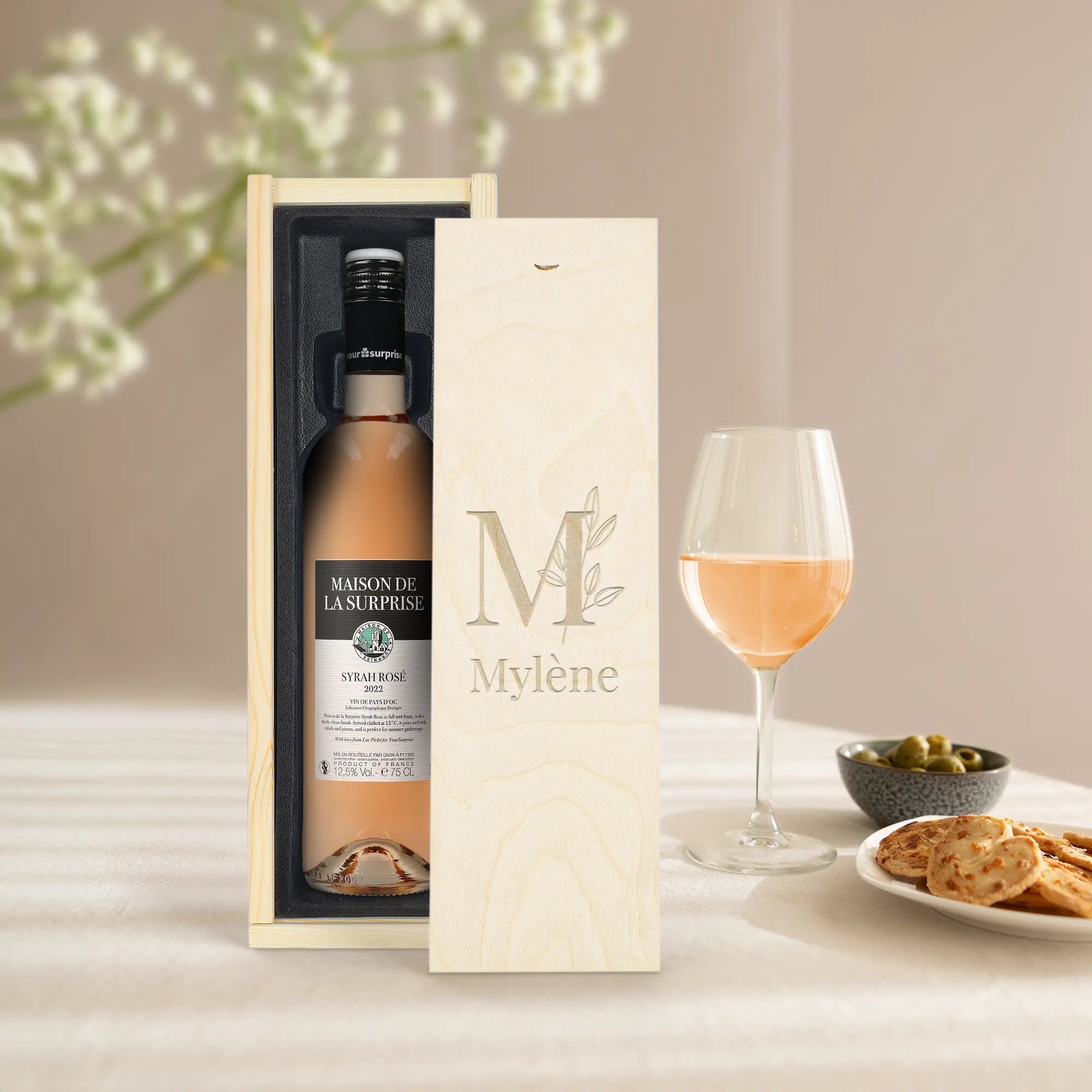 Delicious Maison de la Surprise wine in deluxe wooden case featuring the name and/or text of your choice. Create yours now!More information on the deluxe wooden case:Personalisation: with name and/or textPersonalisation placement: on wooden case lidPersonalisation method: high-quality laser-engravingCase dimensions: 36.5 x 12 x 11 cmLid dimensions: 35.6 x 10.2 x 0.3 cmAdditional information: the deluxe wooden case is made with FSC-certified woodMore information on the wine:Brand: Maison de la SurpriseType: roséContents: 750 mlCountry of origin: FranceGrape: SyrahCharacter: Maison de la Surprise Syrah has notes of red fruit, raspberries and wild strawberries. Pairs well with light meals.