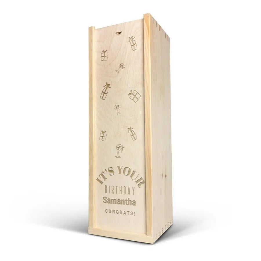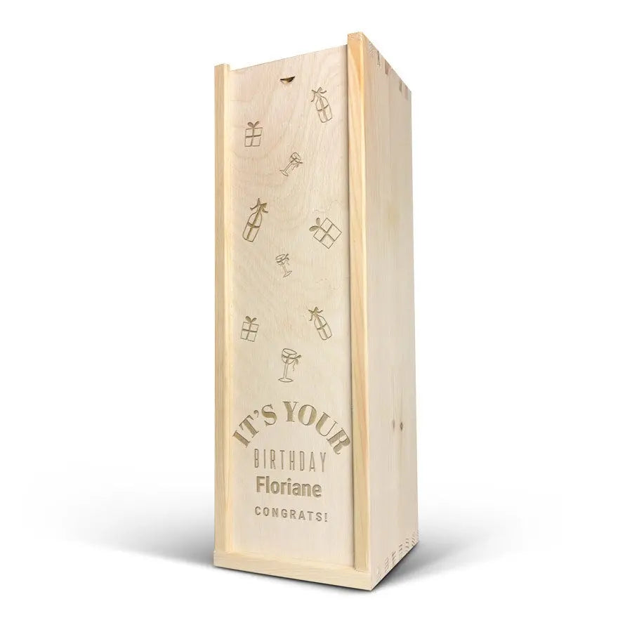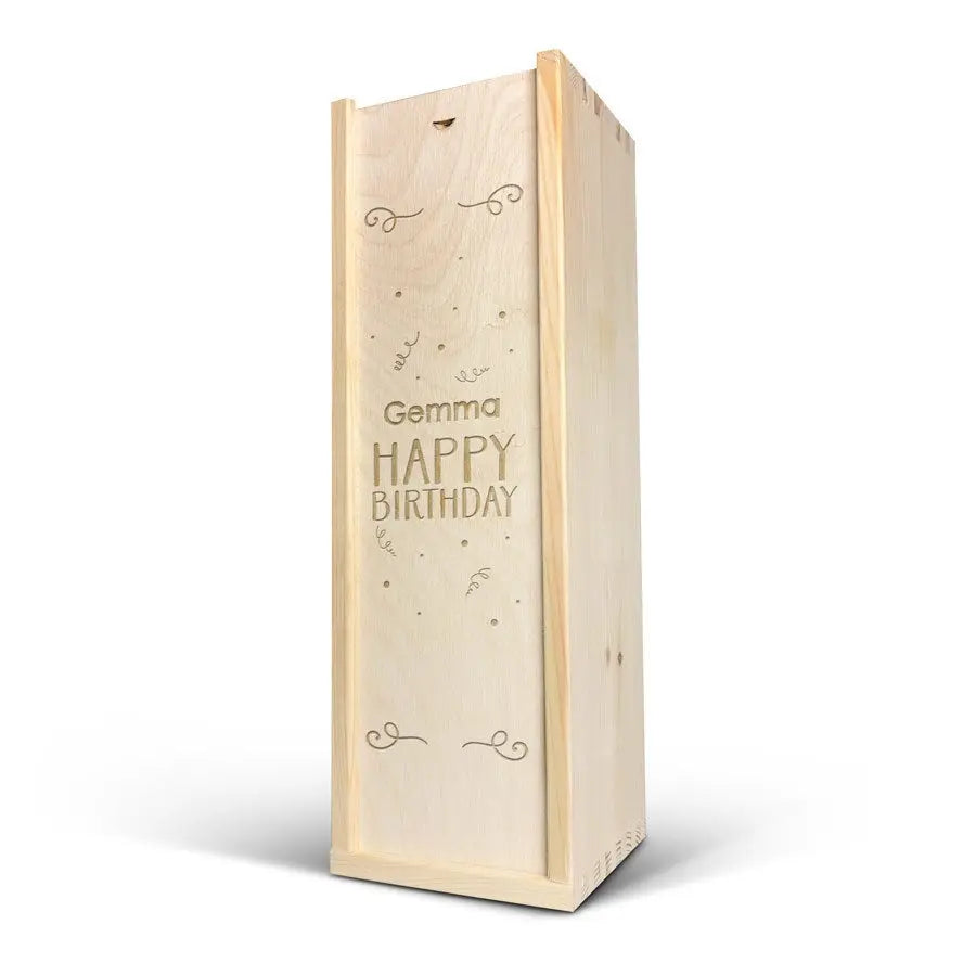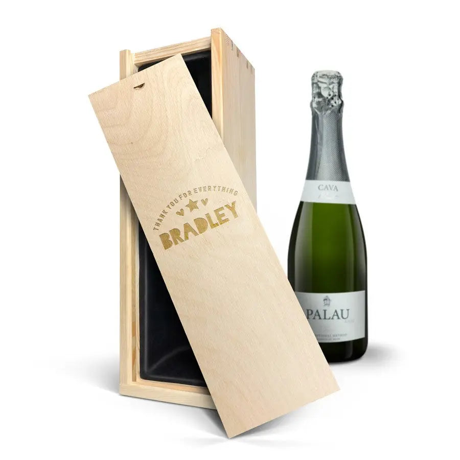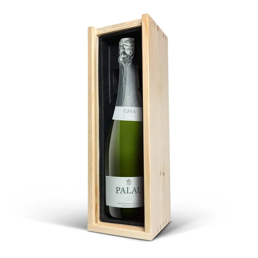 A delicious bottle of Cava Palau Gazo sparkling wine in engraved case. Personalise as you wish with your text in a unique design!More information on the luxurious wine case:Personalisation: with name or textPersonalisation placement: on the wooden case lidPersonalisation method: high-quality laser-engravingCase dimensions: 36.5 x 12 x 11 cmLid dimensions: 35.6 x 10.5 x 0.3 cmExtra: the wooden case is FSC-certifiedMore information on the sparkling wine:Brand: Palau GazoType: cavaContents: 750 mlCountry of origin: SpainGrape: Parellada, Macabeo and Xarel-LoCharacter: Fine bubbles, fruity with aromas of green apple. A soft, round aftertaste. Perfect for parties