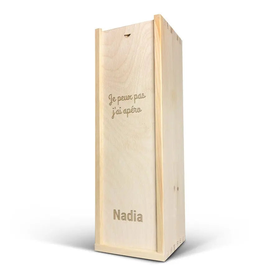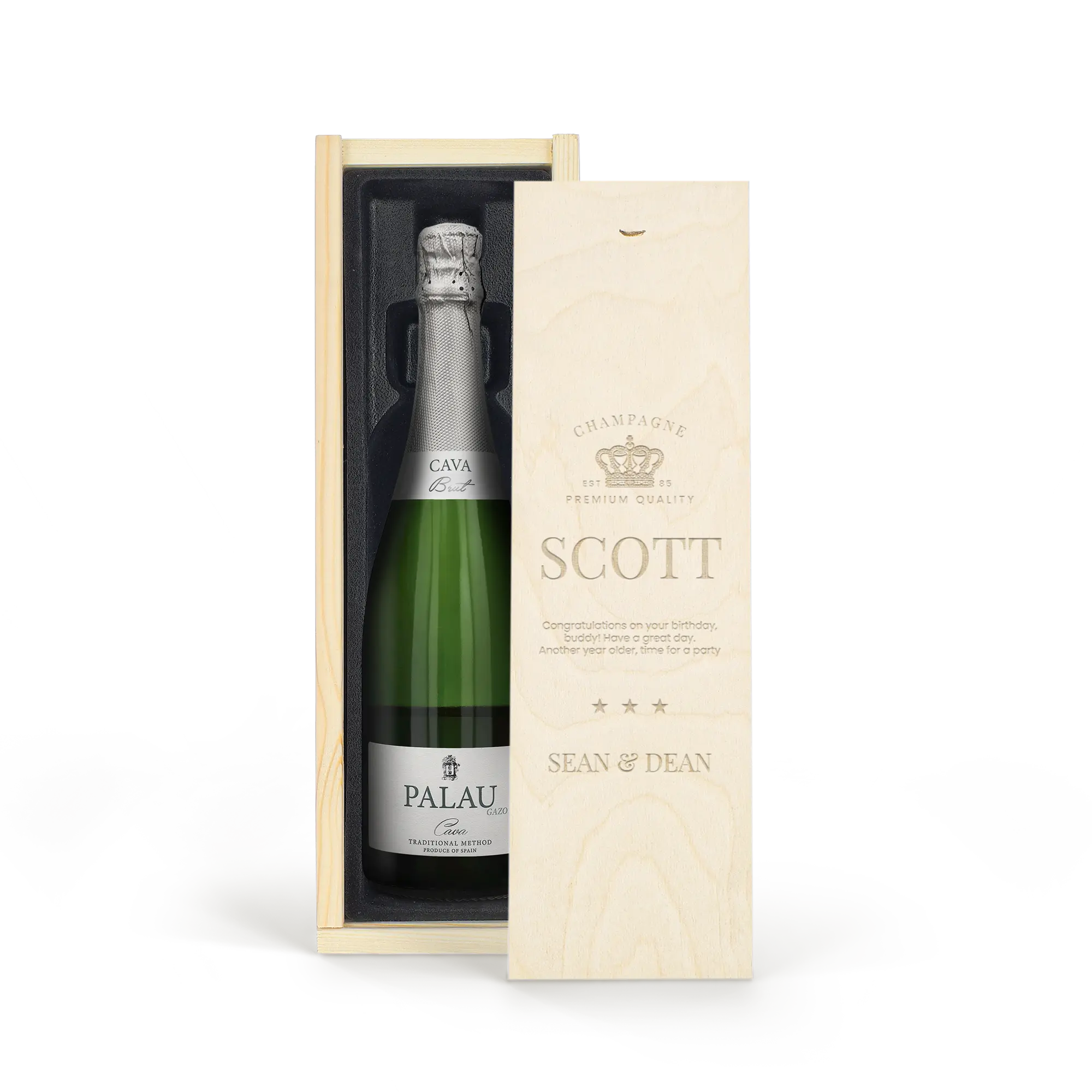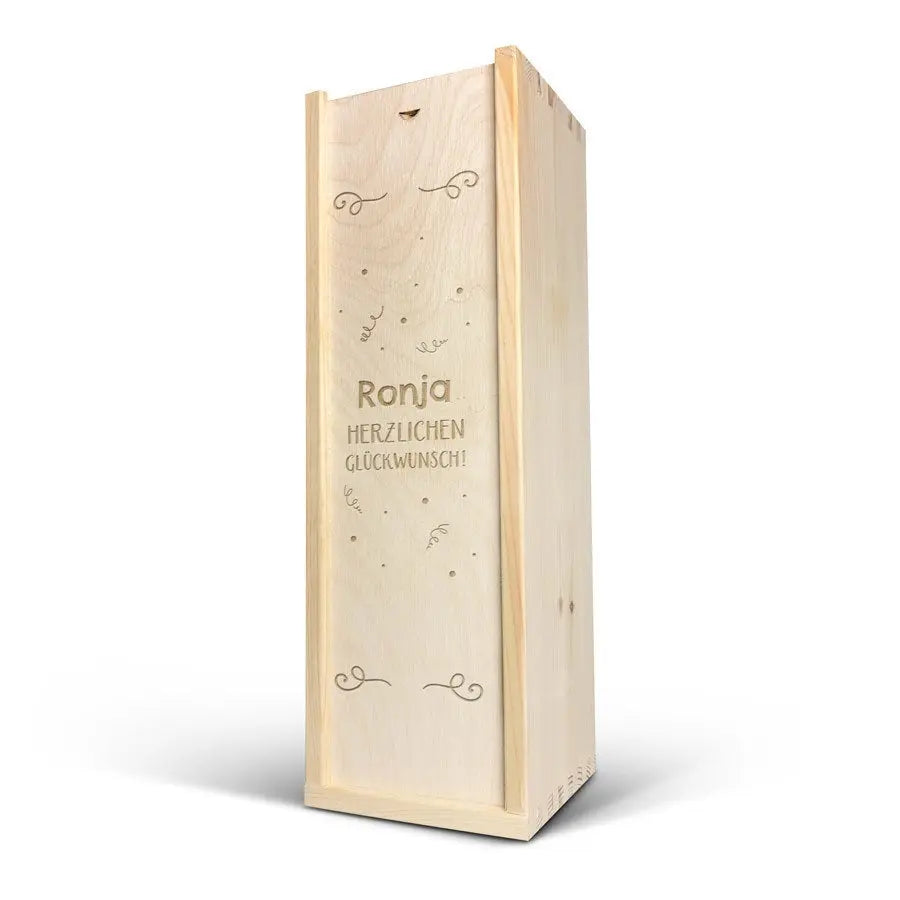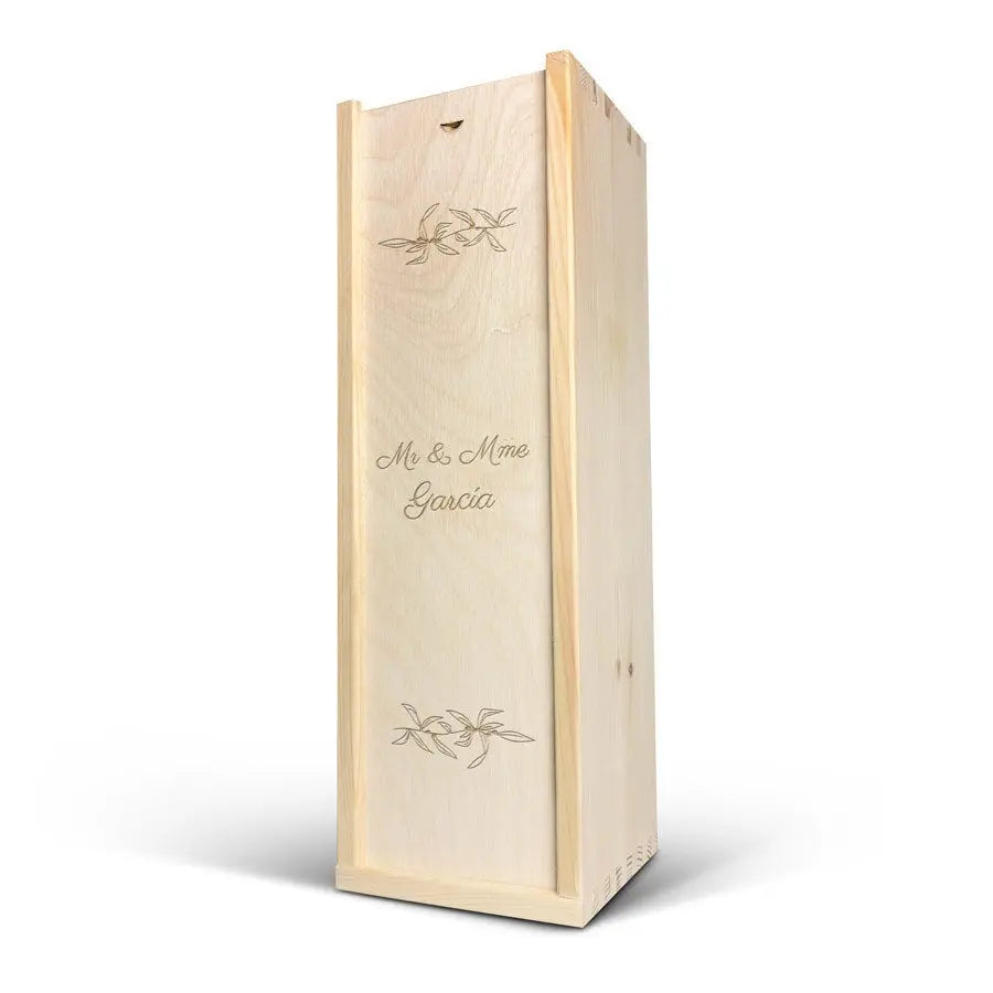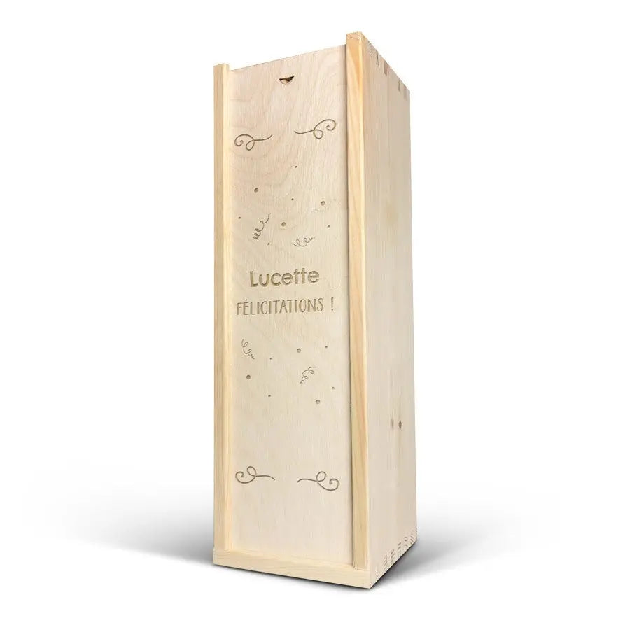 A delicious bottle of Cava Palau Gazo sparkling wine in engraved case. Personalise as you wish with your text in a unique design!More information on the luxurious wine case:Personalisation: with name or textPersonalisation placement: on the wooden case lidPersonalisation method: high-quality laser-engravingCase dimensions: 36.5 x 12 x 11 cmLid dimensions: 35.6 x 10.5 x 0.3 cmExtra: the wooden case is FSC-certifiedMore information on the sparkling wine:Brand: Palau GazoType: cavaContents: 750 mlCountry of origin: SpainGrape: Parellada, Macabeo and Xarel-LoCharacter: Fine bubbles, fruity with aromas of green apple. A soft, round aftertaste. Perfect for parties