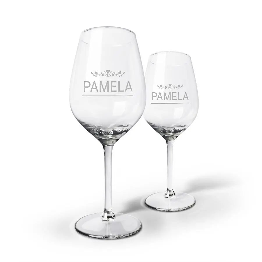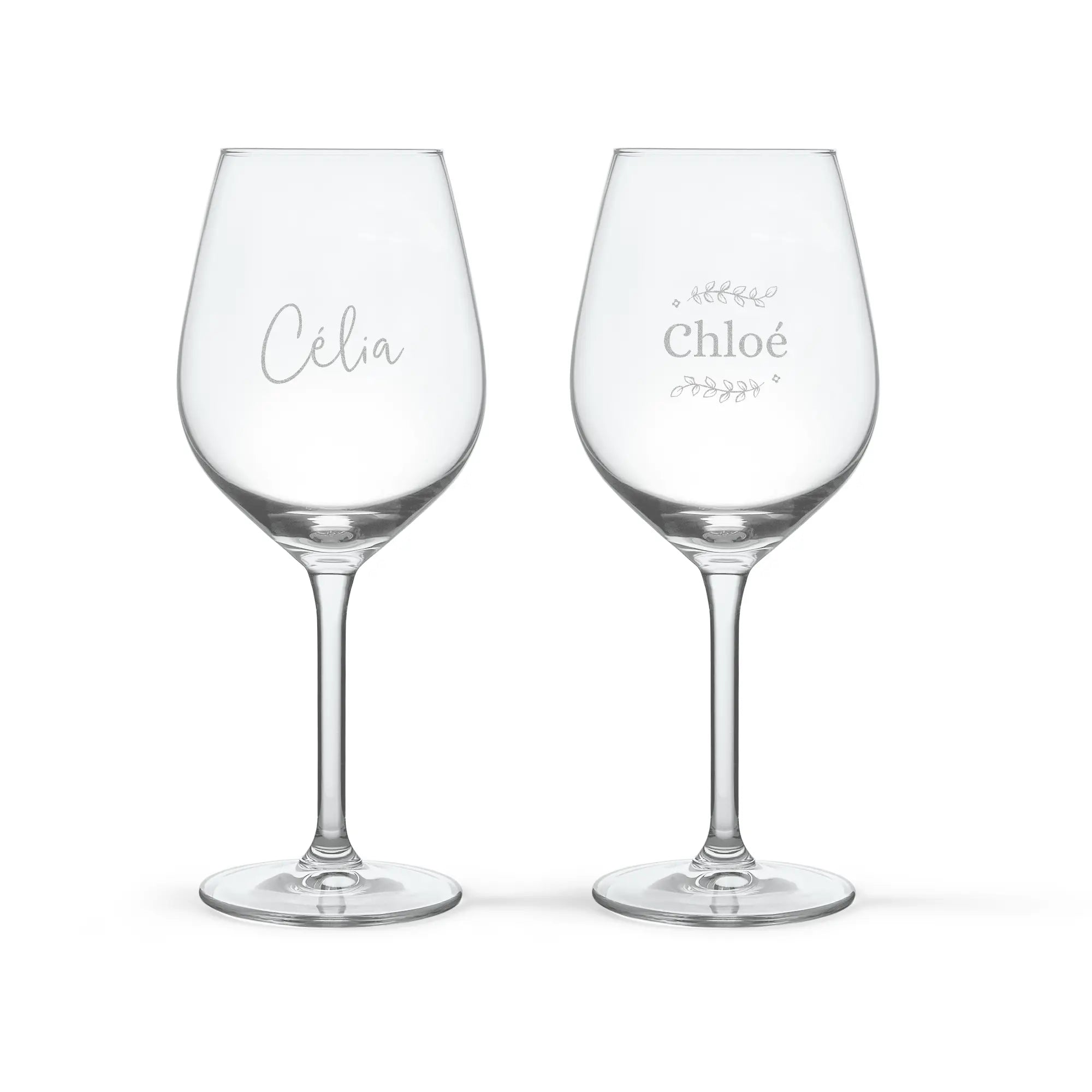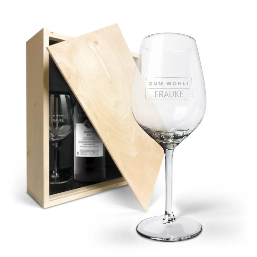 Delicious Maison de la Surprise wine in a deluxe wooden case, with 2 engraved wine glasses featuring the name and/or text of your choice.More information on the wine glasses:Quantity: 2Brand: Royal LeerdamDimensions: 20.5 x 8.5 x 8.5 cmHeight: 20.5 cmCapacity: 370 mlPersonalisation: with name and/or textPersonalisation method: high-quality laser-engravingPersonalisation placement: on one side of each glassMore information on the deluxe wooden case:Case dimensions: 36.5 x 30.6 x 11 cmLid dimensions: 35.6 x 28.4 x 0.3 cmAdditional information: The wooden case is made of FSC-certified woodMore information on the wine:Brand: Maison de la SurpriseContents: 750 mlCountry of origin: FranceType: redGrape: MerlotCharacter: Maison de la Surprise Merlot has notes of red fruit and a hint of vanilla. Pairs well with poultry and roasted meat.