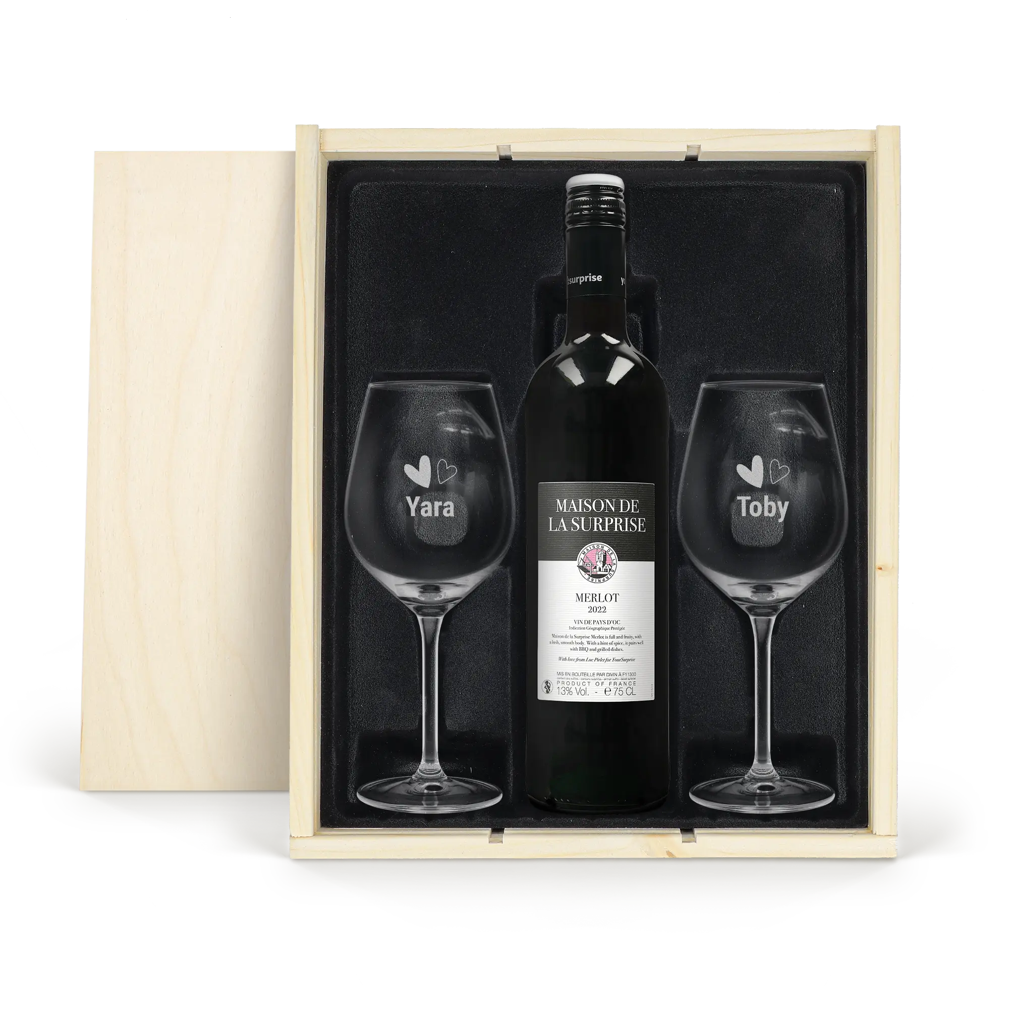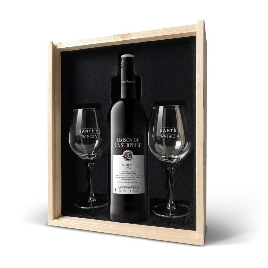 Wine gift set with glasses - Maison de la Surprise Merlot - Engraved glasses