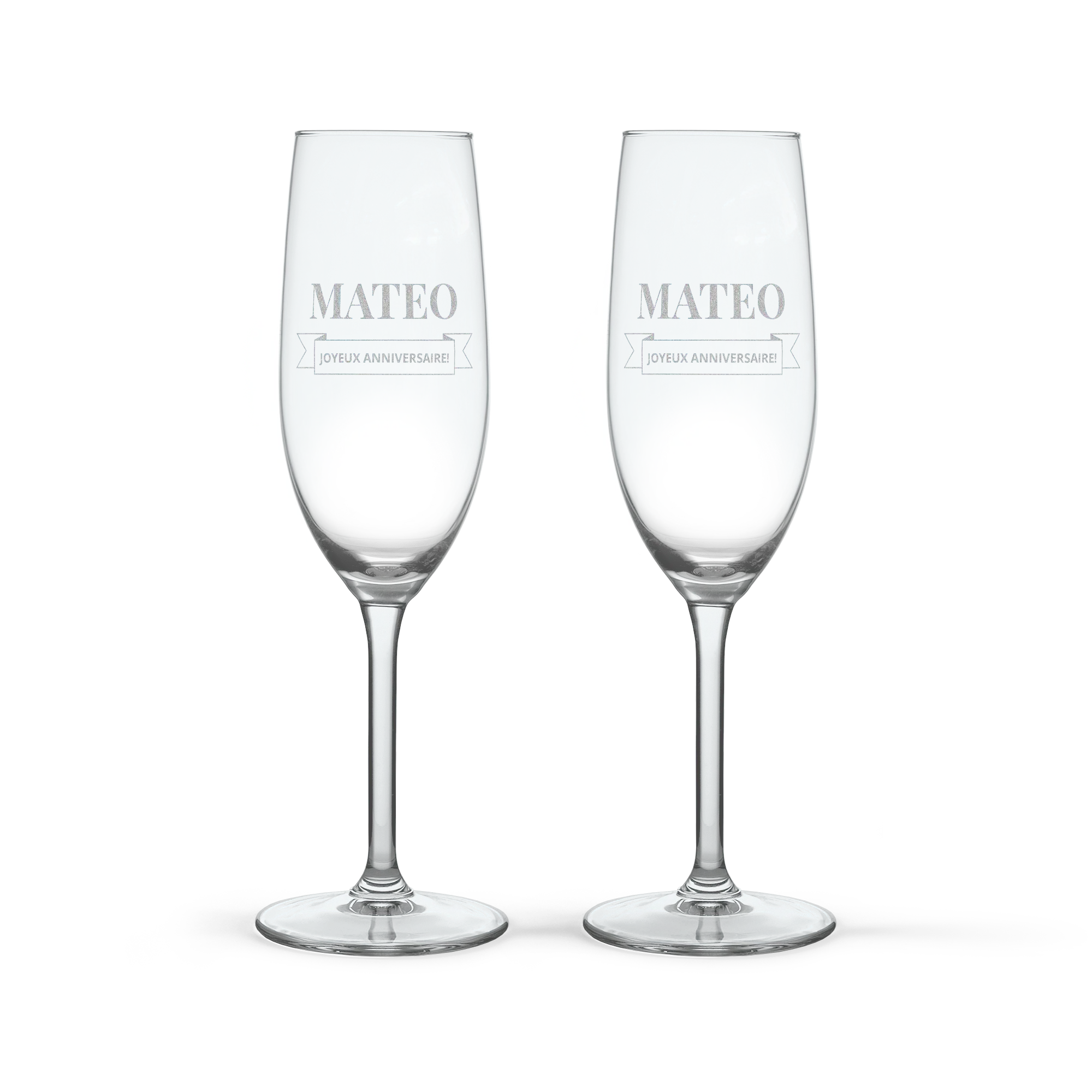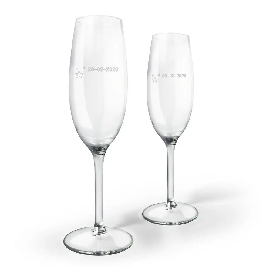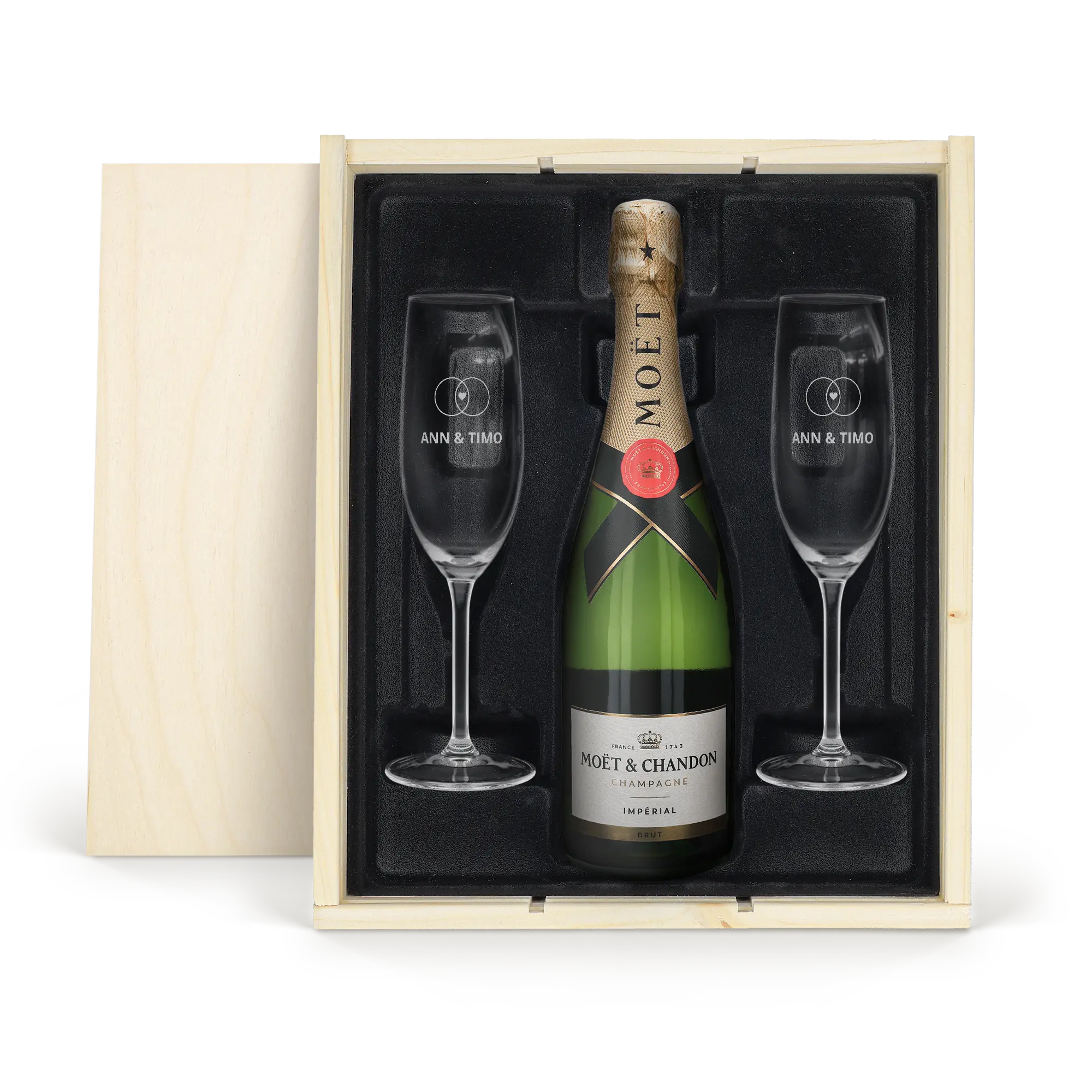 A delicious bottle of Moët et Chandon champagne with two engraved glasses. In luxury wooden gift box, the perfect champagne gift. Cheers!More information about the champagne glasses: Amount: 2 glassesBrand: Royal LeerdamModel: L'EspritDiameter: 6,5cmHeight: 21,5cmCapacity: 21clPersonalisation: with text or nameExtra: dishwasher-safe More information about the wooden box: Dimensions of the case: 36,5 x 30,6 x 11 cmDimensions of the lid: 35,6 x 28,4 x 0,3 cmThe wood used for the case is FSC certifiedMore information about this champagne:Country: FranceType: imperialVolume: 750 ml Bottle height: 32 cmBottle diameter: 8.5 cmGrape: dryCharacter: An excellent well known champagne from the largest champagne label in the world. This brut champagne is easily the world’s best selling champagne! Moët appeals to every champagne lover. Constant high quality, soft, fresh and well balanced. Now you know why they keep the blend of this success a secret.