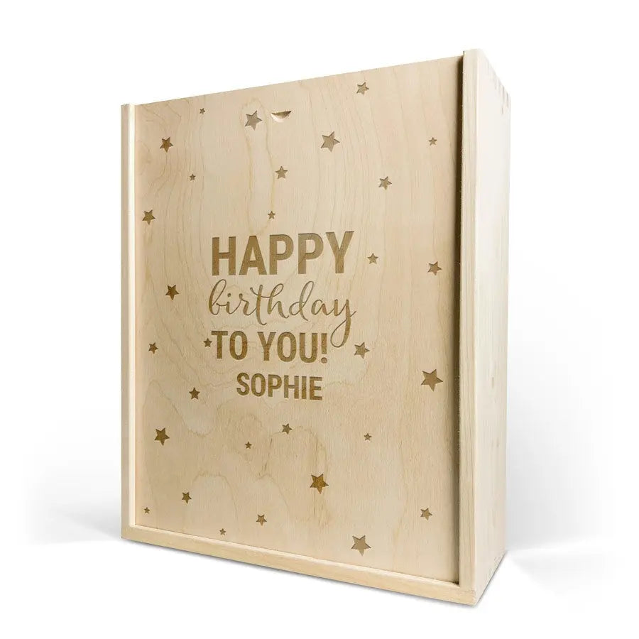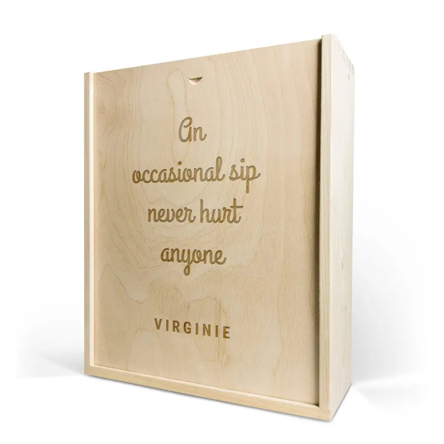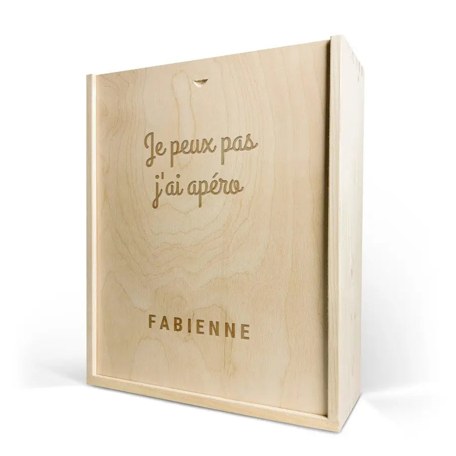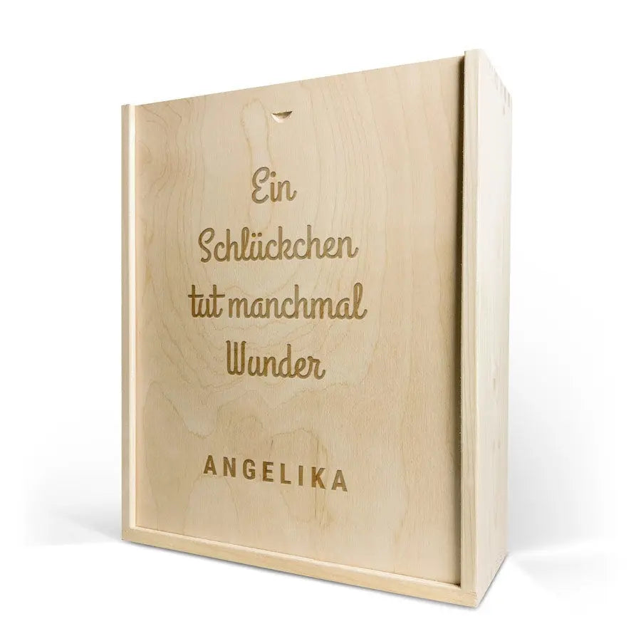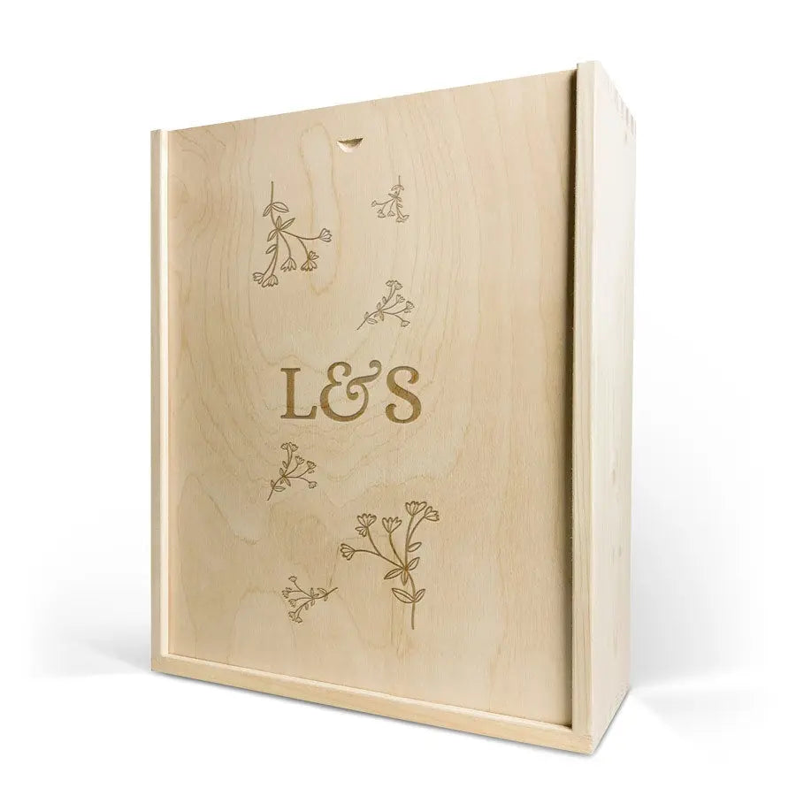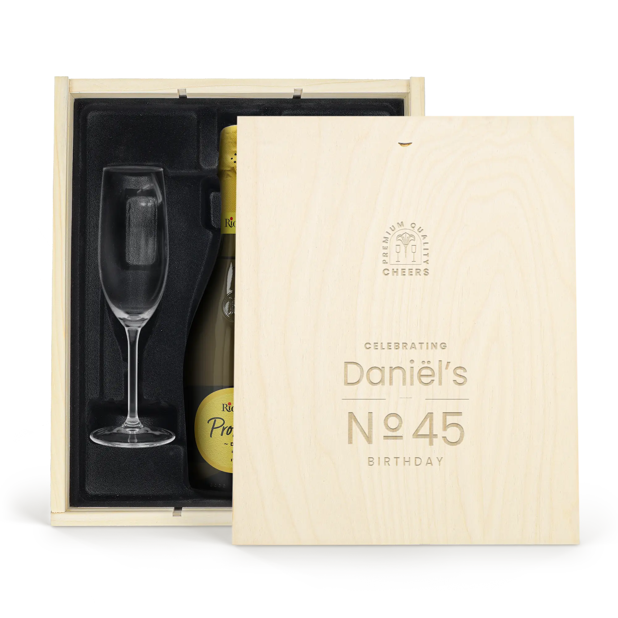 A delicious bottle of wine in luxurious engraved case. Featuring the name and/or text of your choice!More information on the champagne glasses:Quantity: 2 glassesBrand: Royal LeerdamType: L' EspritHeight: 21.5 cmCapacity: 21 clMore information on the luxurious wooden case:Personalisation: with name and/or textPersonalisation placement: on the lidPersonalisation method: high-quality engravingCase dimensions: 36.5 x 12 x 11 cmLid dimensions: 35.6 x 10.2 x 0.3 cmThe wooden case is made with FSC-certified wood.More information on the wine:Brand: Riondo Prosecco SpumanteType: prosecco, extra dryContents: 750 mlCountry of origin: ItalyGrape: chardonnay, gleraCharacter: Riondo Prosecco Spumante has aromas of pear, apple, sweets and white flowers. Pairs well with shrimp and savory tapas.