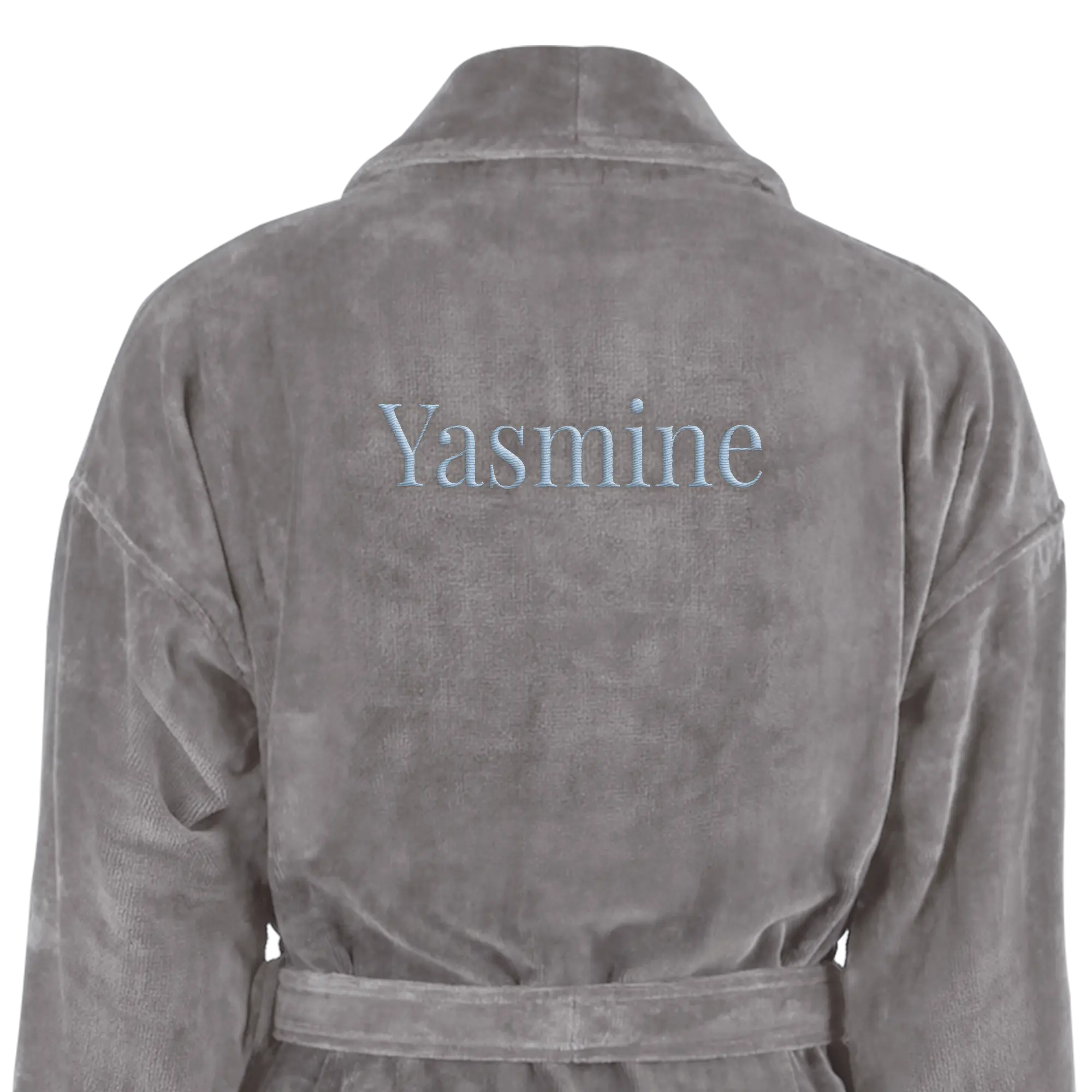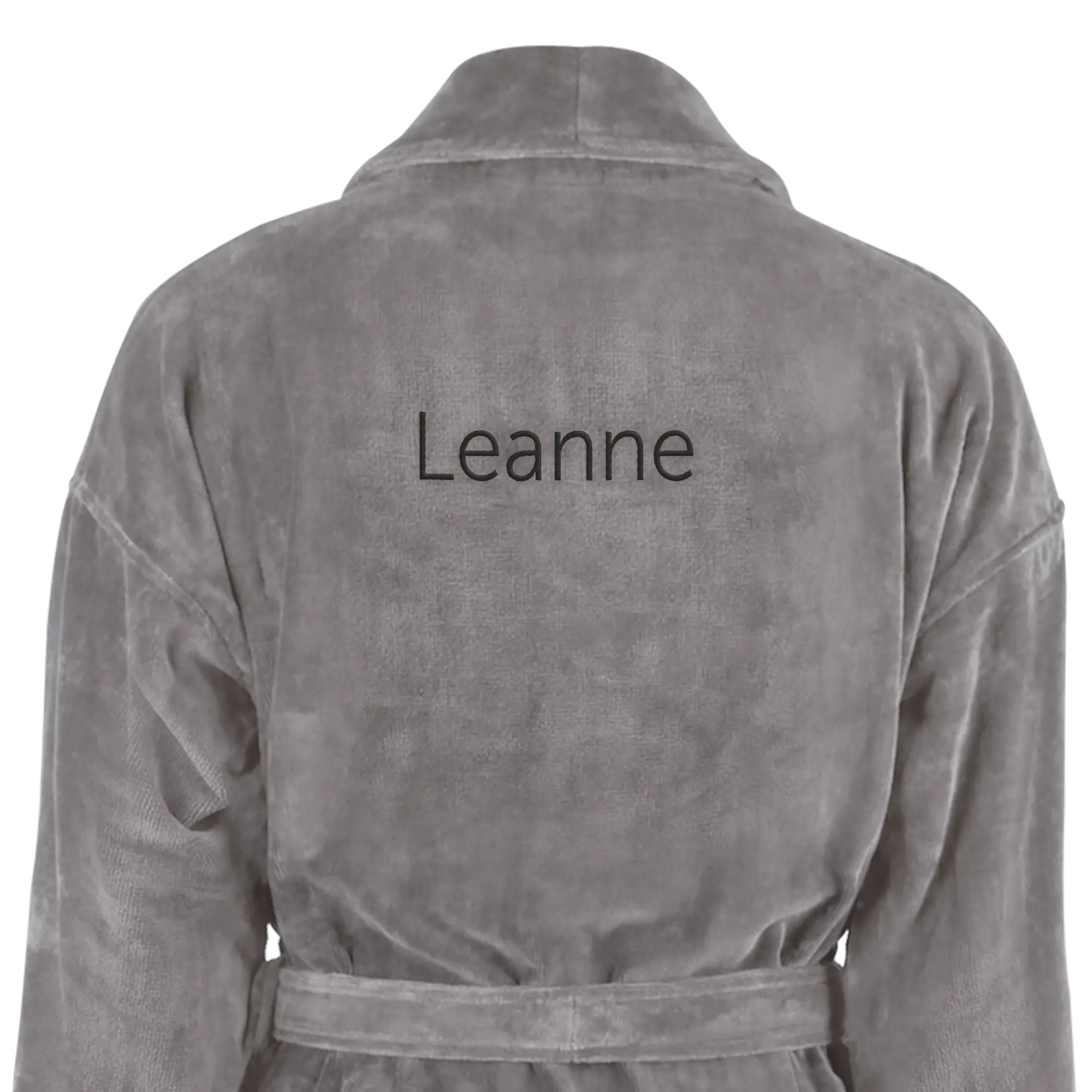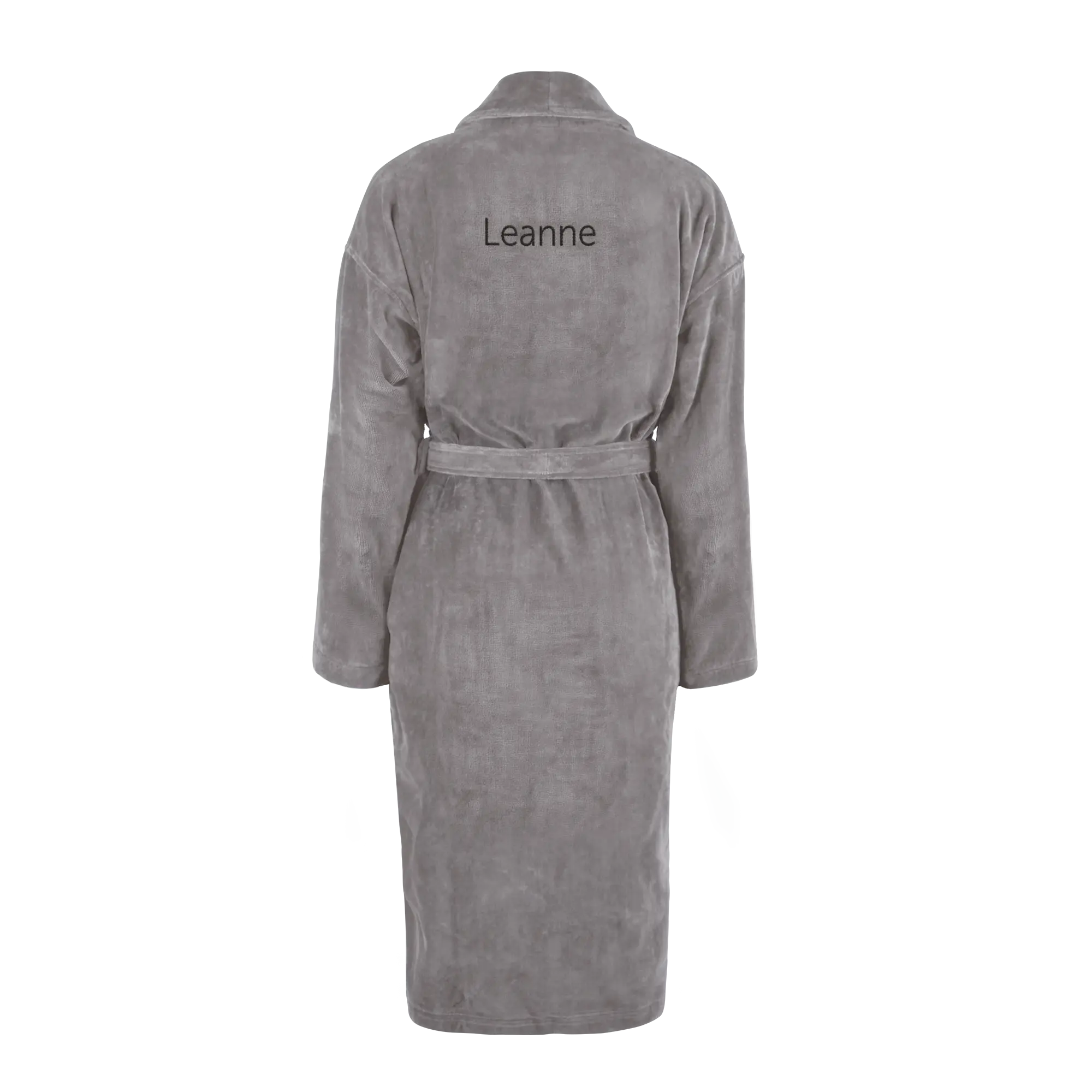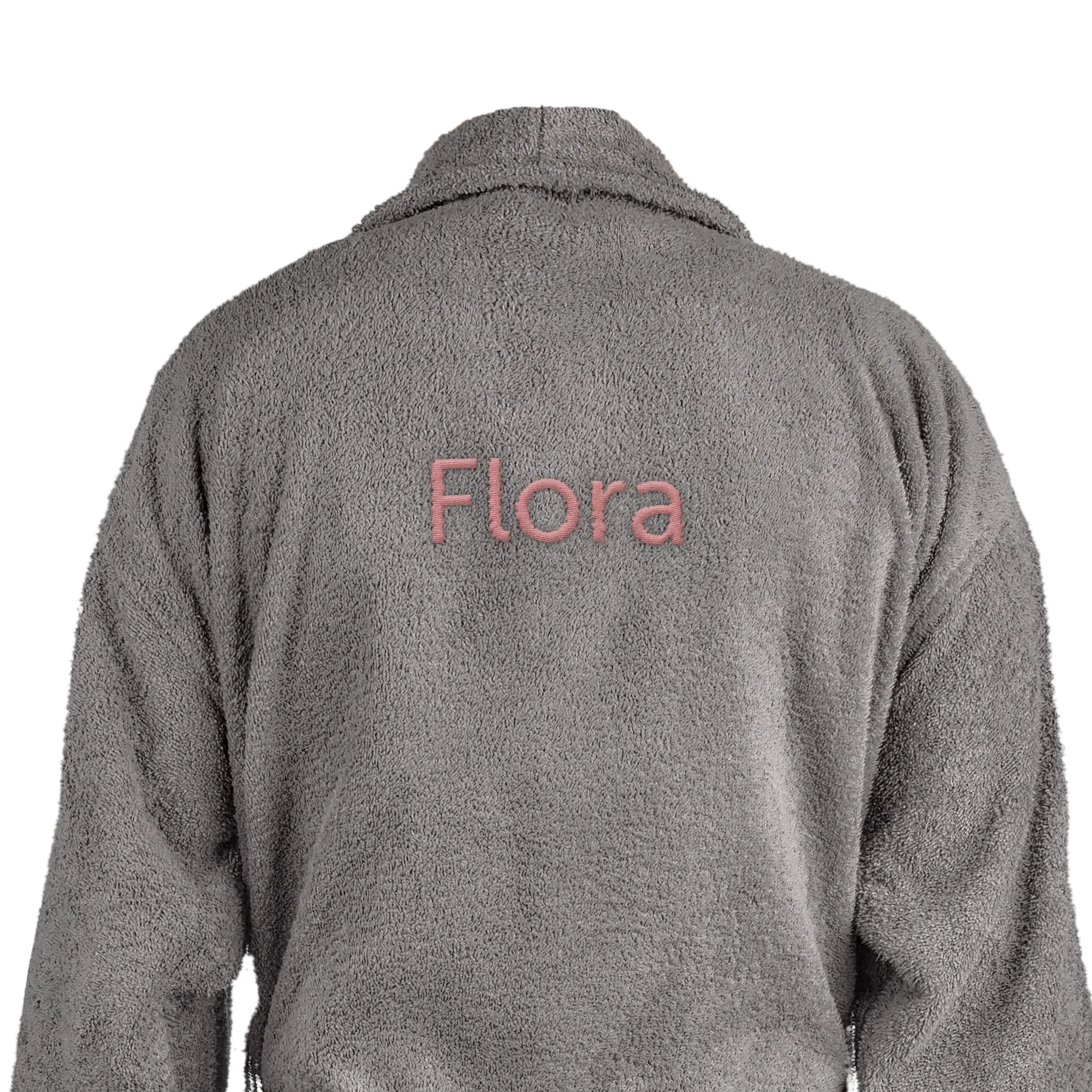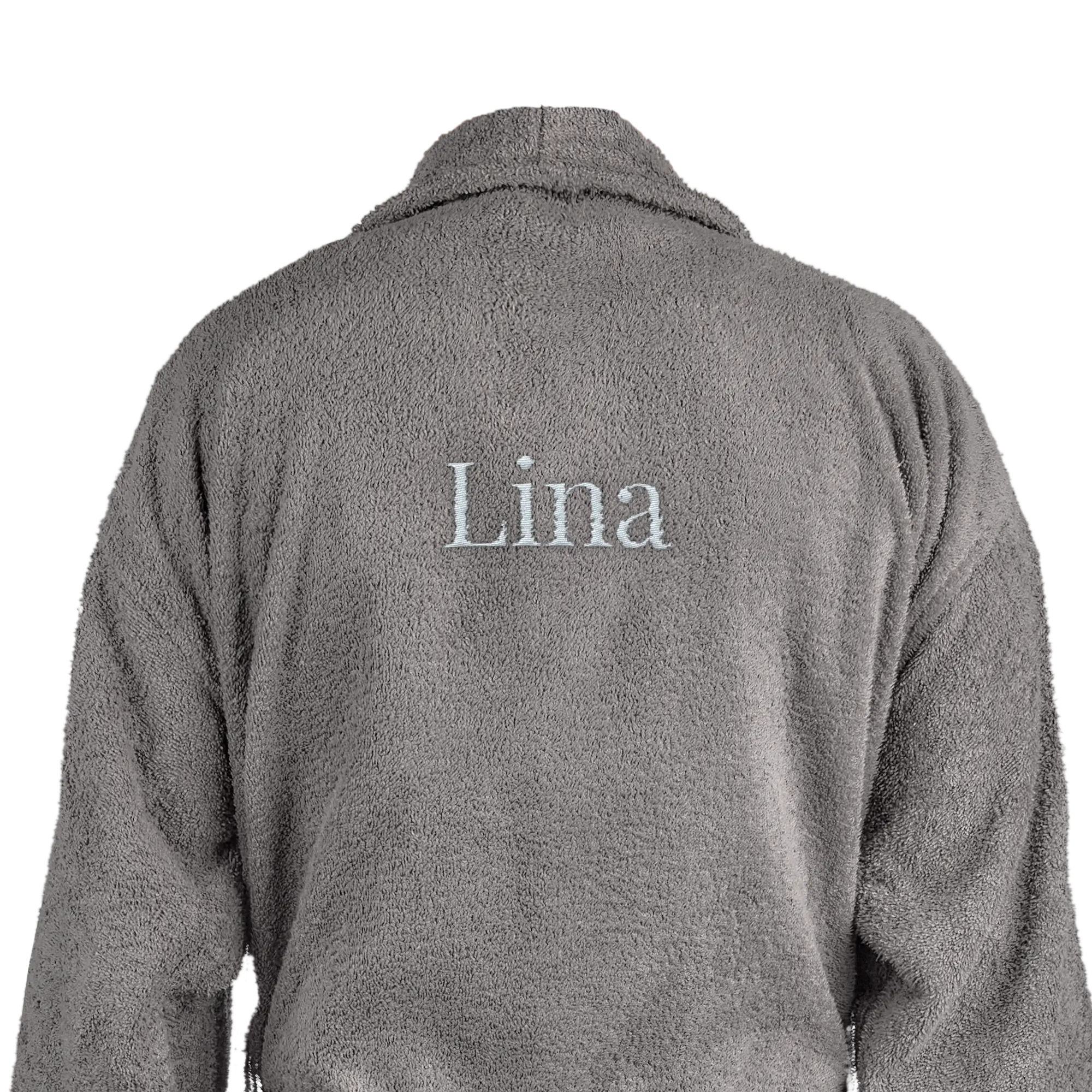 A very soft and original bathrobe embroidered with your own text or name! A classic bathrobe for women made of 100% cotton terry cloth.More information on the bathrobe:Colour: grey Model: Classic Material: 100% cotton terry cloth (380 g/m2) Size: L/XL Height: 120 cm Width: 65 cm Sleeve length: 56 cm Shoulder width: 21 cm Print: one textline: 7x10cm (HxW) Antistatic and breathable Washing Instructions:. Wash at max 60 degrees.