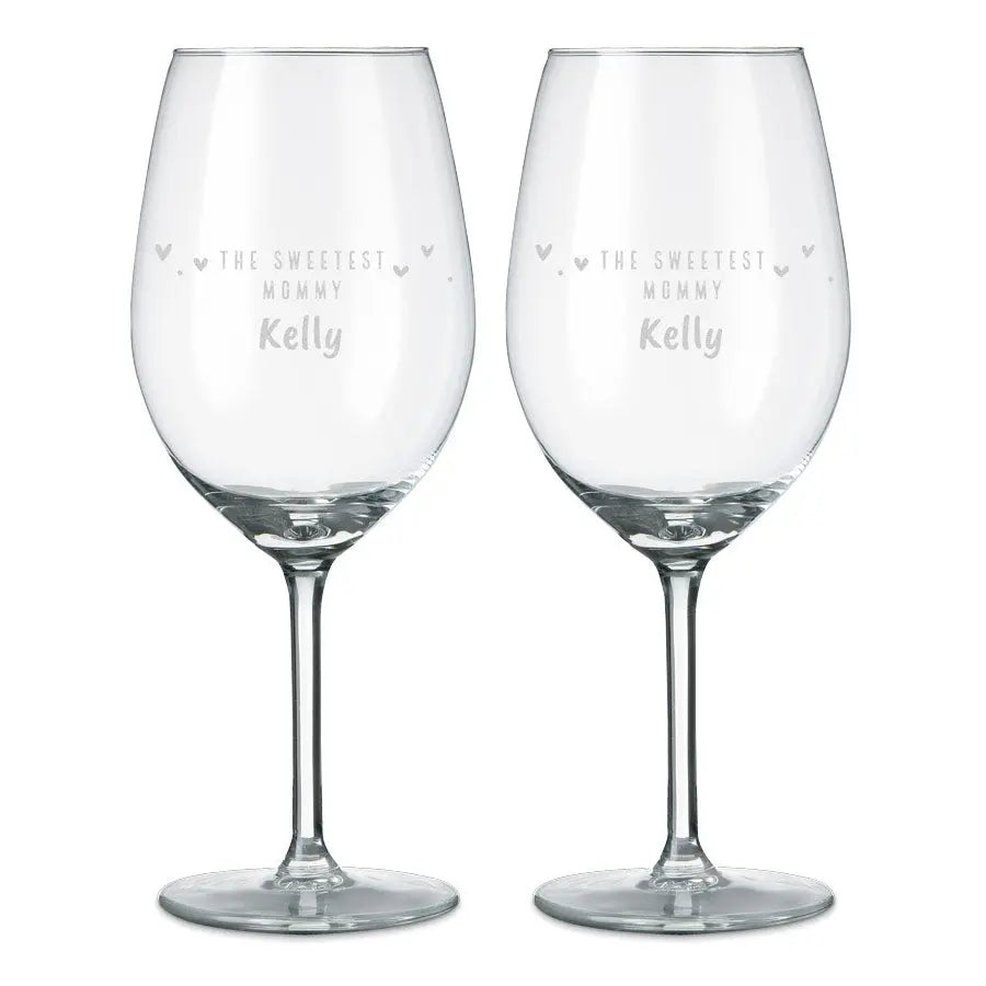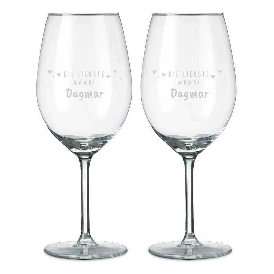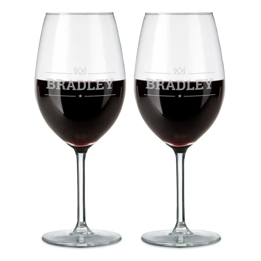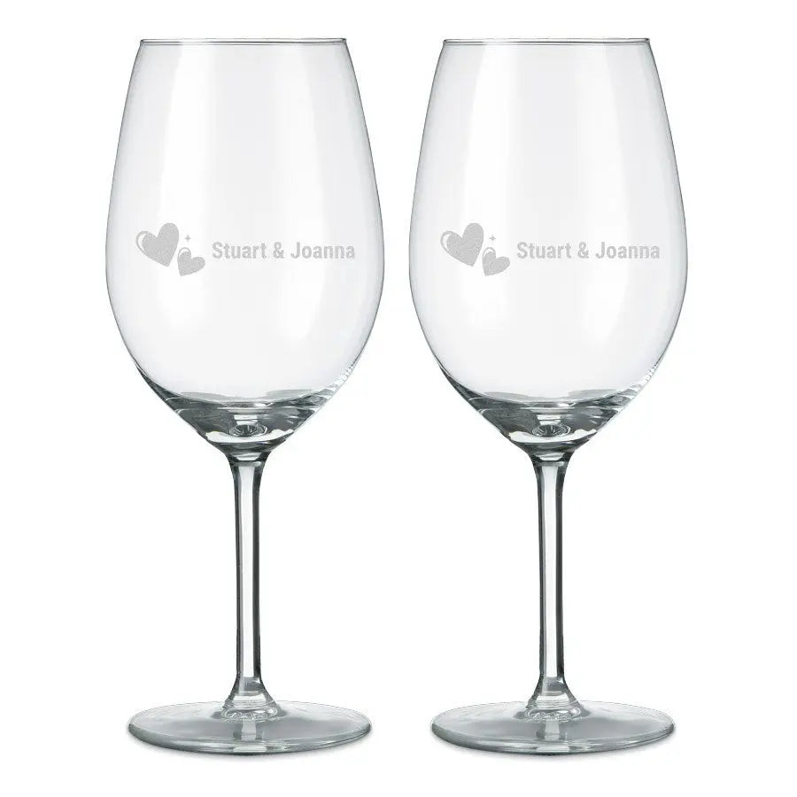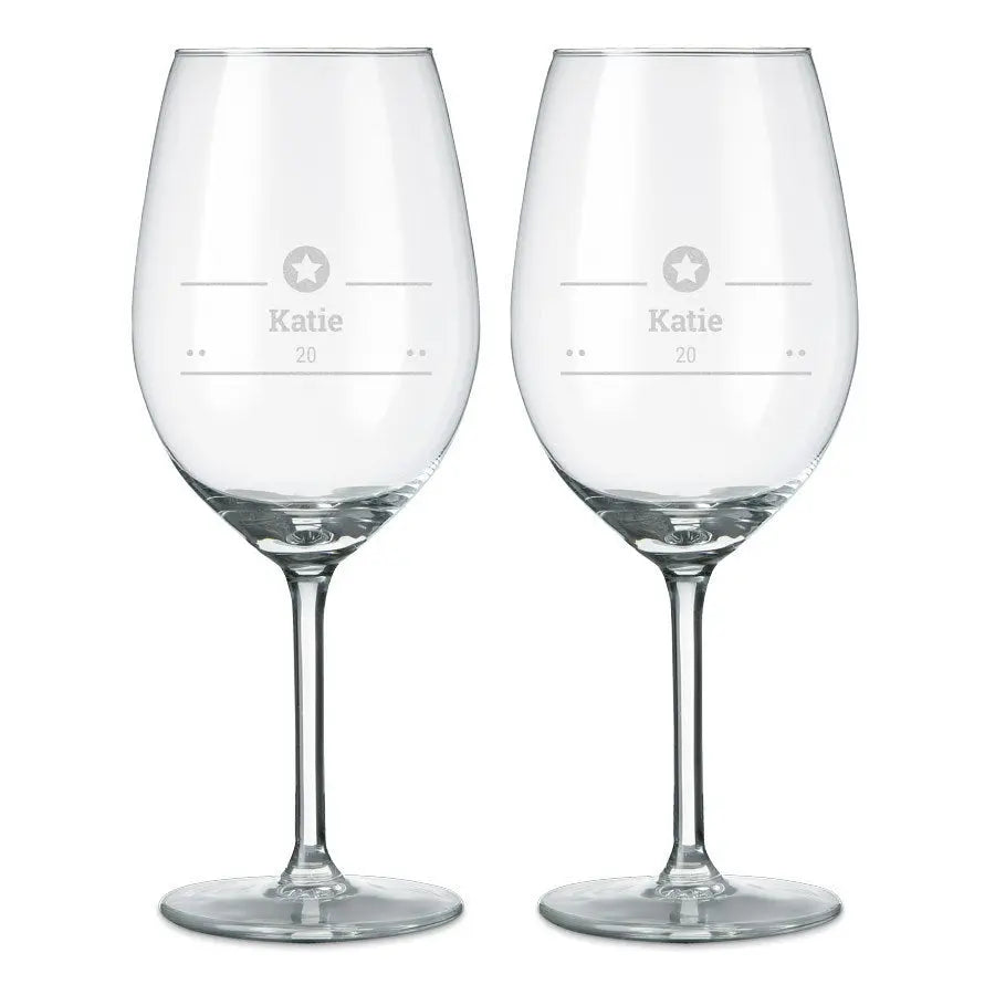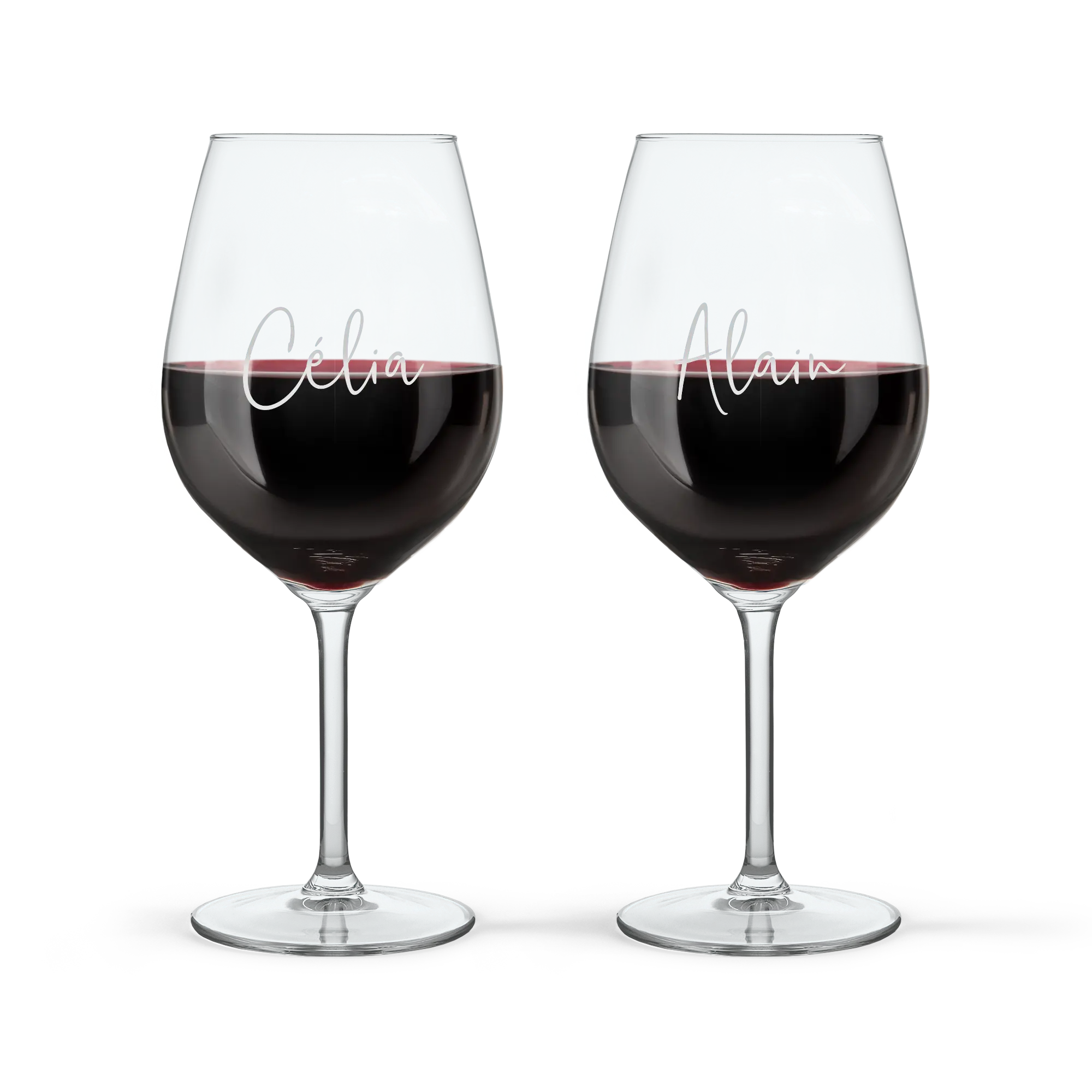 2 Beautiful wine glasses engraved with your own text or name.Additional information:Brand: Royal Leerdam Type: L'Esprit Engravement: white, the end-result may differ from the image shown Glass Diameter: 9cm Glass Height: 22cm Weight: 180 gram Volume: 53cl Wine: red Personalisation: name or textPersonalisation method: high quality laser engravingExtra: Dishwasher safeDo you want to engrave a logo on a glass, or order 18 or more glasses? Please contact our fantastic B2B team