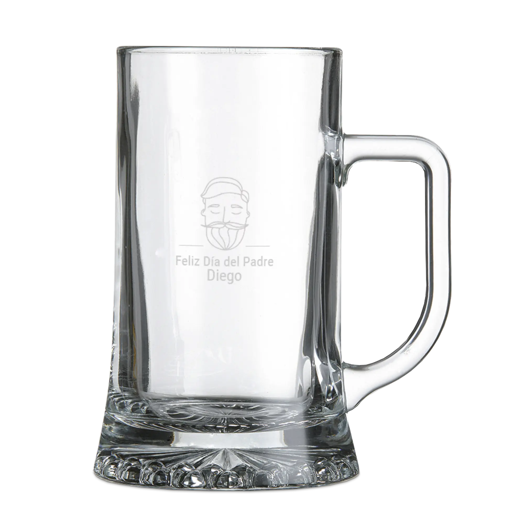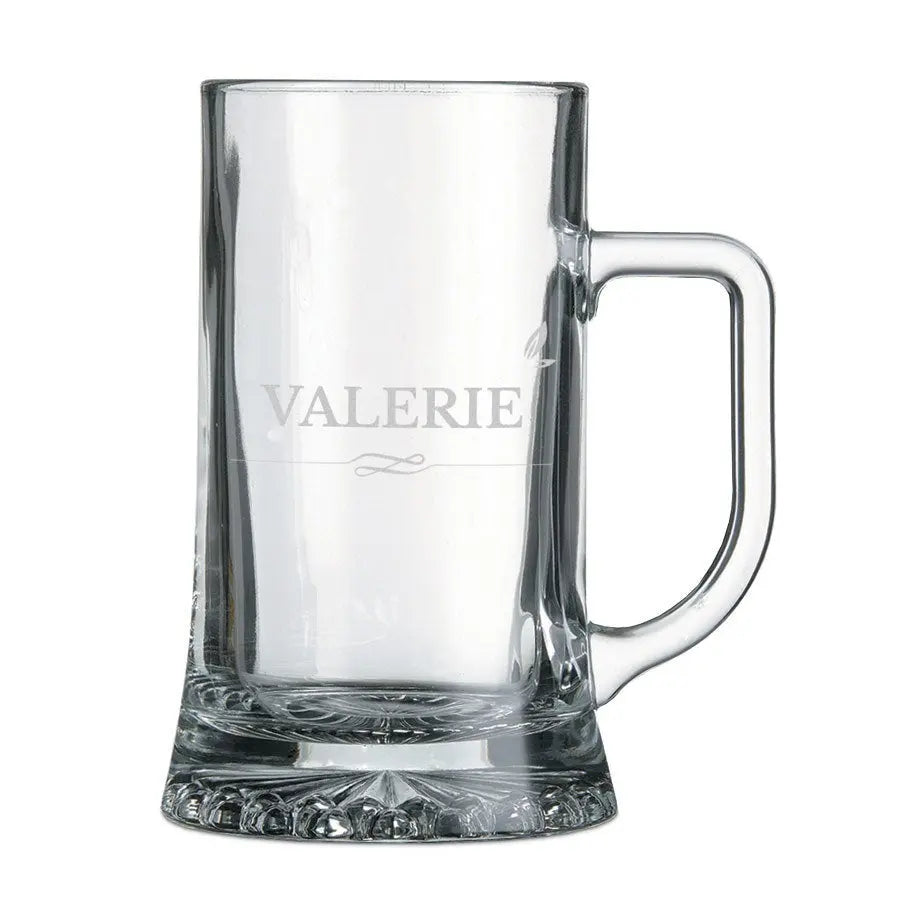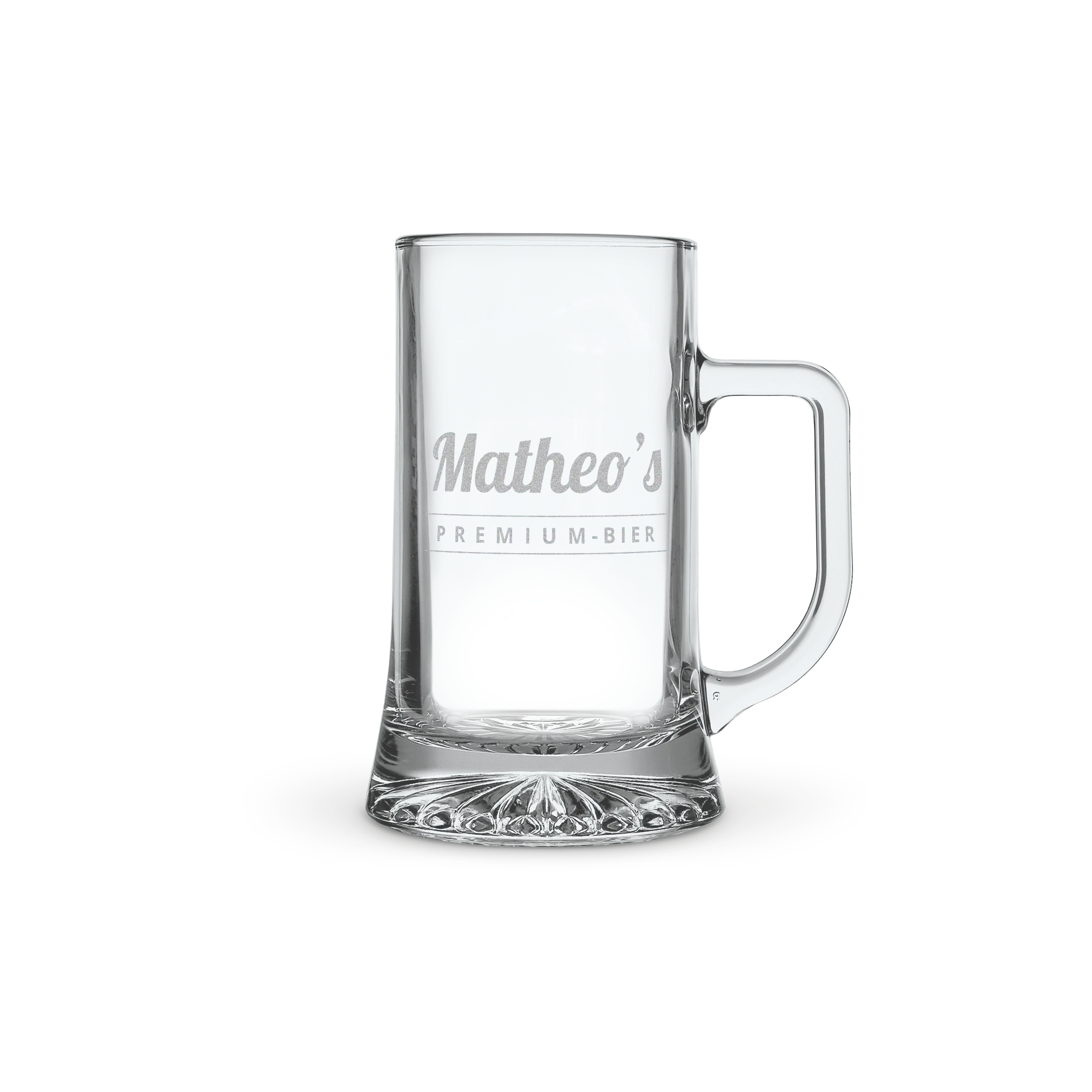 Have this glass beer mug engraved with the name or text of your choice to create a truly original gift! Can hold up to 50 cl and has a beautiful crystal base.More information on the glass beer mug:Amount: 1Type: MaximDiameter: 9,5 cm Height: 15,5 cm Volume: 50 cl Personalisation: name or text Personalisation method: high-quality laser engravingEngraving colour: white, the end result will slightly differ from the example shown Extra: dishwasher proofWould you like a logo engraved on the glass beer mug? Contact our business department for further information.