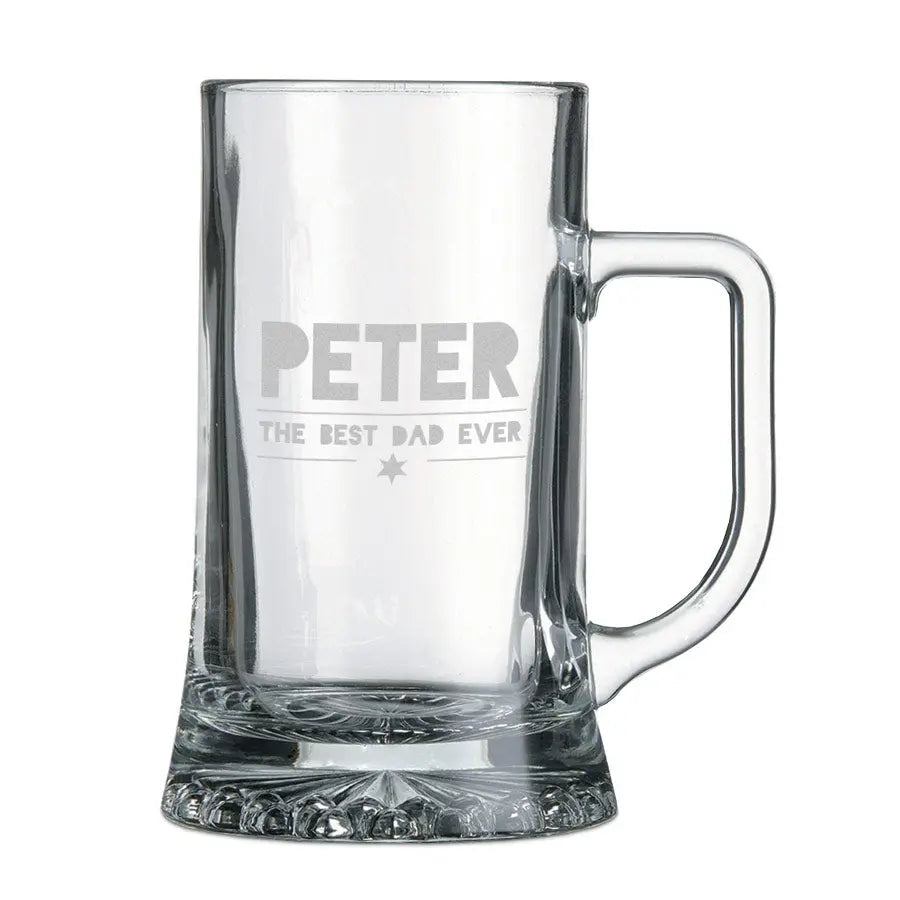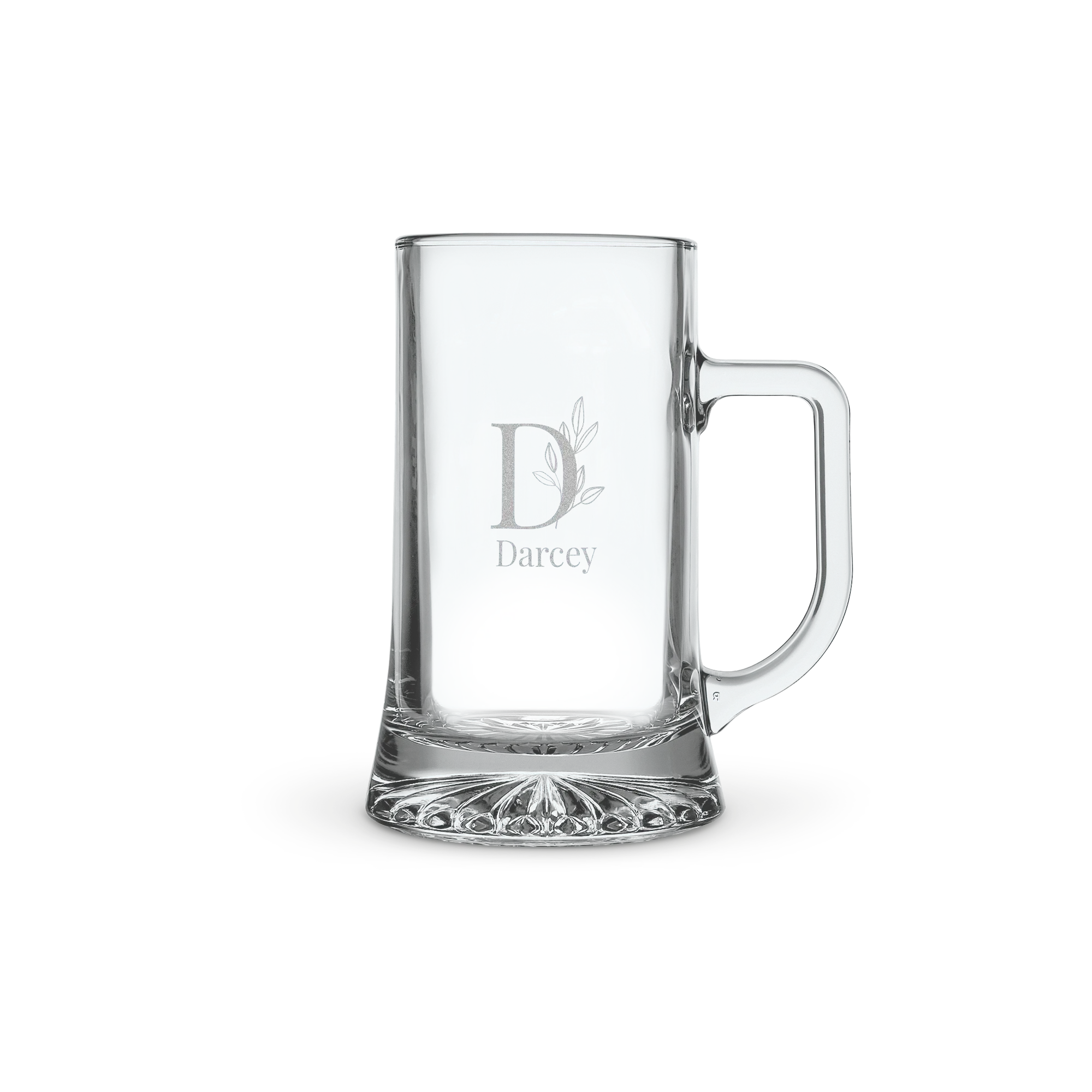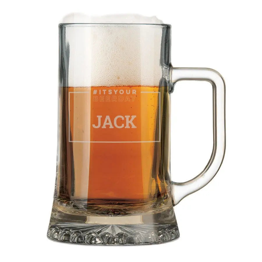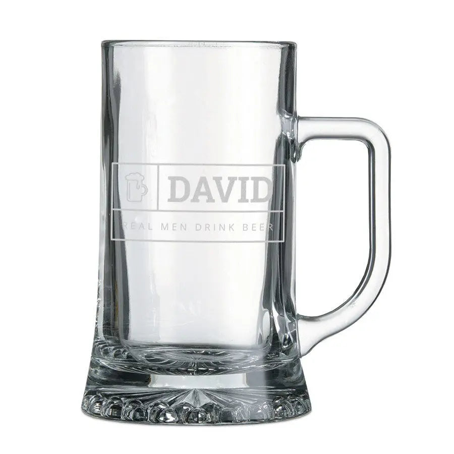 Have this glass beer mug engraved with the name or text of your choice to create a truly original gift! Can hold up to 50 cl and has a beautiful crystal base.More information on the glass beer mug:Amount: 1Type: MaximDiameter: 9,5 cm Height: 15,5 cm Volume: 50 cl Personalisation: name or text Personalisation method: high-quality laser engravingEngraving colour: white, the end result will slightly differ from the example shown Extra: dishwasher proofWould you like a logo engraved on the glass beer mug? Contact our business department for further information.