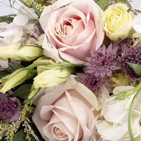 Find the gentleness and beauty of nature selected especially for you in this beautiful bouquet of fresh flowers. Delicate roses interspersed with white hydrangea create an exquisite, silky smooth base upon which the rest of the arrangement sways. Calla lilies add a touch of magic thanks to their exotic spiral flower, while speedwell adds notes of strength, valour and perseverance to the arrangement. Send a bouquet overflowing with good sensations with this supremely elegant VIP option.