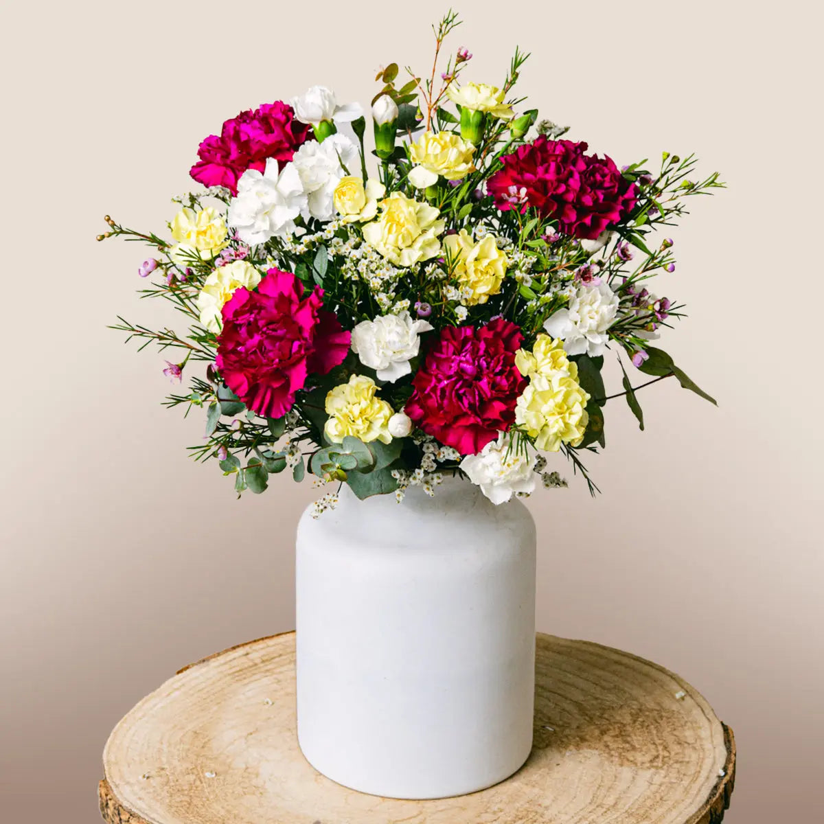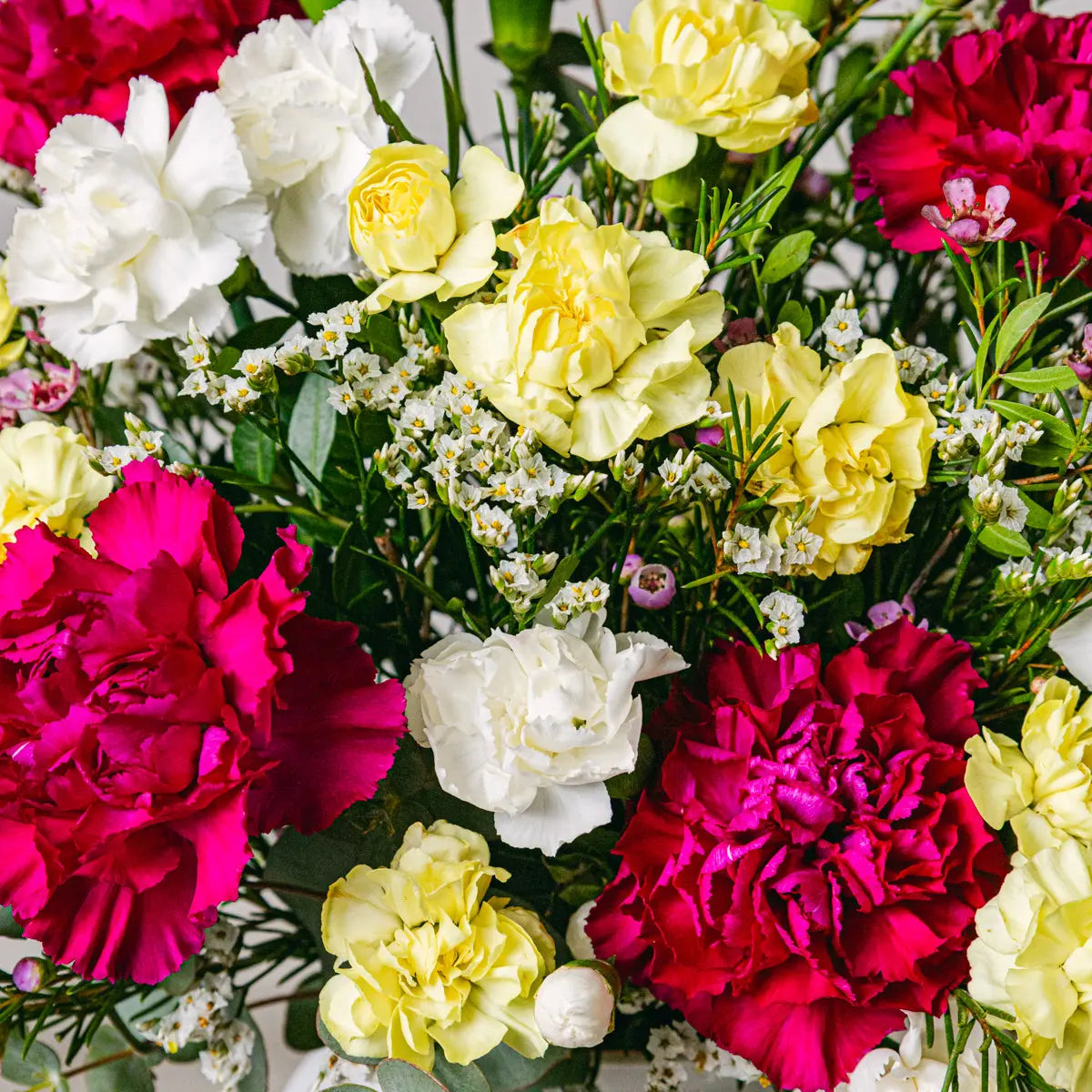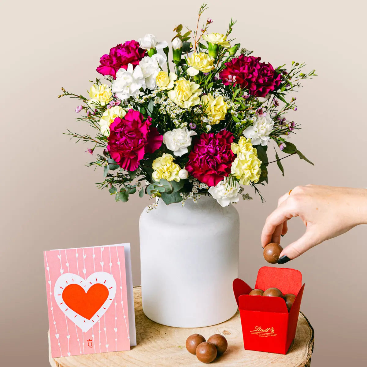 Experience the warm embrace of affection with our 'Heartfelt Harmony' bouquet, a stunning blend of vibrant carnations and delicate lisianthus. This thoughtfully crafted arrangement speaks the language of love and admiration, making it the perfect gift for reuniting hearts across distances. The rich, deep hues of red and pink carnations symbolize deep love and affection, while the white lisianthus represents purity and innocence, offering a message as sweet as the chocolates accompanying them.