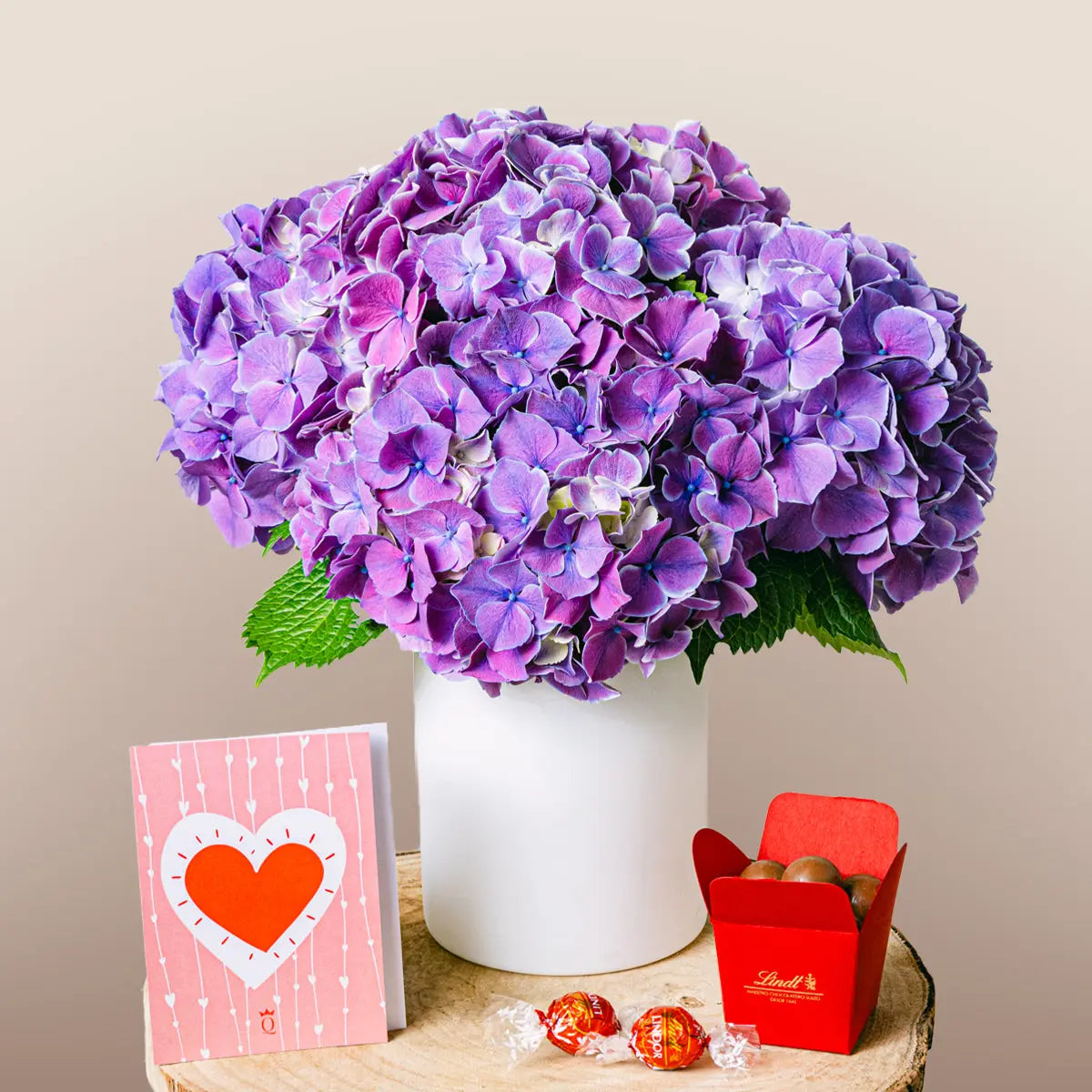 The colour purple is traditionally associated with ideas of richness and luxury, as well as the ability to inspire creativity and evoke mysticism and magic. When combined with the hydrangea — a symbol of gratitude, positivity and generosity — the result is an impressive bouquet overflowing with meaning. This unique arrangement takes us to an intricate garden of perfect blooms, calm lakes and insects fluttering around a special light.