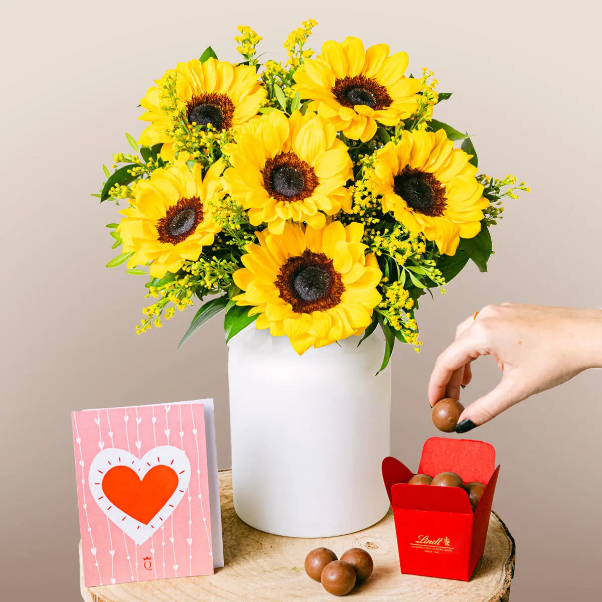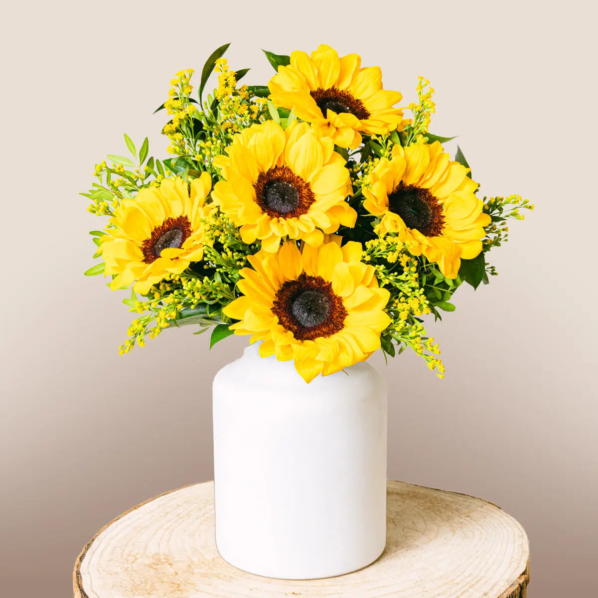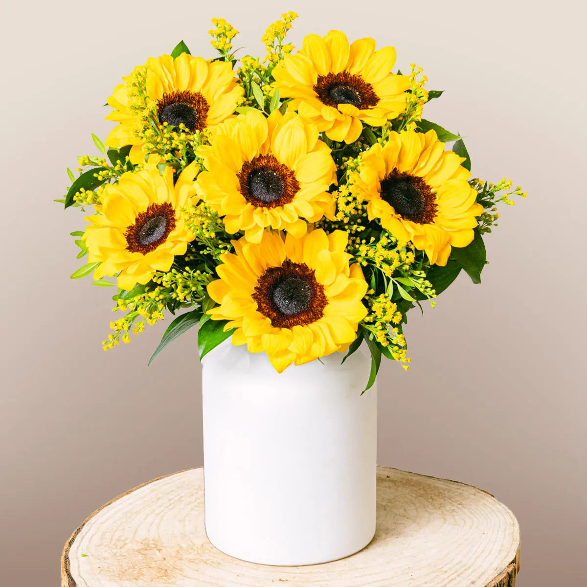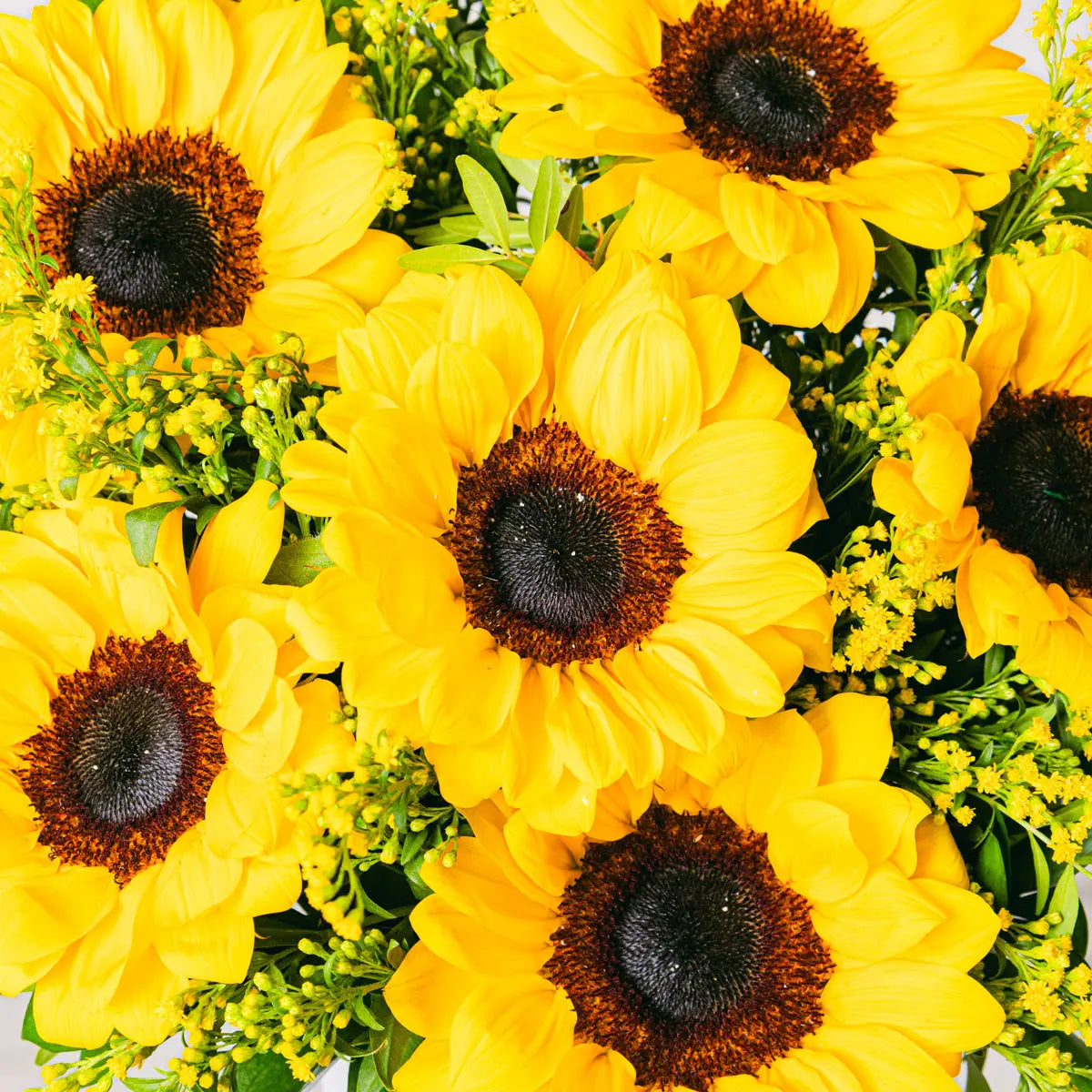 Our radiant Golden Melody bouquet combines the joy of sunflowers with the elegance of solidago, all embraced by leaves of aspidistra, lentisk, and eucalyptus. This vibrant floral arrangement is perfect for brightening the day of any special person. Sunflowers, known for their symbolism of happiness and vitality, blend harmoniously with solidago, creating a bouquet full of energy and positivity. Ideal for celebrating a birthday, an anniversary, or simply brightening someone's day during the summer, the Golden Melody bouquet is the perfect choice. Place your order today and enjoy the speed and security of our home delivery service! Let the brilliance of sunflowers and the delicacy of solidago transform any occasion into an unforgettable moment.Golden Melody