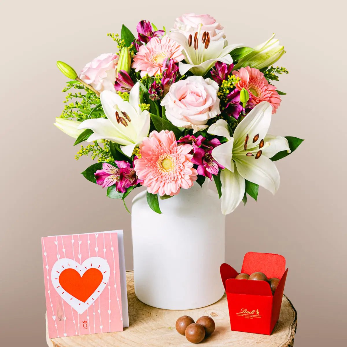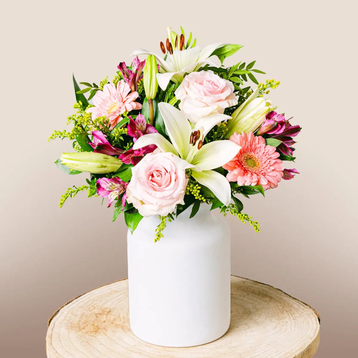 Gerberas, Lilies, Roses, and Alstroemerias in shades of white, pink, and purple. Each bloom is carefully selected for its vibrancy and freshness, ensuring a bouquet that exudes beauty and elegance.