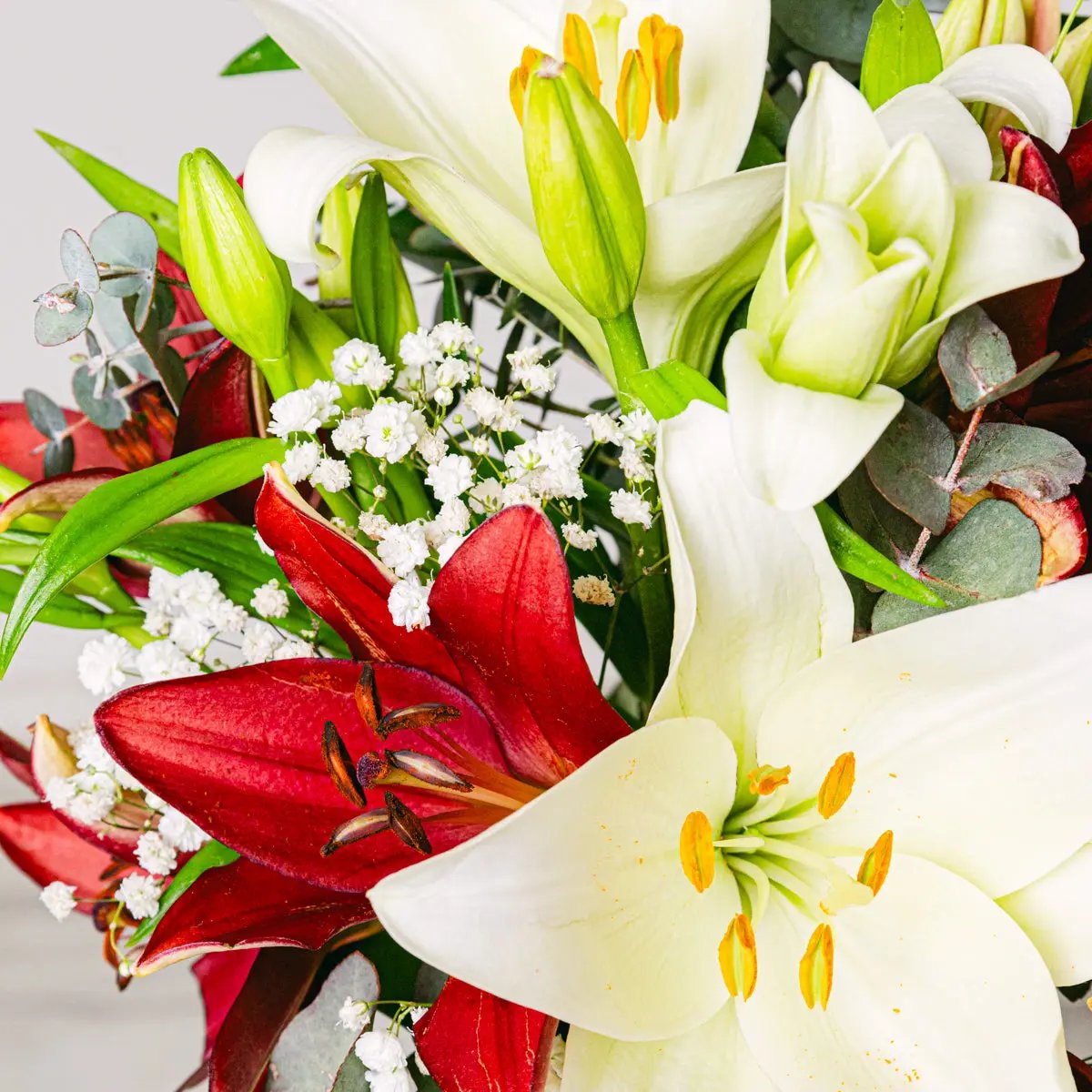 A masterpiece of sophistication and passion, encapsulated in every delicate petal of our premium red lilies. These lilies, carefully selected for their freshness and unmatched quality, are a symbol of deep love and sincere admiration, capable of conveying the most intense emotions with their vibrant crimson hue.