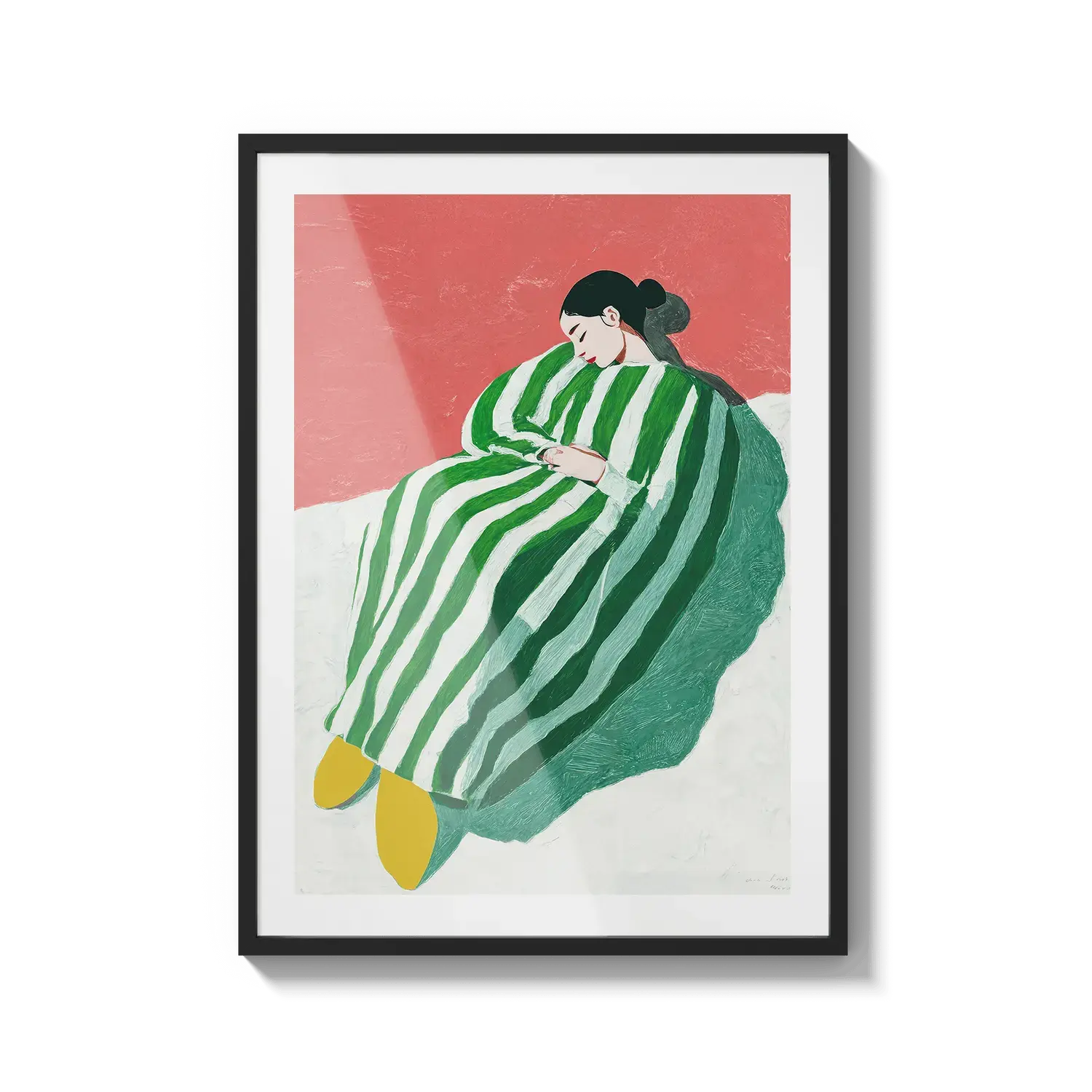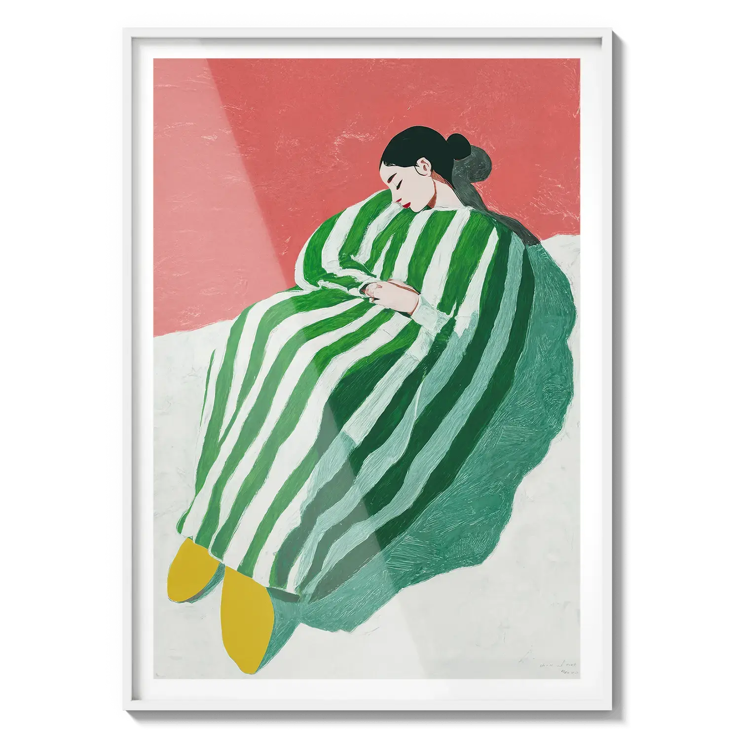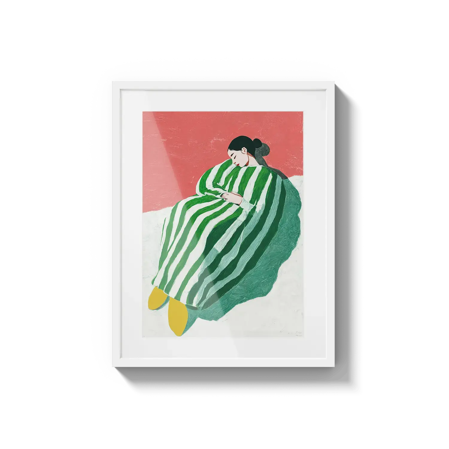 A figure wrapped in green and white stripes resting with quiet ease. A gentle invitation to slow down.