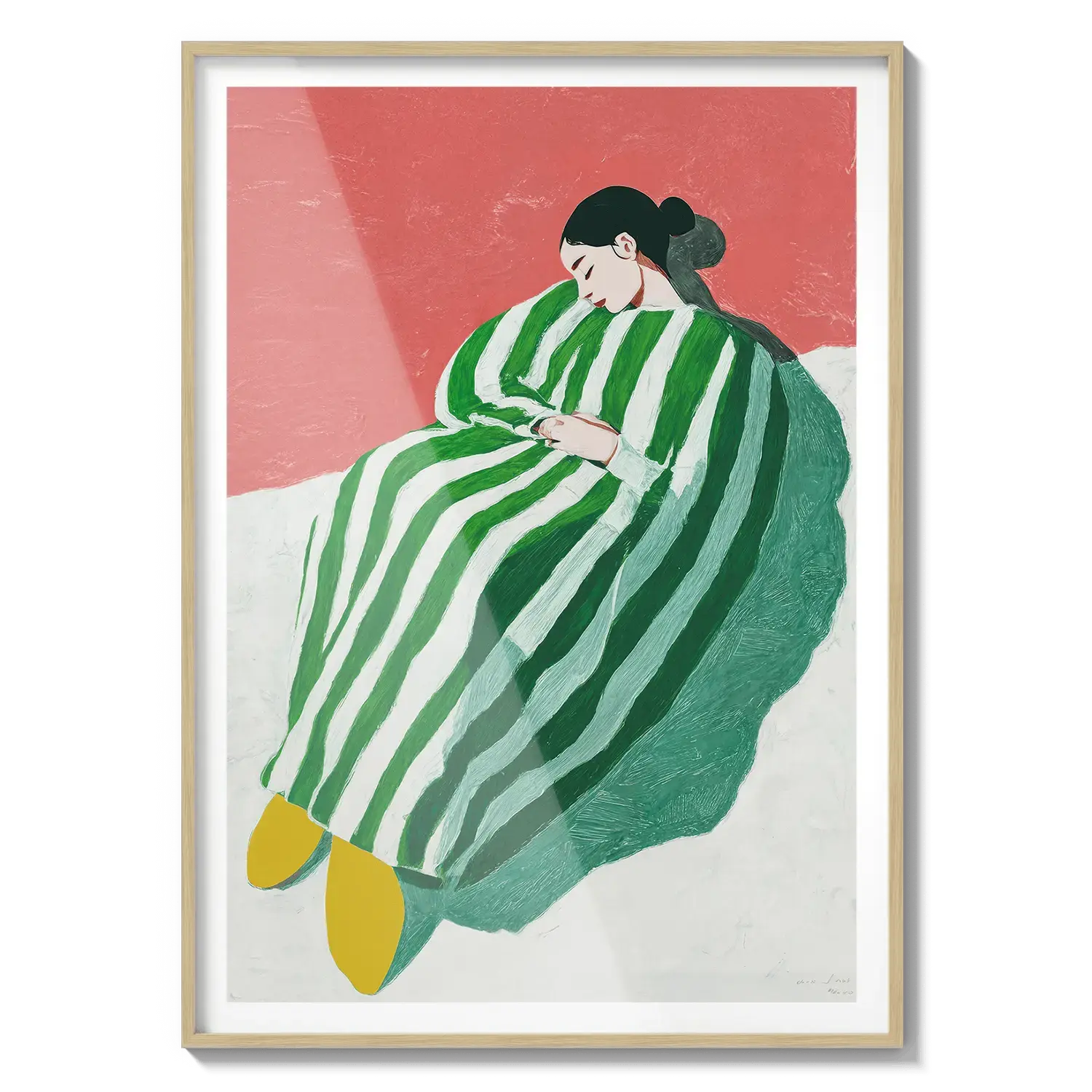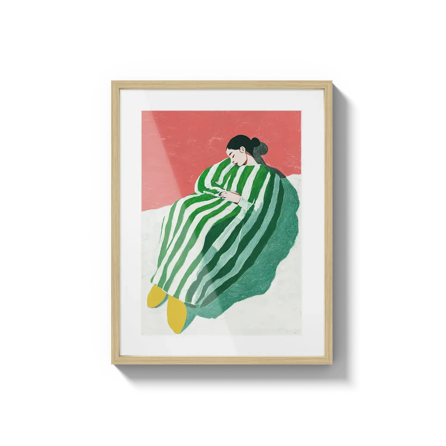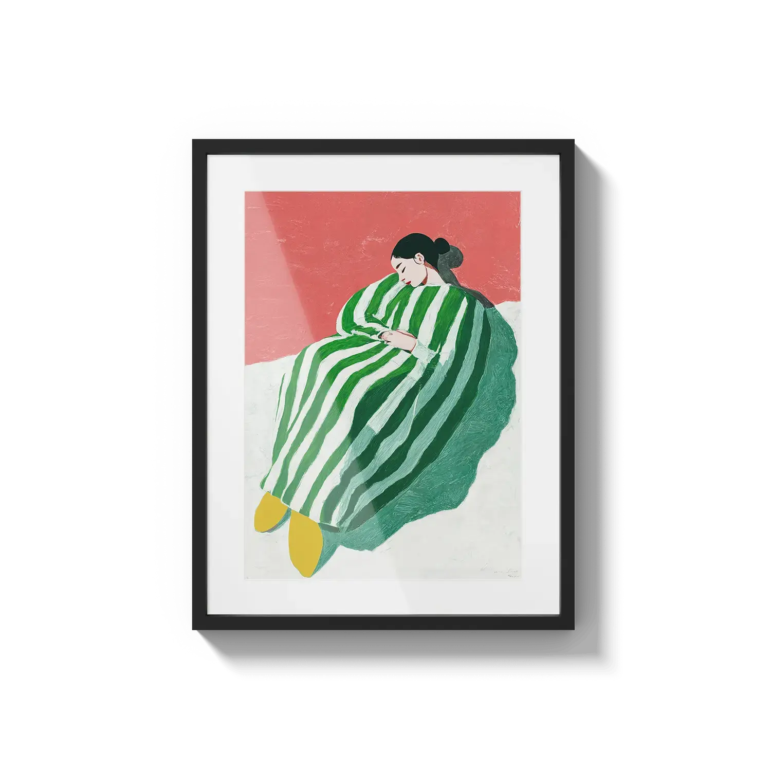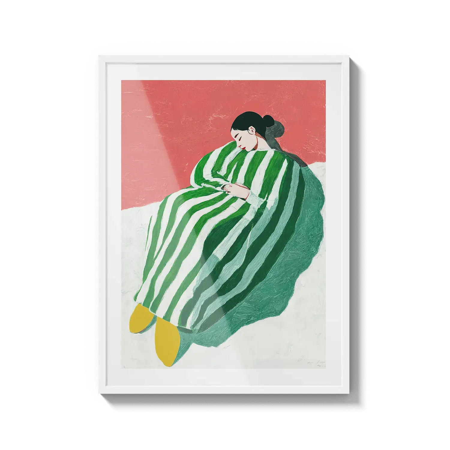A figure wrapped in green and white stripes resting with quiet ease. A gentle invitation to slow down.