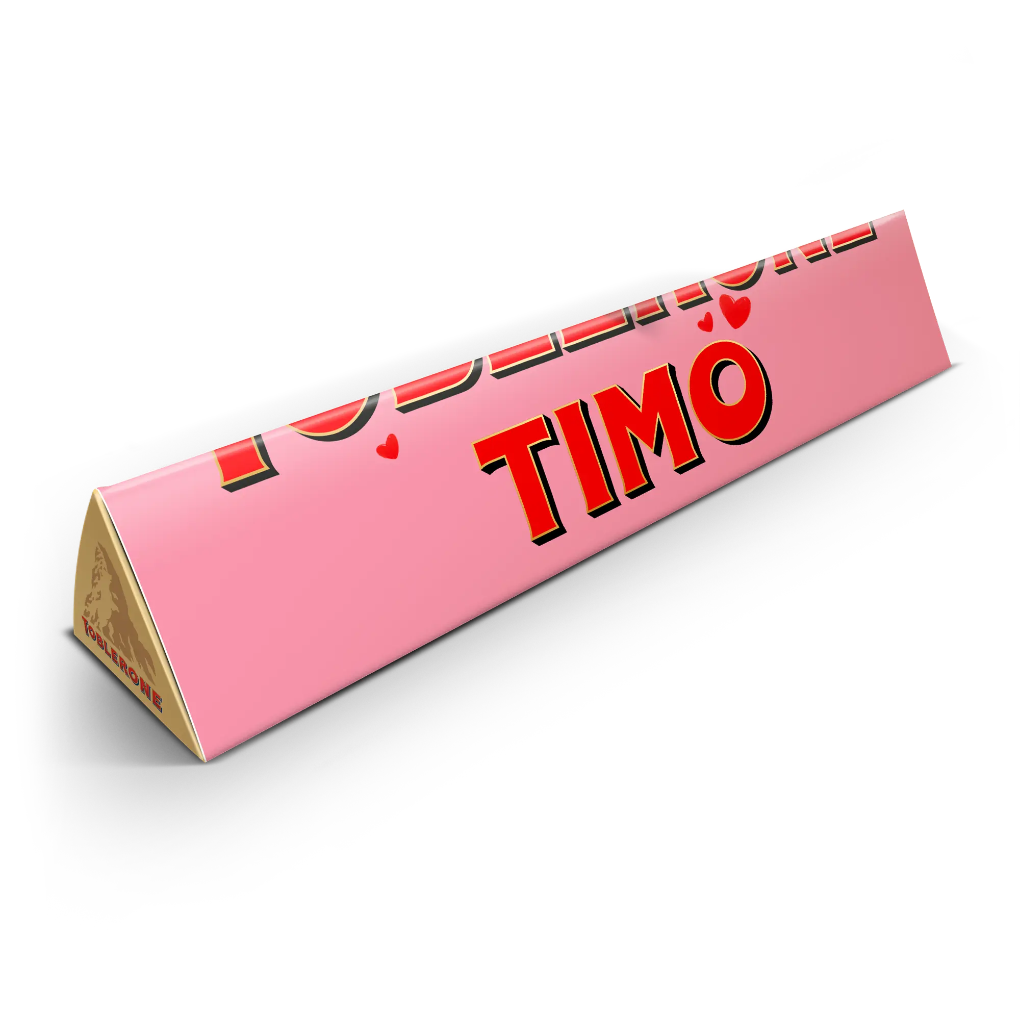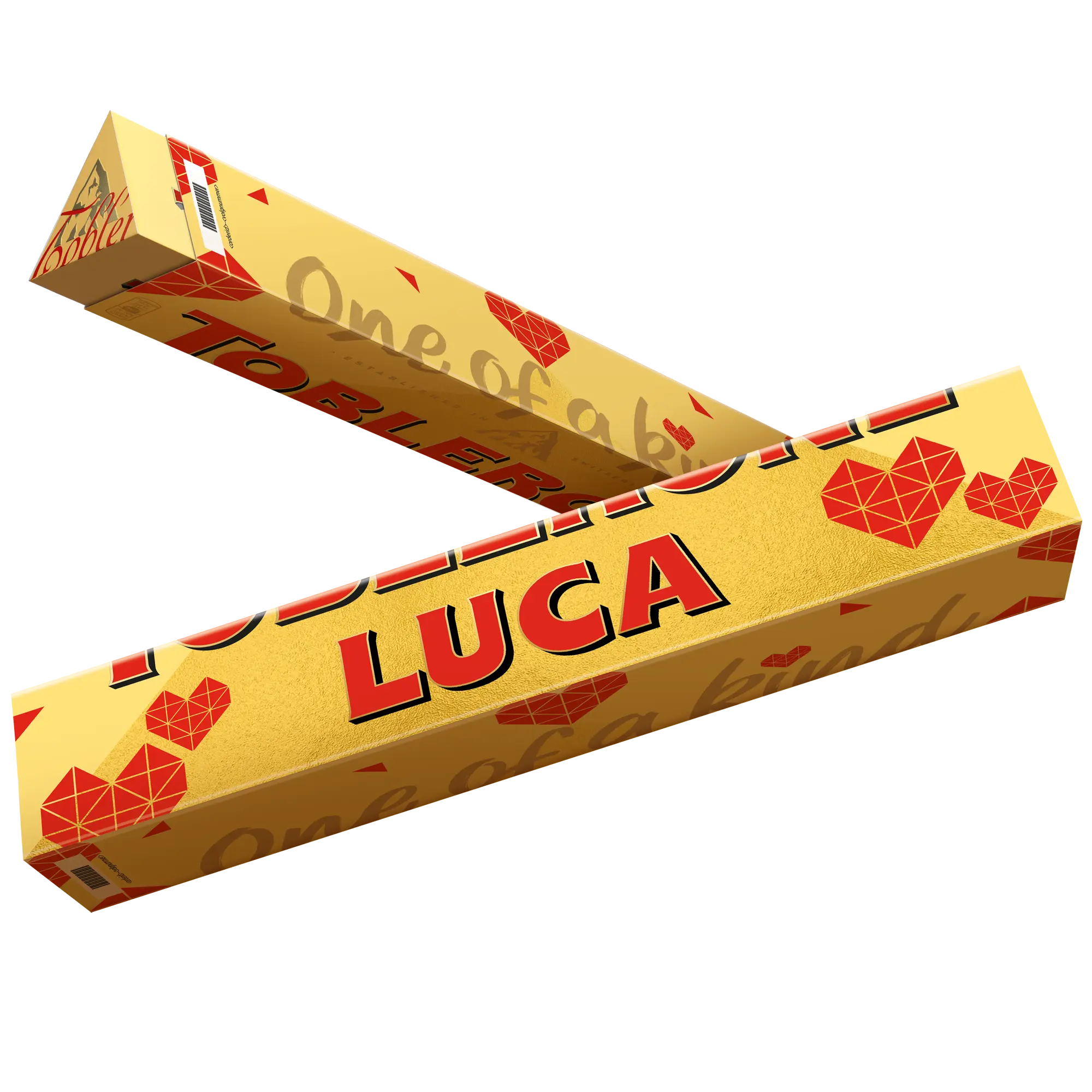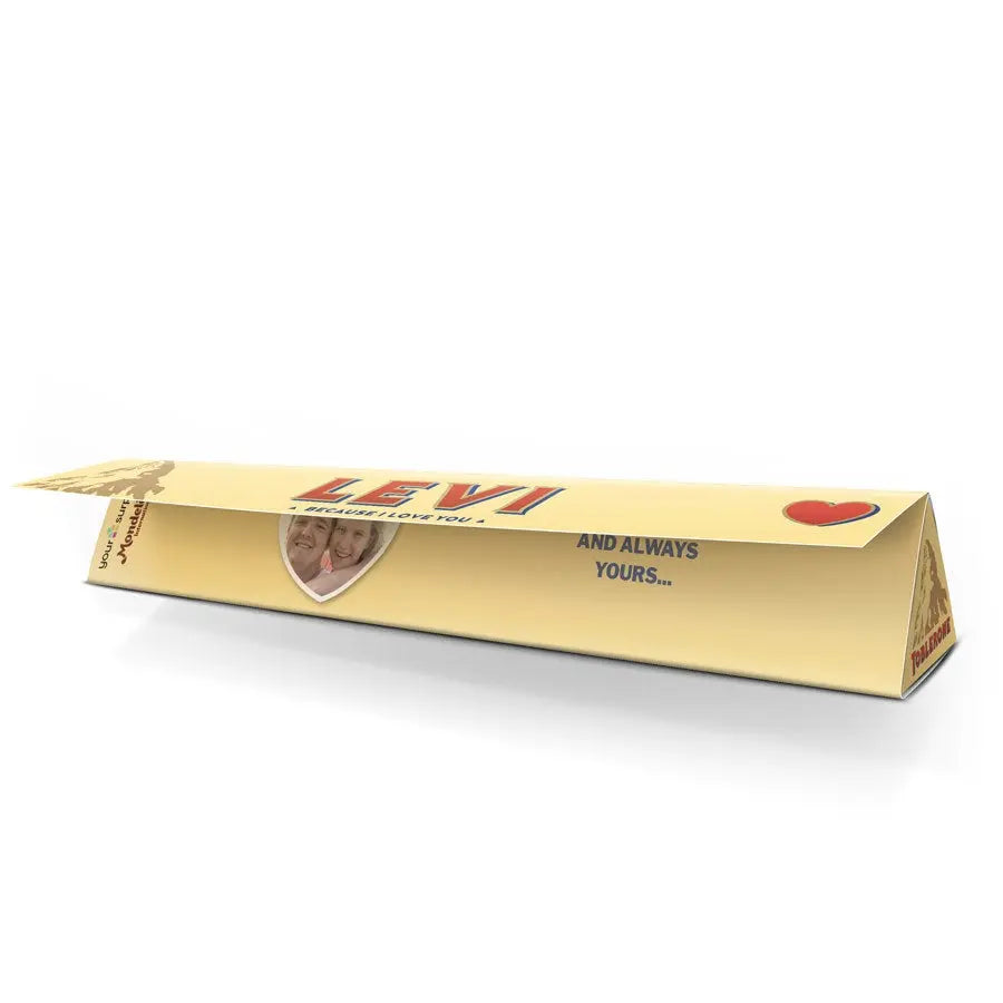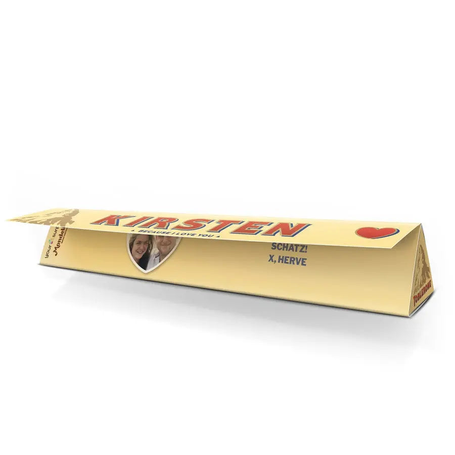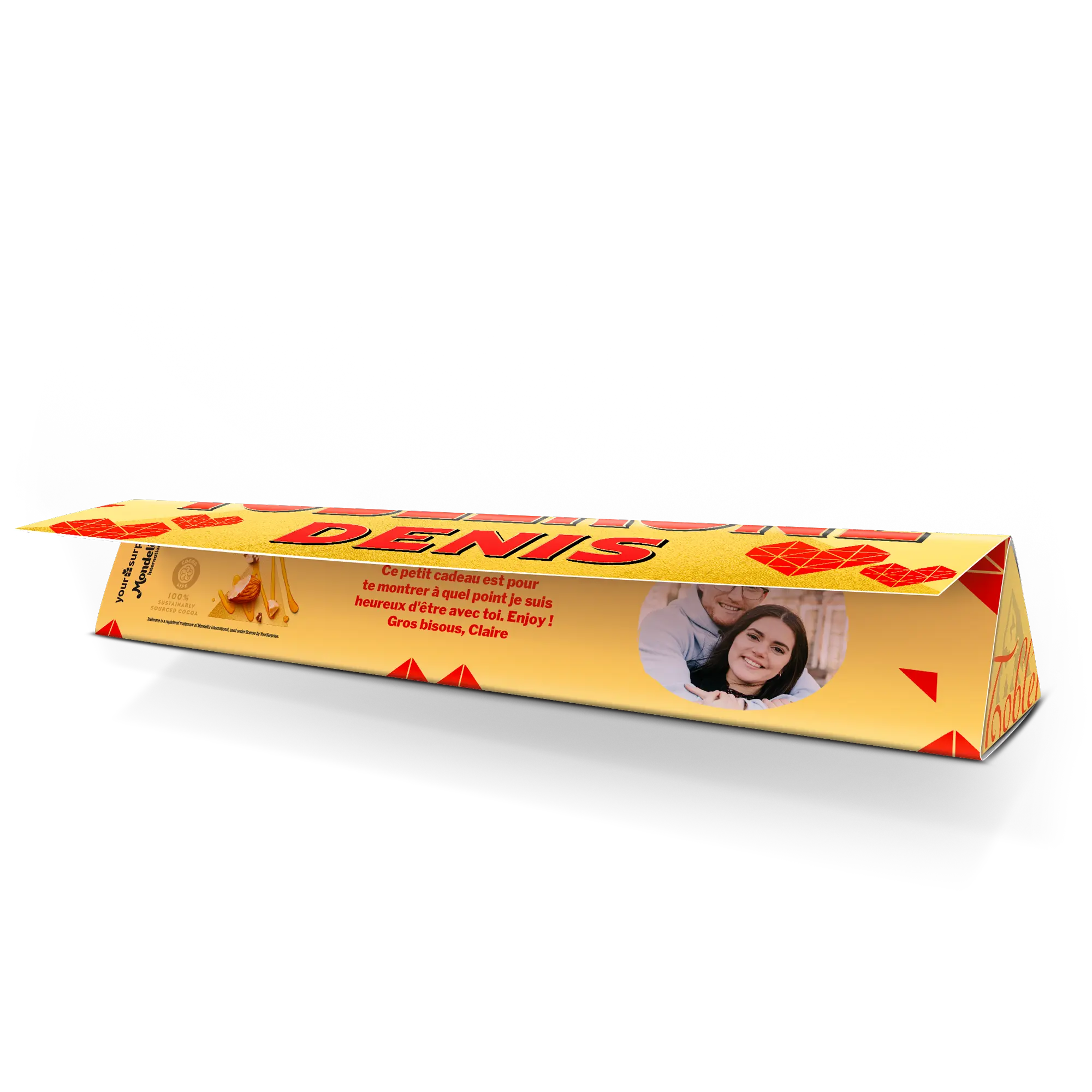 Does your (secret) crush love Toblerone chocolate? Then this personalised bar is the best gift ever. Unique with name, photo and message!More information on the personalised love-themed Toblerone bar:Chocolate: milk chocolate with honey and almond nougatWeight: 360 gramsDimensions: 30.5 x 6 x 5.2 cmPersonalisation: with photo, name and messagePrint: razor-sharp and in full colourFor technical reasons, it is not possible to use Cyrillic, Turkish, Asian, Arabic, Greek or special characters.Ingredients:Sugar, whole milk powder, cocoa butter, cocoa mass, honey (3%), milk fat, almonds (1.6%), emulsifier (soy lecithin), egg white, aroma. The milk chocolate contains at least 28% cocoa. Allergens:Contains eggs, milk, soy, almonds and may contain traces of other nuts. Our Toblerones are made with chocolate from Switzerland.