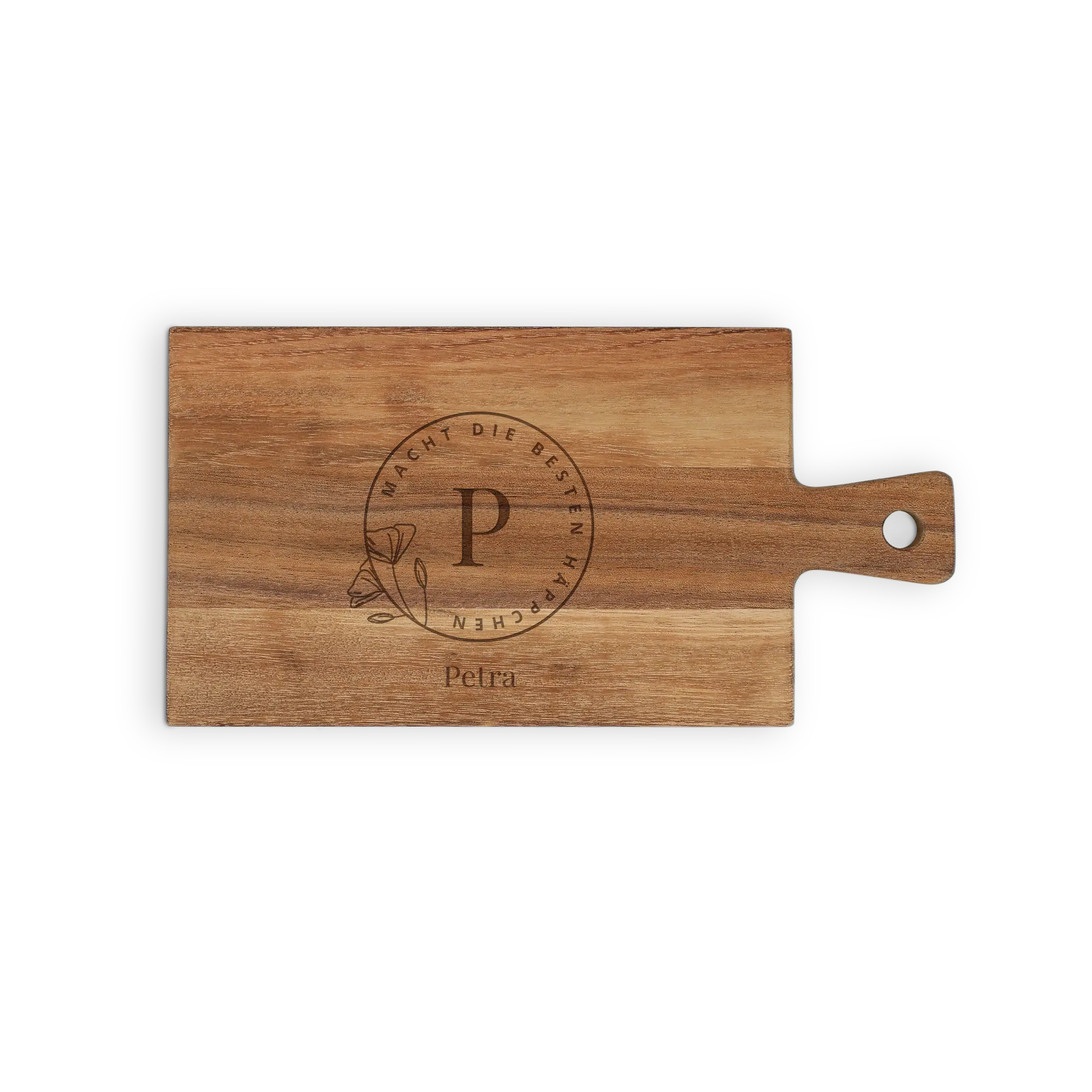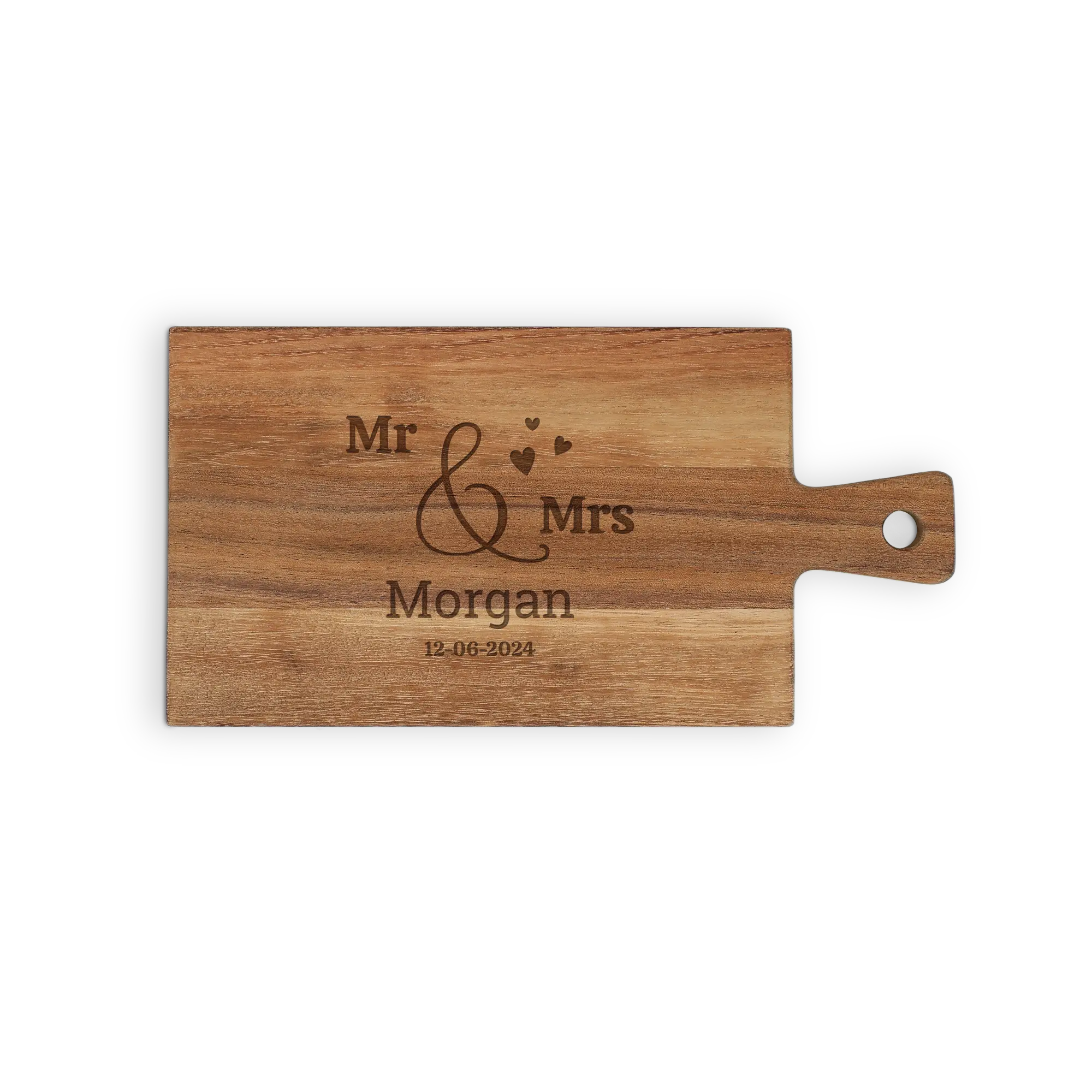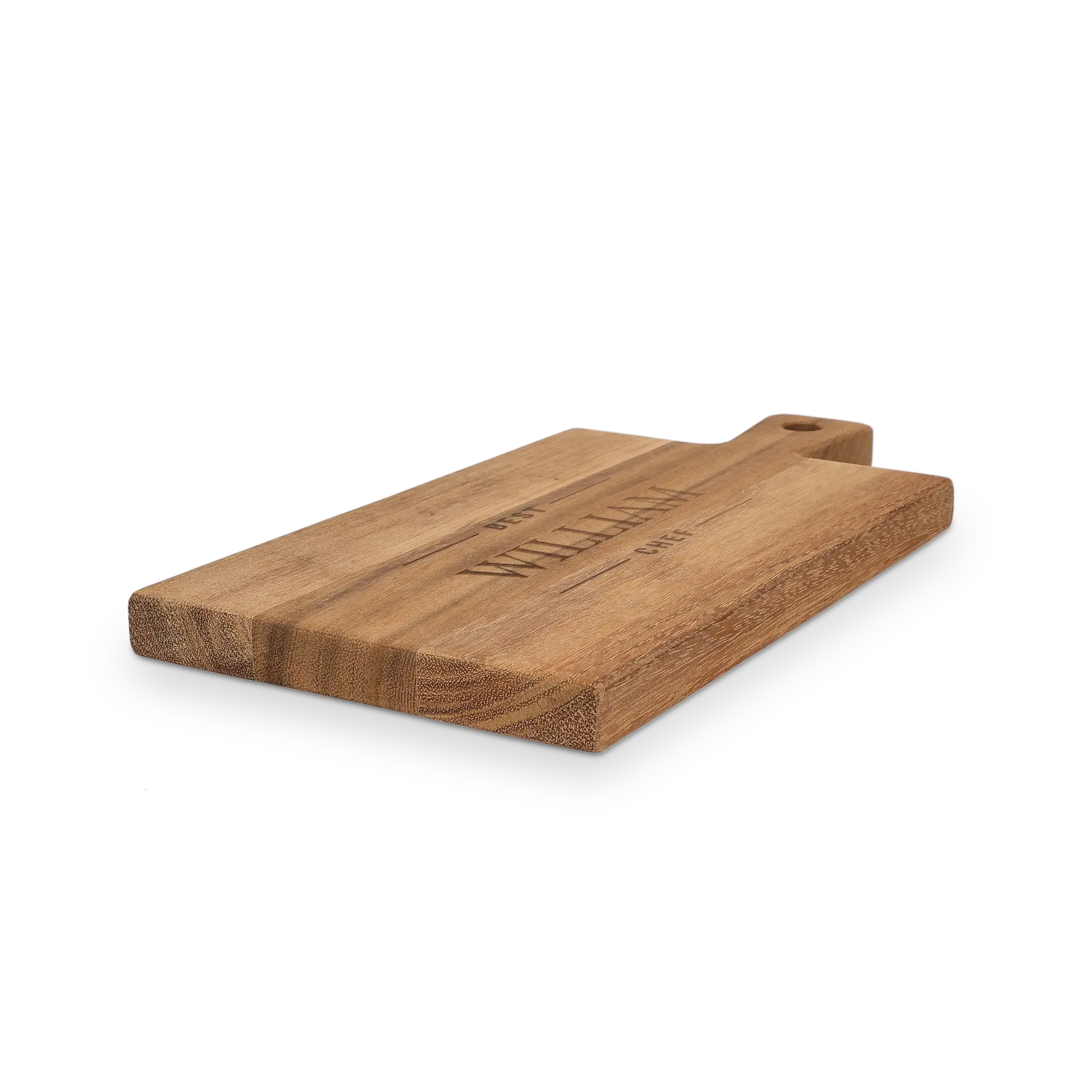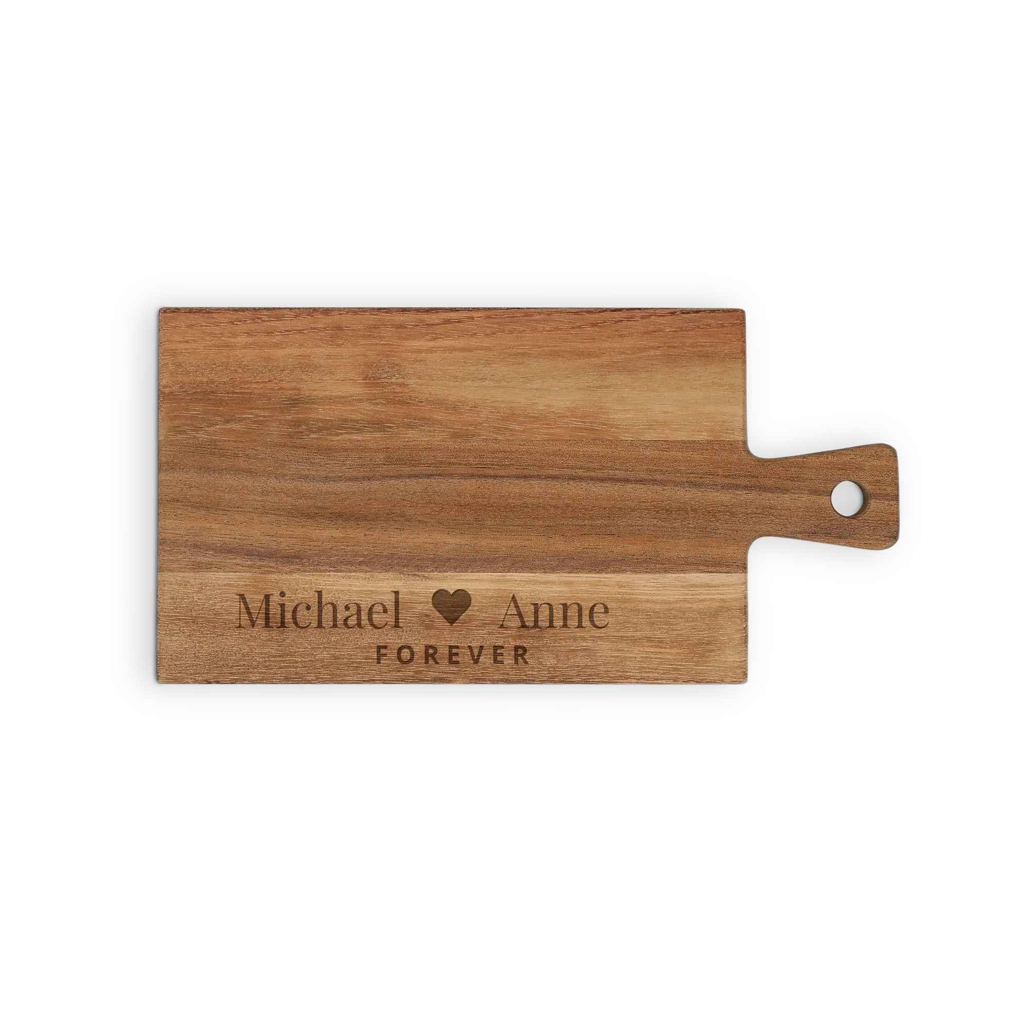 Create a unique teak serving board. A personal gift with name, text and designs. In different formats!More information about the wooden serving platter:Material: high-quality solid teak Finish: Oiled and includes a leather cord Dimensions: 31,5 x 16 x 1,5 cm Weight: +/- 330 grams Personalisation: text engraving Colour engraving: wood Extra: - Not suitable for the dishwasher!- Wood is a natural product. This means that your gift may differ slightly from the example photo.Unfortunately, for technical reasons, it is not possible to process Cyrillic, Turkish or special characters.