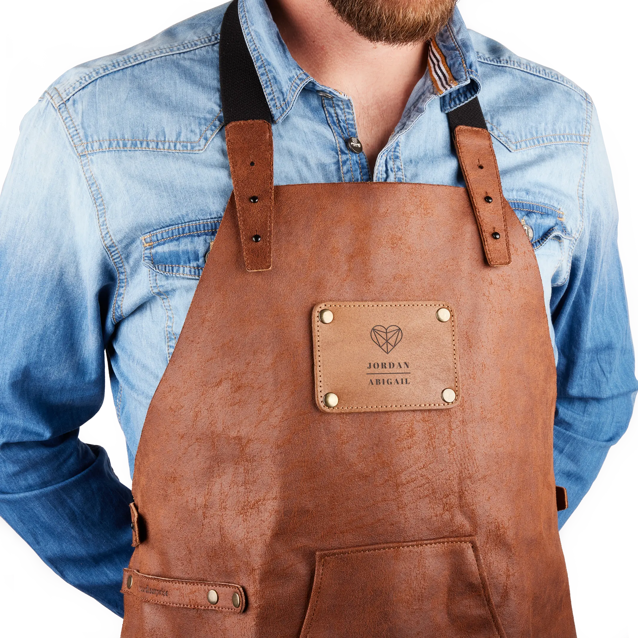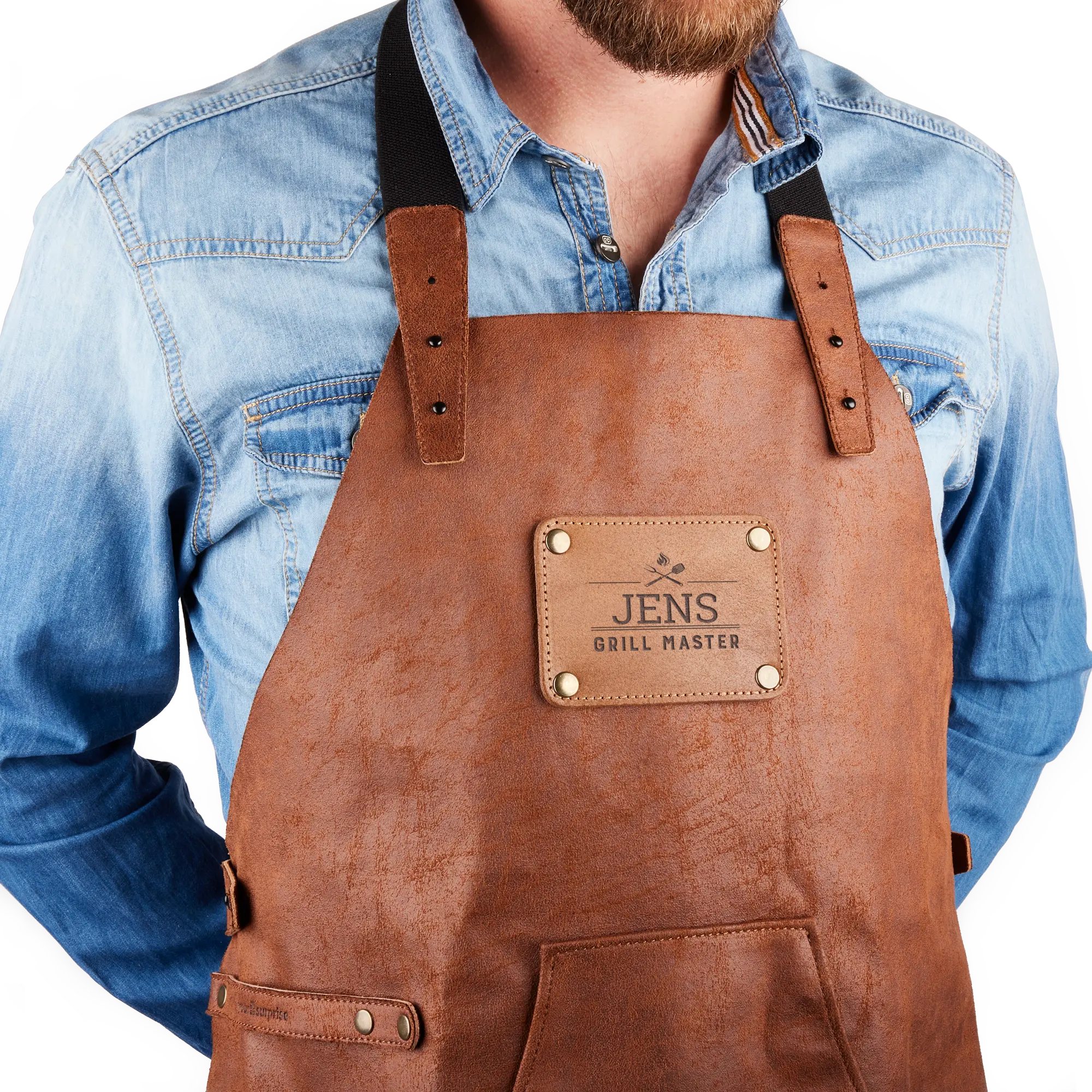 Avental de couro sustentável muito legal, gravado com um design especial e nome. O presente perfeito para todo (futuro) chef!