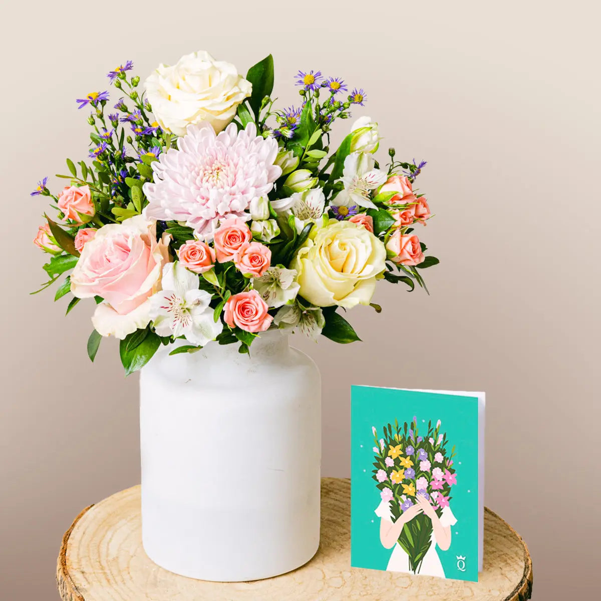Por tempo limitado, nosso icônico buquê "Força Infinita" vem em uma edição especial que inclui o vaso e um cartão para sua mensagem pessoal. Este lindo buquê, que combina anástatos rosa, astros lilás e rosas brancas, é perfeito para expressar seus sentimentos de uma maneira única. Aproveite esta oferta exclusiva e surpreenda seus entes queridos com um presente inesquecível!