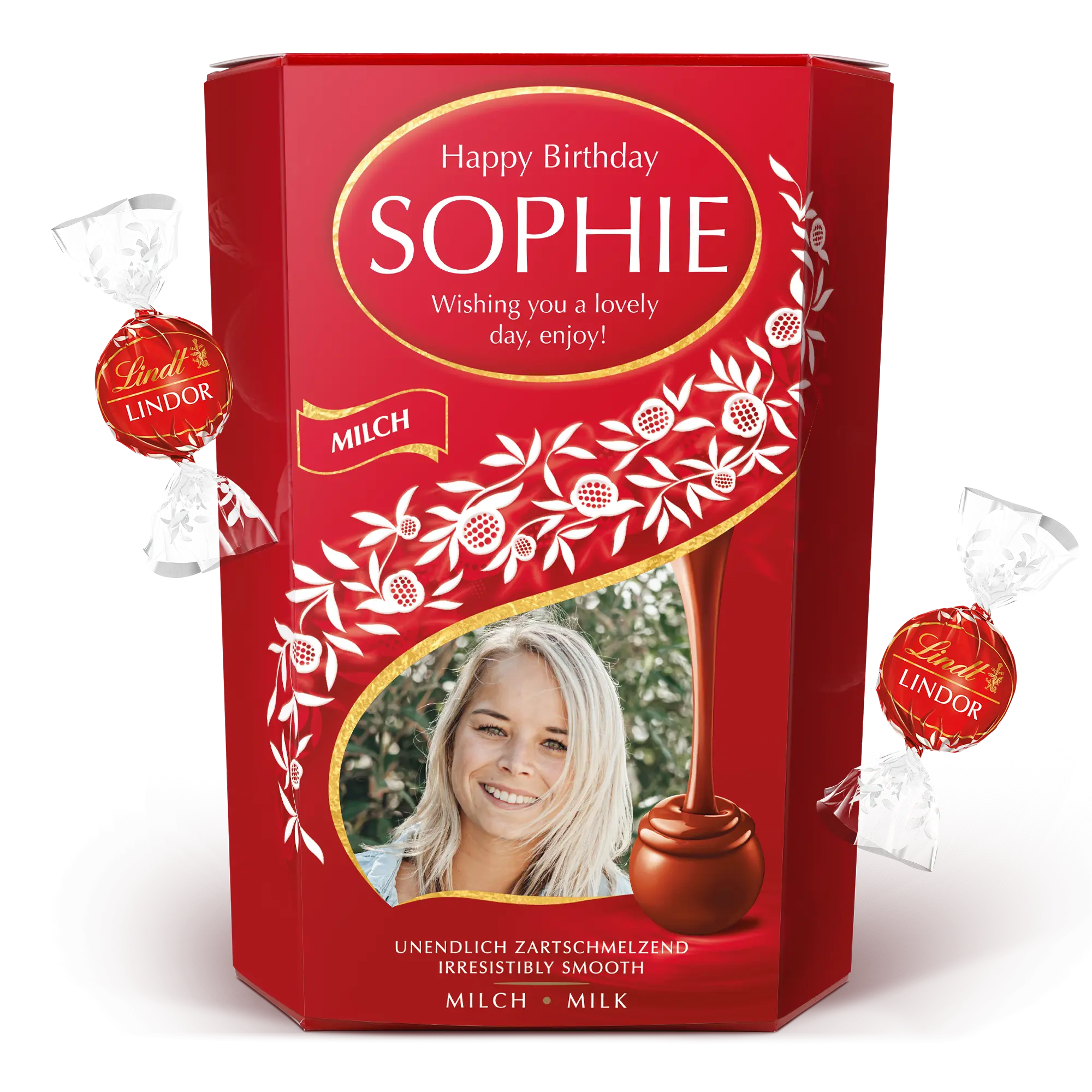 Mais informações sobre a caixa de presente de chocolate Lindt: Chocolate: chocolate ao leite Lindor com recheio suave e derretido Peso: 500 gramas Dimensões: 14,4 x 8,3 x 19,5 cm Personalização: com foto, nome e mensagem pessoal Impressão: perfeita e em cores vibrantes Por razões técnicas, infelizmente não é possível adicionar caracteres cirílicos, árabes ou especiais. Quando a temperatura externa estiver acima de 25 graus Celsius, não podemos garantir a qualidade do chocolate. Ingredientes: Açúcar, gorduras vegetais, manteiga de cacau, massa de cacau, leite em pó integral, lactose, manteiga, leite em pó desnatado, emulsificante (lecitina de soja), extrato de malte, aromatizantes naturais. Teor de cacau: O chocolate ao leite contém pelo menos 32% de cacau. Os sólidos do leite contêm pelo menos 21% de cacau. Alérgenos: Pode conter avelãs e outras nozes.