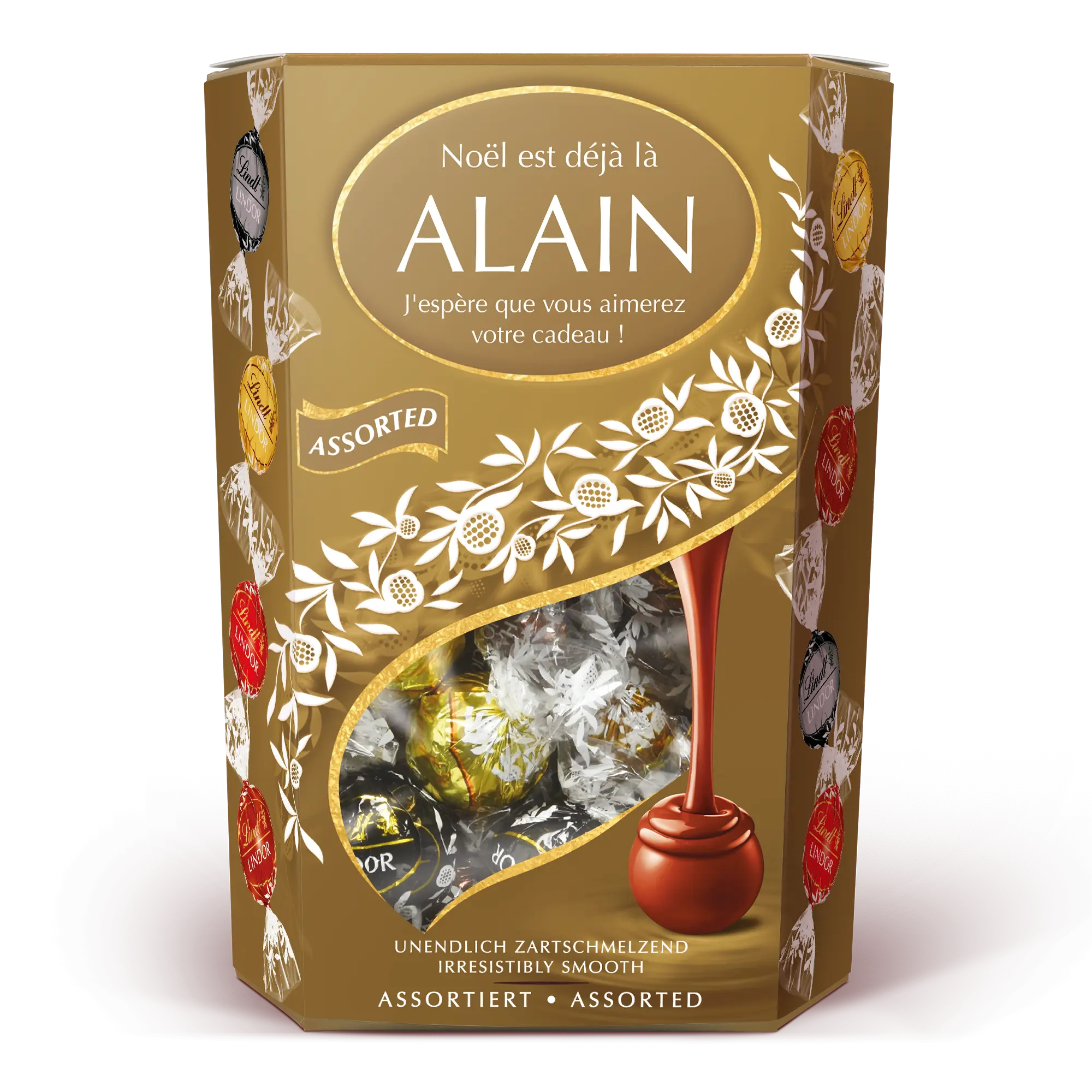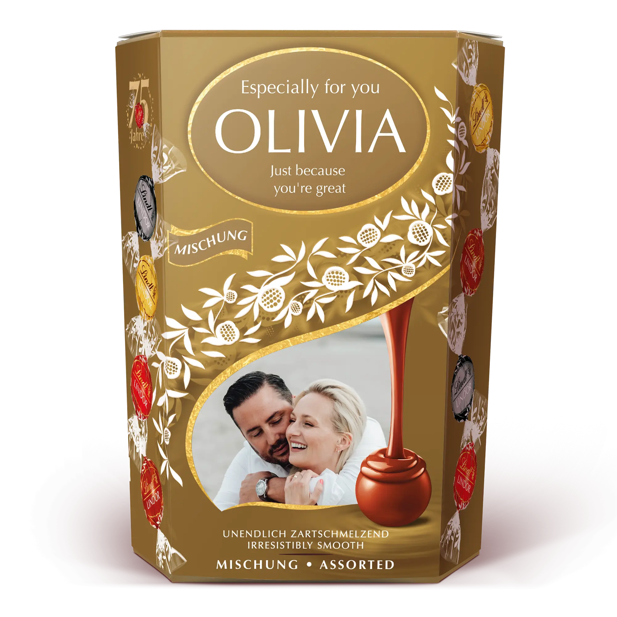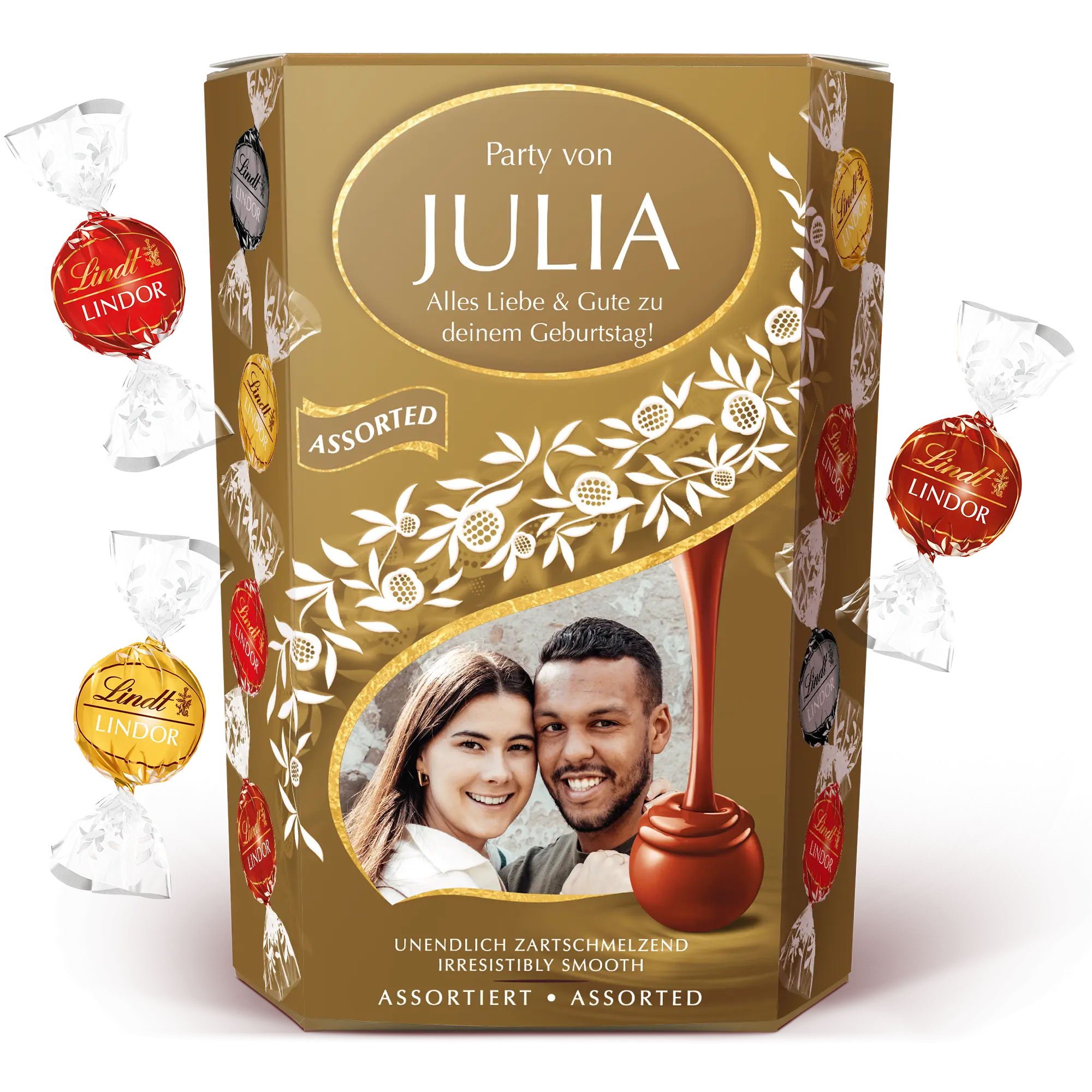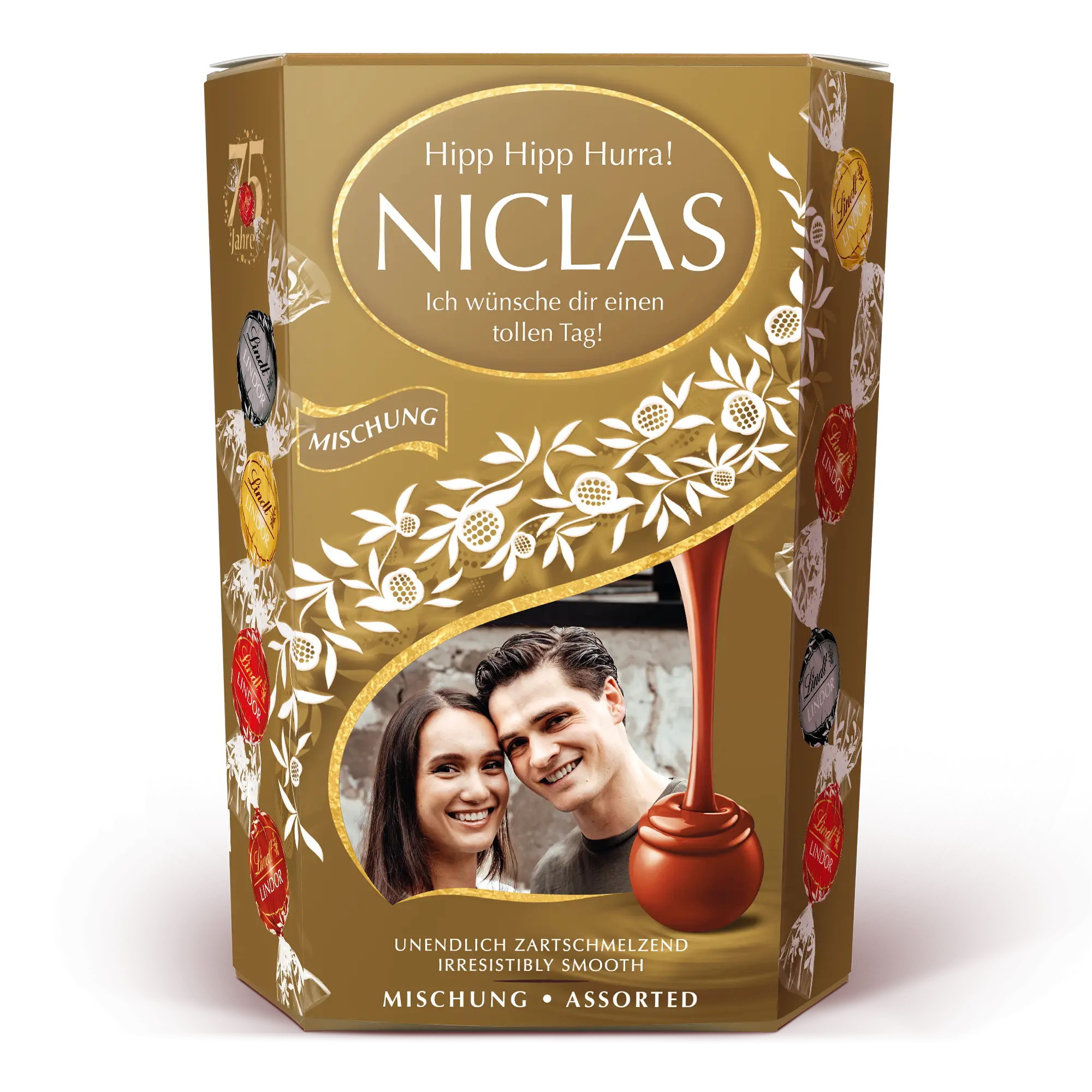 Mais informações sobre a caixa de presente de chocolate Lindt: Chocolate: Lindor ao leite, avelã ao leite, chocolate branco e chocolate extra amargo com recheio macio e derretido Peso: 500 gramas Dimensões: 14,4 x 8,3 x 19,5 cm Personalização: com foto, nome e mensagem pessoal Impressão: perfeita e em cores vibrantes Por razões técnicas, infelizmente não é possível adicionar caracteres cirílicos, árabes ou especiais. Quando a temperatura externa estiver acima de 25 graus Celsius, não podemos garantir a qualidade do chocolate. Ingredientes: Açúcar, gorduras vegetais (coco, palmiste), manteiga de cacau, massa de cacau, leite em pó integral, lactose, manteiga, leite em pó desnatado, gordura láctea anidra, avelãs, emulsificante (lecitina de soja), extrato de malte de cevada, aromatizantes naturais, vagens de baunilha. Teor de cacau: O chocolate amargo contém pelo menos 45% de cacau. Alérgenos: Pode conter outras NOZES.