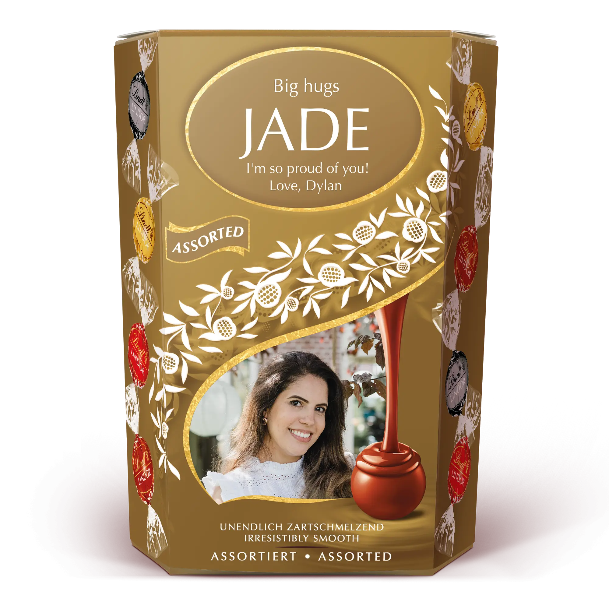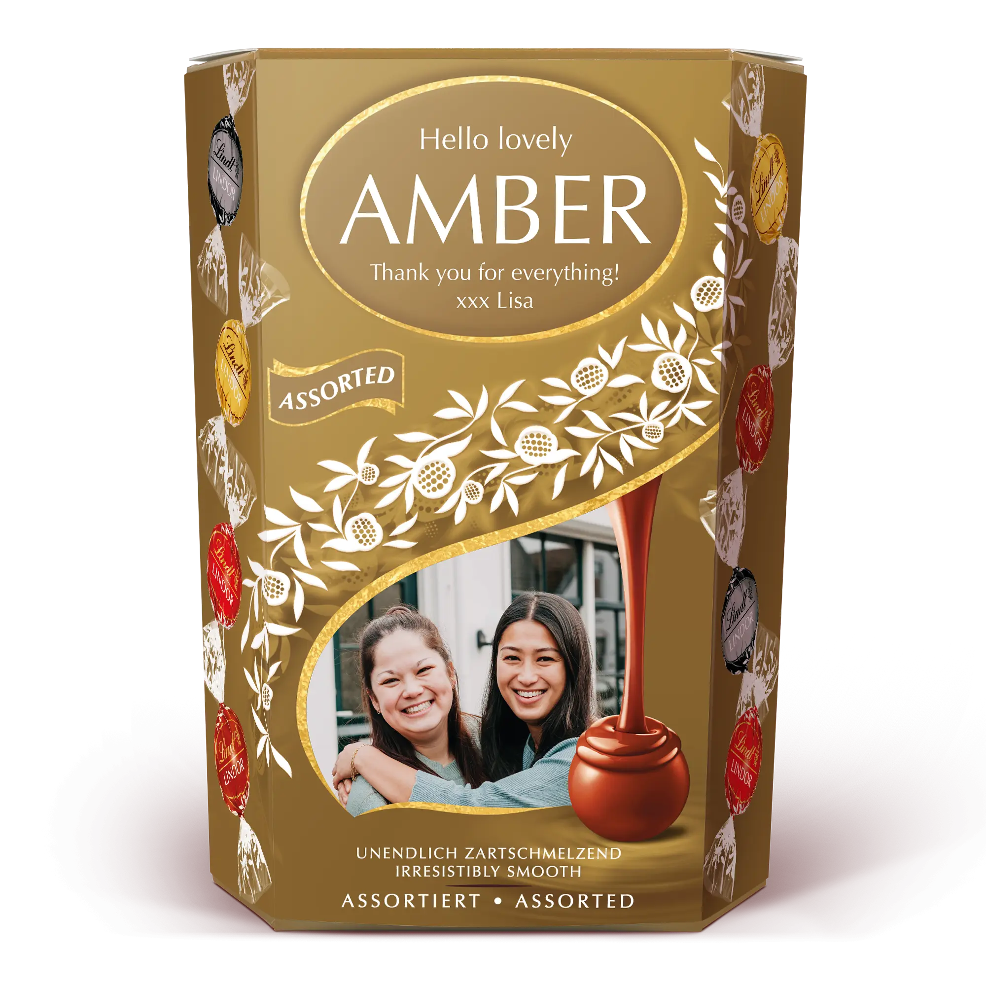 Caixa de presente de chocolate Lindt personalizada com foto, nome e mensagem pessoal de sua escolha - perfeita para os amantes de chocolate!