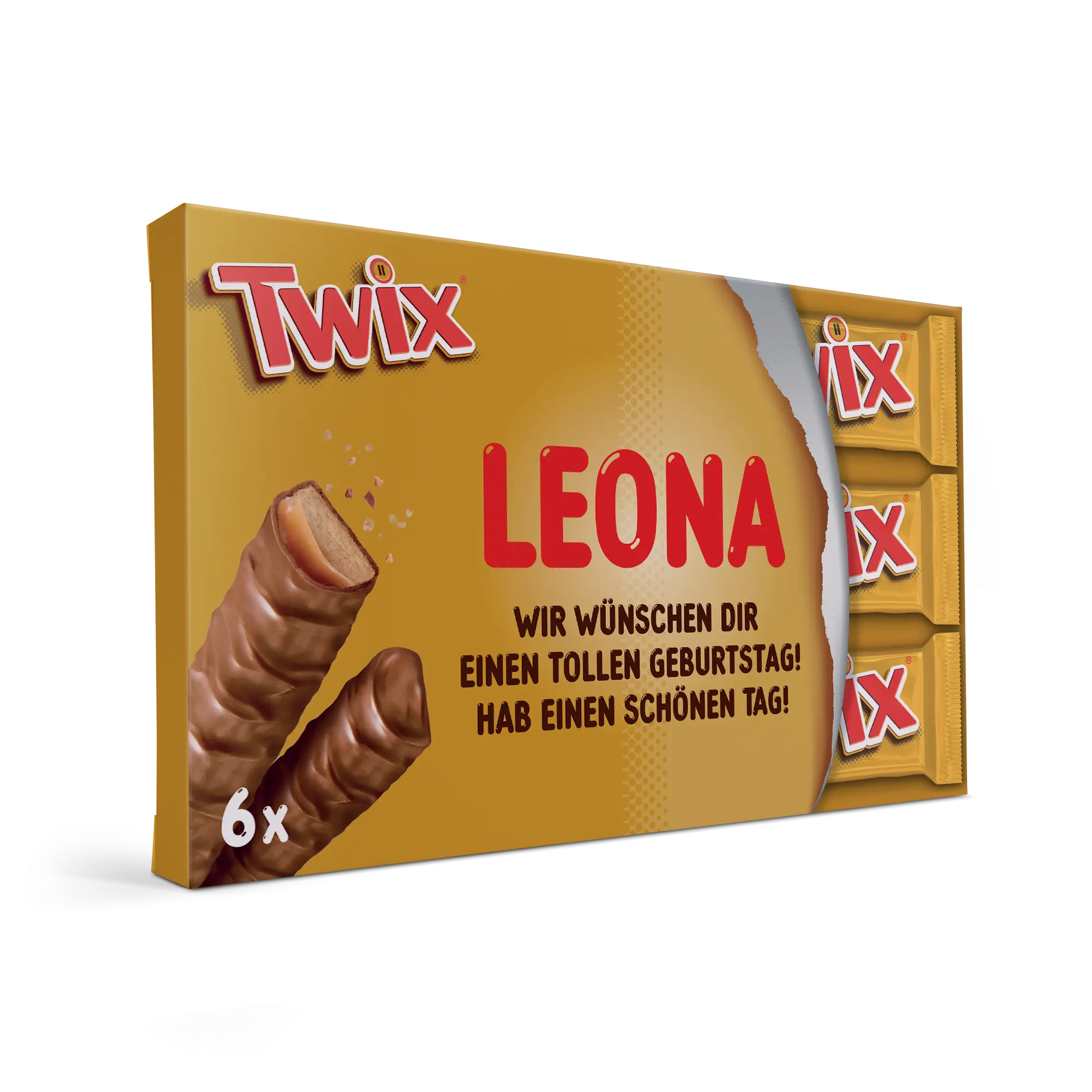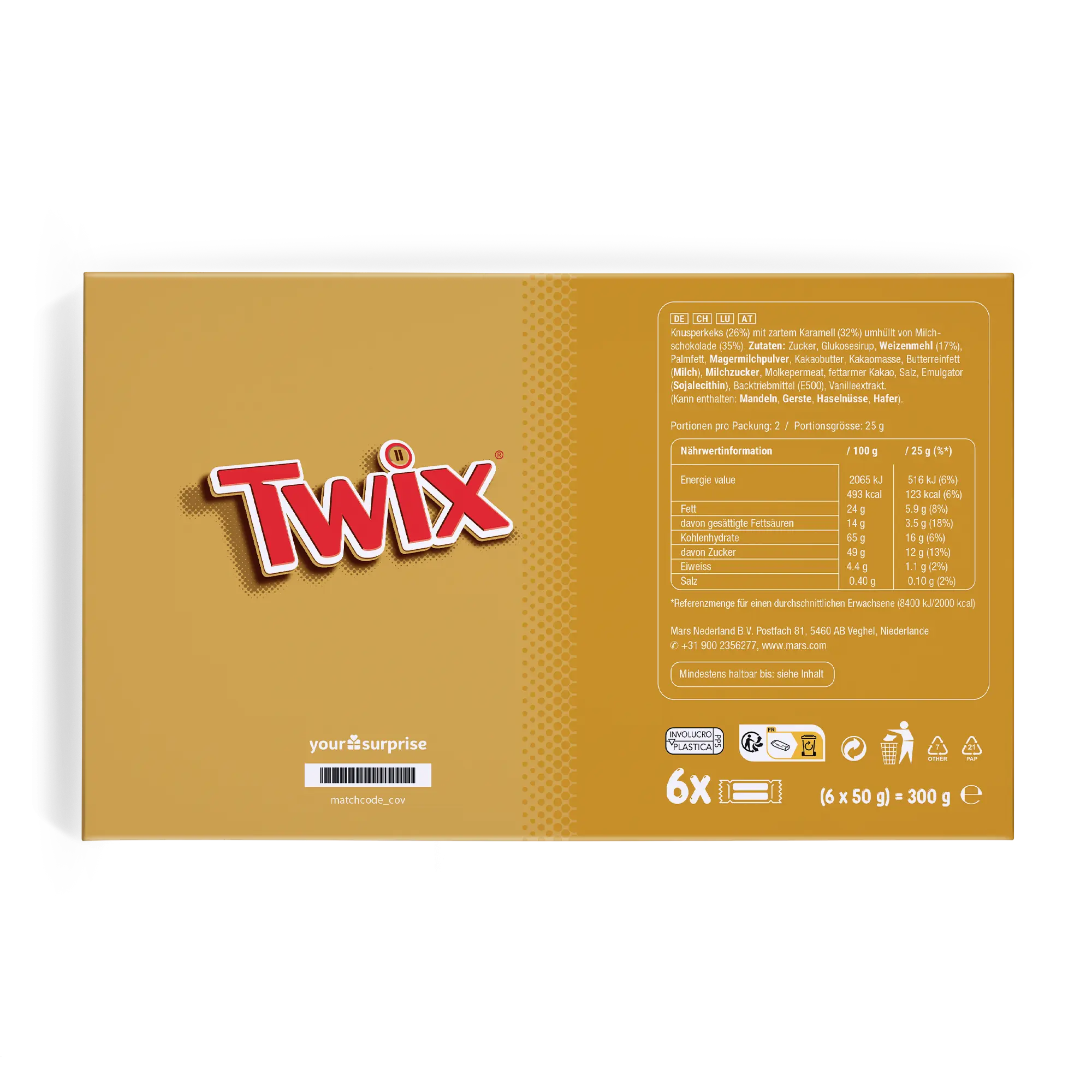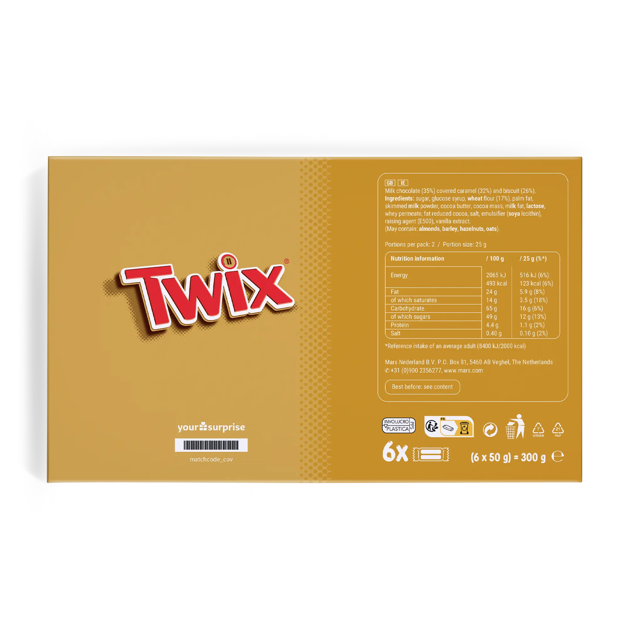Mais informações sobre a caixa de presente Twix: Dimensões: 24,2 x 14,5 x 2,2 cm Peso: 6 x 50 gramas Personalização: com nome, foto e/ou texto Impressão: perfeita e em cores vibrantes Ingredientes: Açúcar, xarope de glicose, farinha de TRIGO, gordura de palma, leite em pó desnatado, manteiga de cacau, massa de cacau, gordura láctea, LACTOSE, permeado de soro de leite, cacau desnatado, sal, emulsificante (lecitina de SOJA), agente de fermentação (E500), extrato de baunilha. Alérgenos: pode conter AMÊNDOA, CEVADA, AMENDOIM, AVEIA.