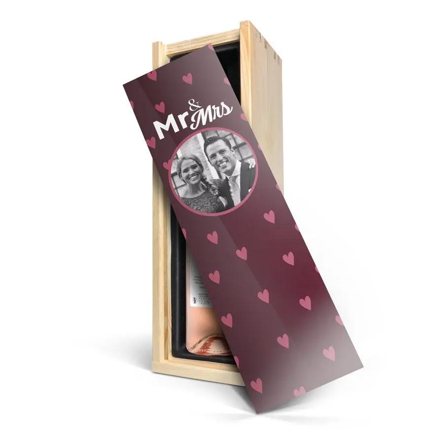 Delicioso vinho Maison de la Surprise em uma luxuosa caixa de madeira, apresentando a foto, logotipo e/ou texto de sua escolha. Crie o seu agora!