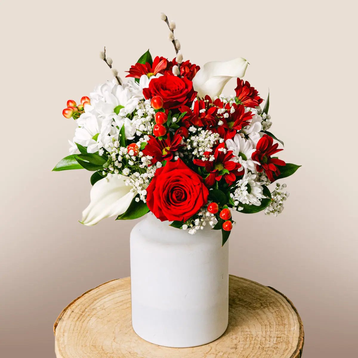 As lírios Calla receberam o nome da palavra grega para belo - Calla. Dizem que são um amuleto de boa sorte para ter felicidade o ano todo. Sua santidade e pureza são complementadas por rosas vermelhas clássicas e apaixonadas, tornando este um deslumbrante buquê yin-yang.