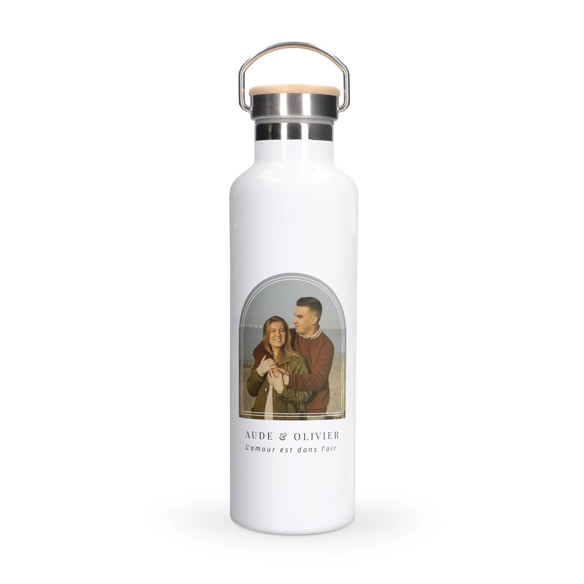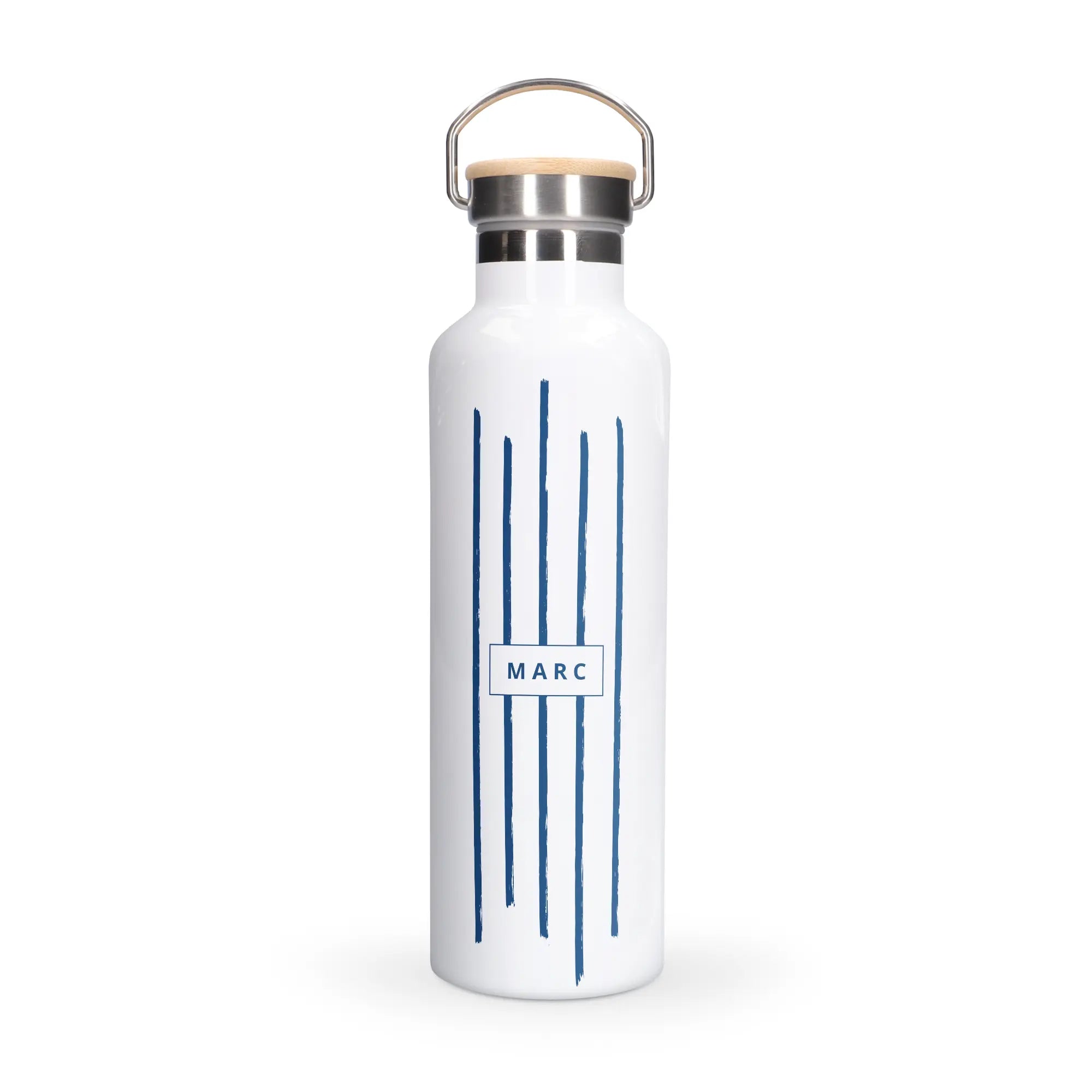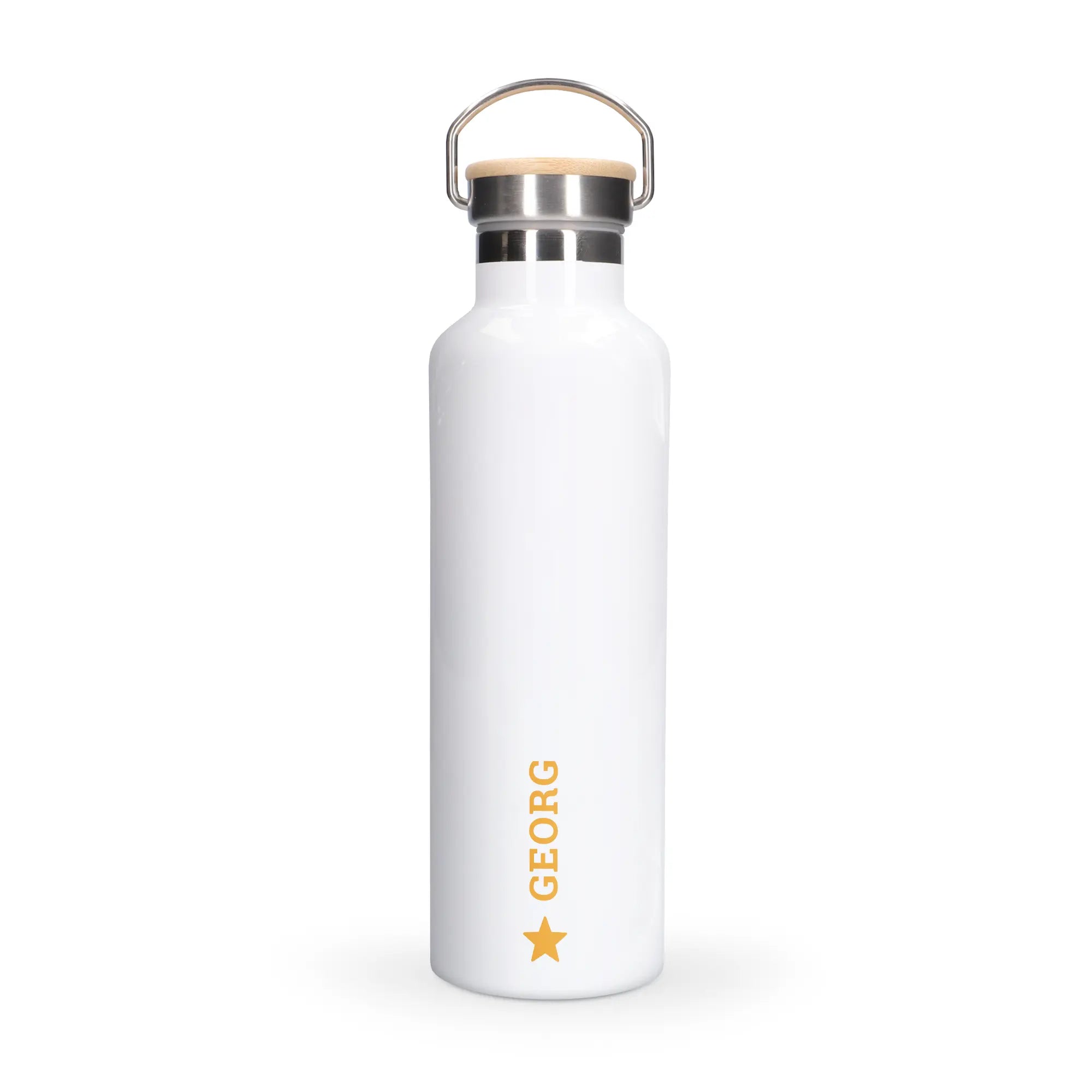 Mais informações sobre a garrafa de água personalizada: Material: aço inoxidável e alumínio de alta qualidade Cor: branca com tampa de bambu Capacidade: 750 ml Personalização: foto, texto e/ou logotipo Impressão: imagem perfeita e em cores vibrantes Térmica: mantém a temperatura fria por até 24 horas, quente por até 12 horas Extra: à prova de vazamentos e isolada, recomendada lavagem à mão Bom saber: A garrafa de água tem um visual moderno em alumínio. Isso significa que seu design será impresso diretamente na superfície da garrafa, conferindo ao seu presente um estilo industrial descolado. Também significa que o resultado final pode diferir do que você vê na sua tela.