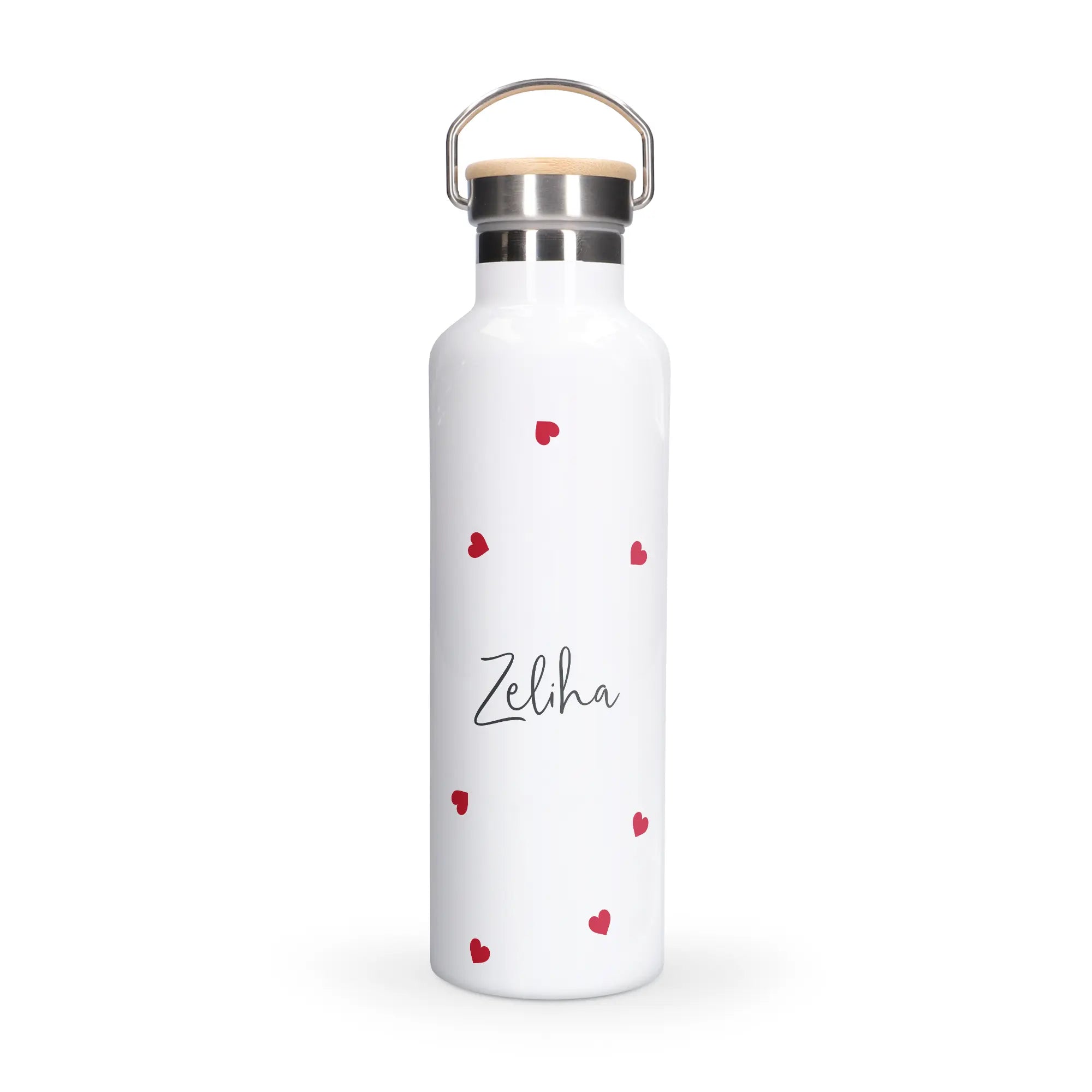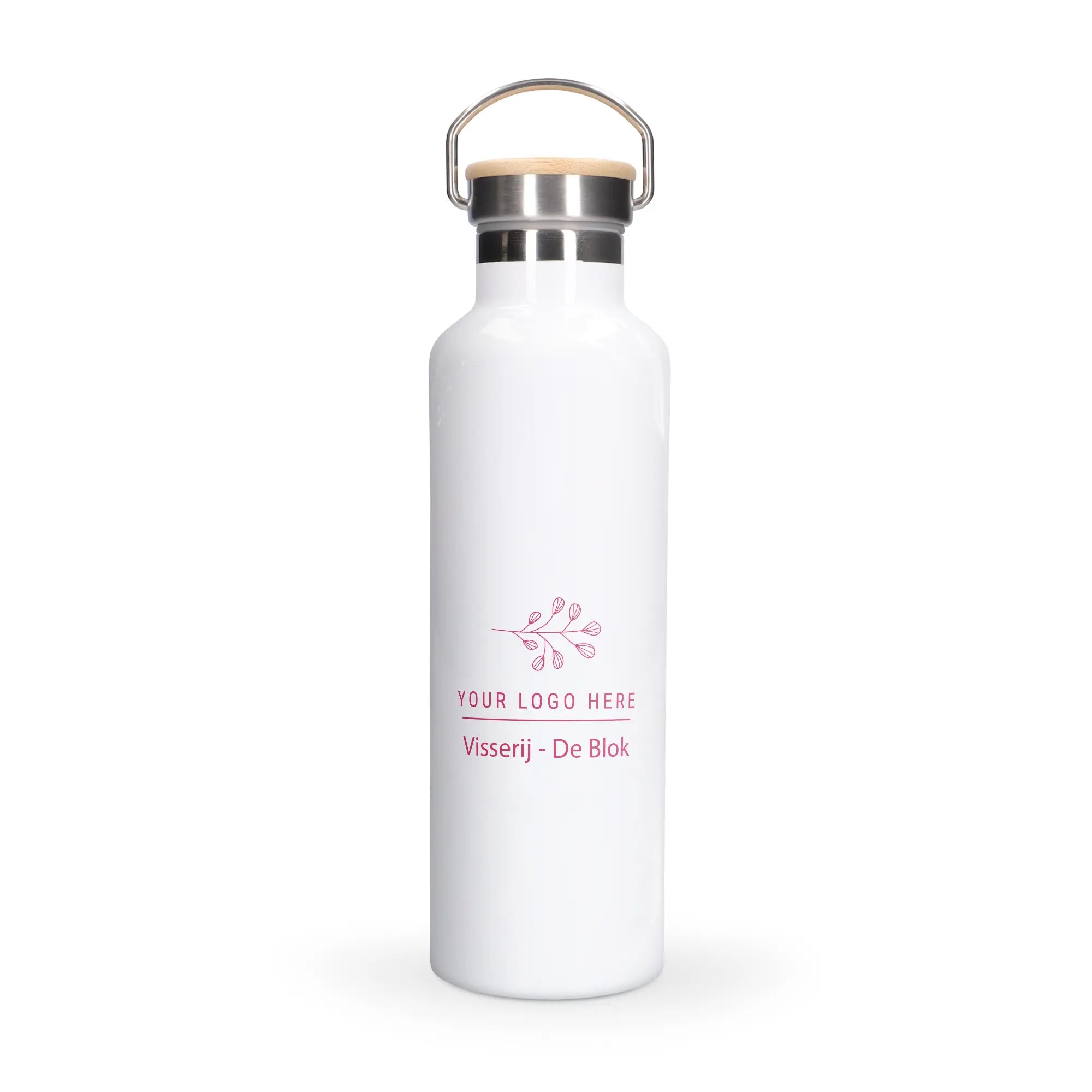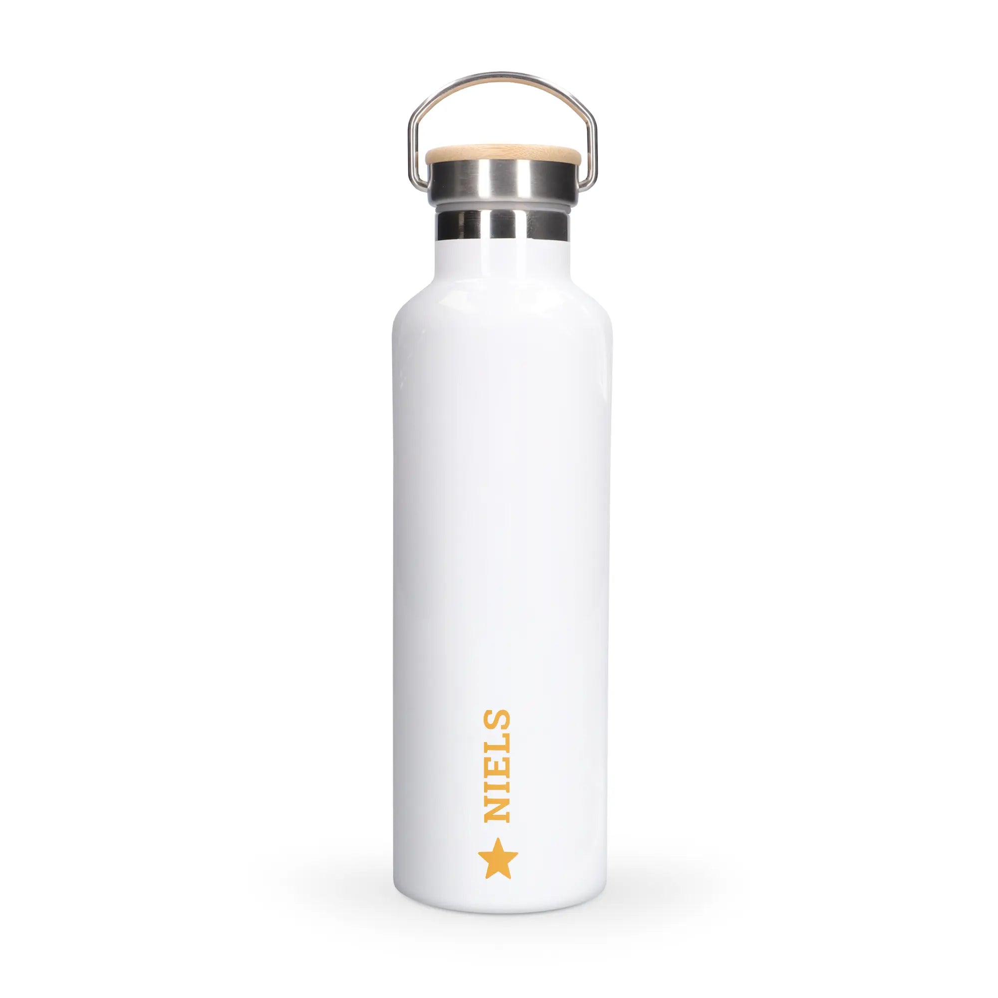 Mais informações sobre a garrafa de água personalizada: Material: aço inoxidável e alumínio de alta qualidade Cor: branca com tampa de bambu Capacidade: 750 ml Personalização: foto, texto e/ou logotipo Impressão: imagem perfeita e em cores vibrantes Térmica: mantém a temperatura fria por até 24 horas, quente por até 12 horas Extra: à prova de vazamentos e isolada, recomendada lavagem à mão Bom saber: A garrafa de água tem um visual moderno em alumínio. Isso significa que seu design será impresso diretamente na superfície da garrafa, conferindo ao seu presente um estilo industrial descolado. Também significa que o resultado final pode diferir do que você vê na sua tela.