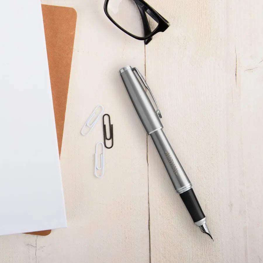 Informações adicionais sobre a caneta Parker Urban gravada:Marca: ParkerModelo: Urban Metro Tipo: Caneta-tinteiroCor da caneta: PrataCor da tinta: AzulPersonalização: Texto gravado Cor da gravação: Dourada Extra: inclui 1 recarga e é entregue em uma caixa de presente luxuosa. Pode ser recarregada com recargas Parker.Observação: esta caneta é adequada para canhotos.