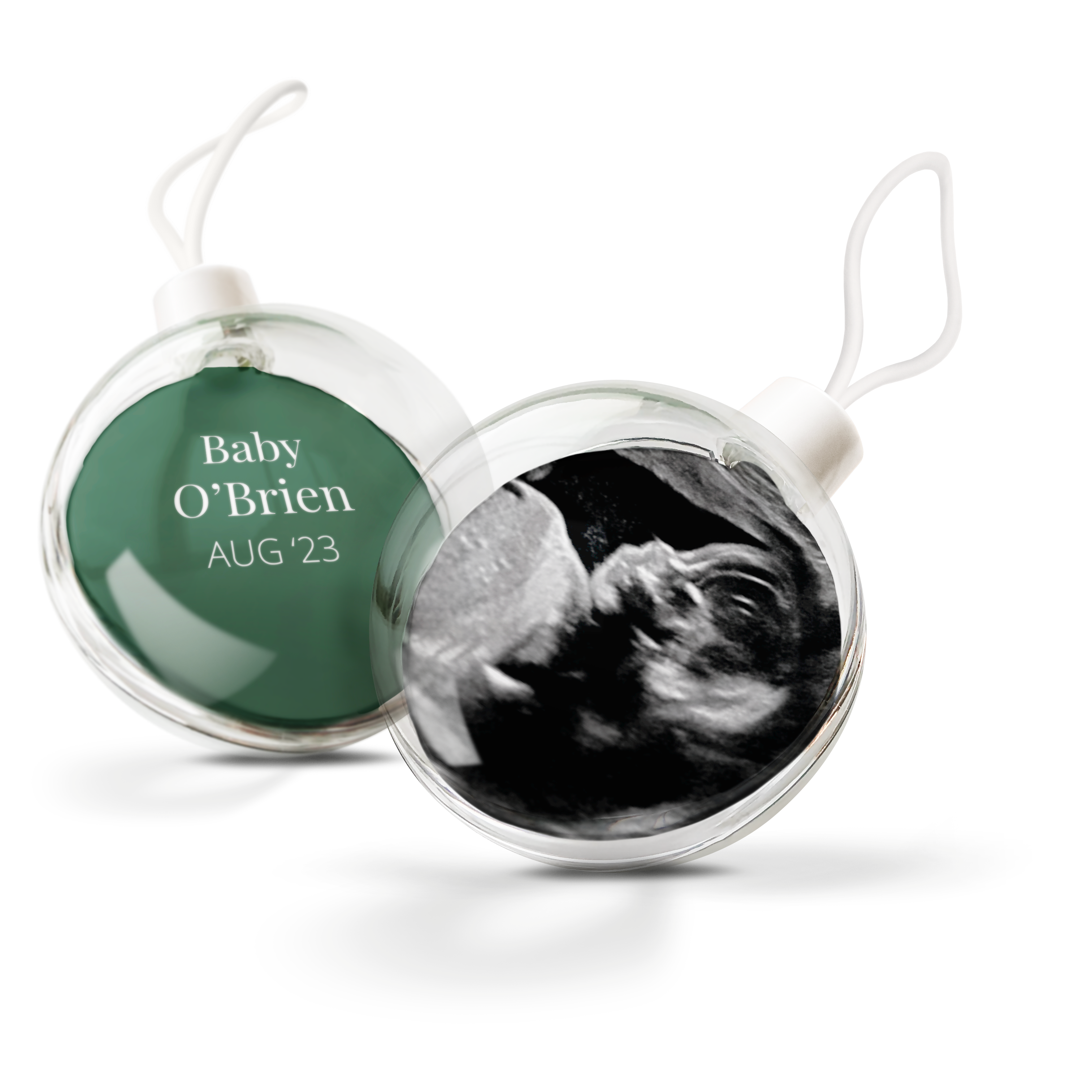 Uma bola de Natal pessoal impressa com uma foto? Seu design em ambos os lados no meio da bola de Natal, realmente uma visão incrível! Feliz Natal!