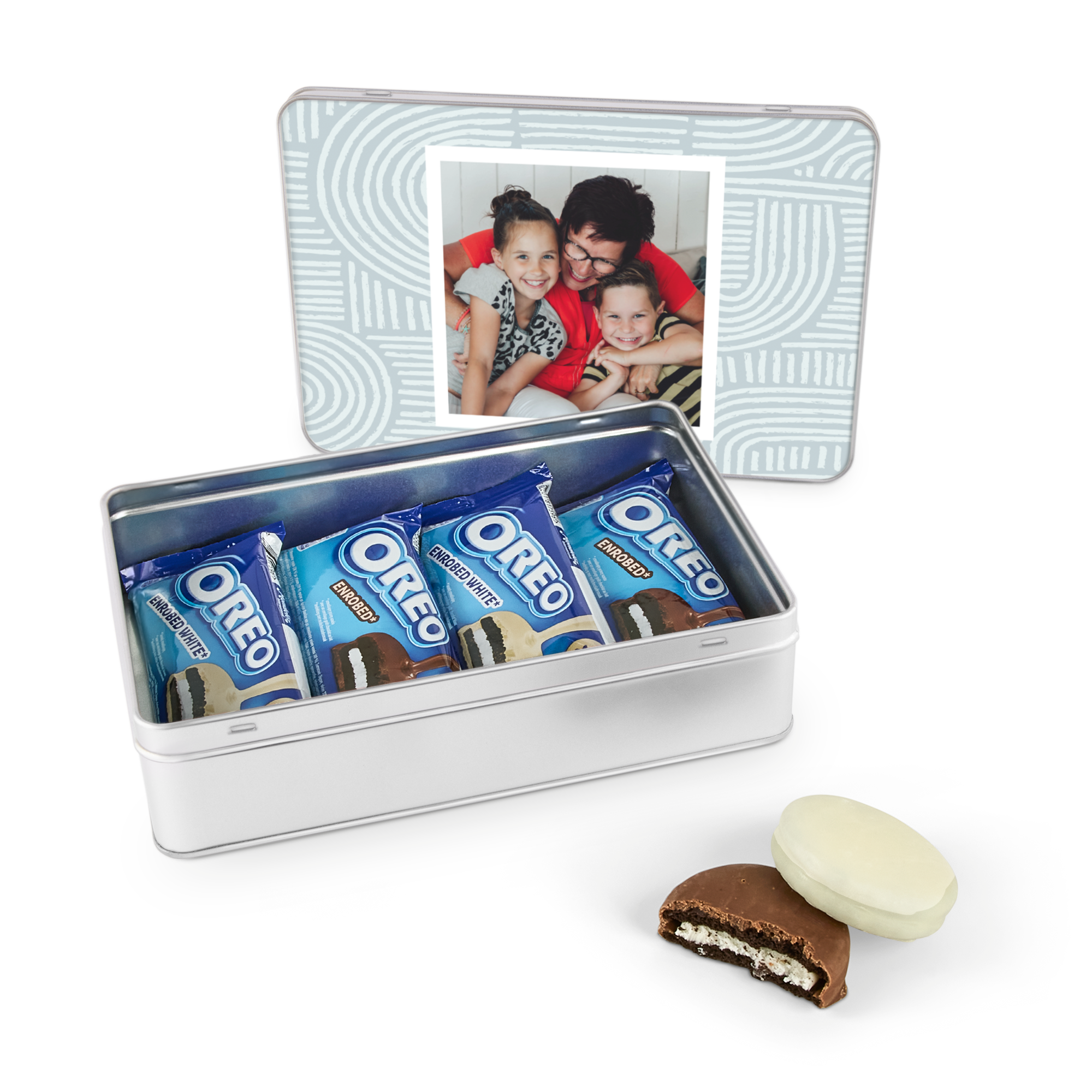 Super legal lata de armazenamento com foto e/ou nome! Repleta de deliciosos Oreos cobertos com uma camada de chocolate.