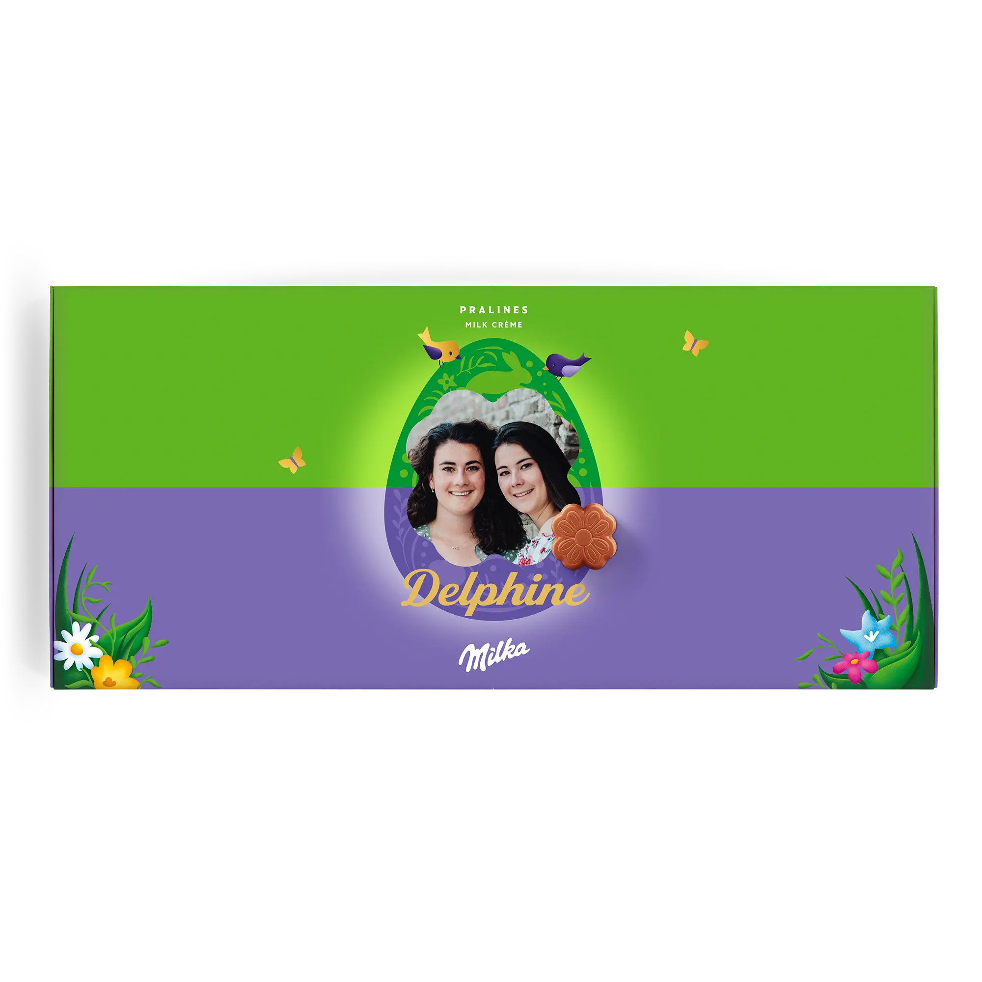 Caixa de chocolate Milka especial para a Páscoa. Deliciosas pralinas com nome, foto e uma mensagem pessoal. Surpreenda seus entes queridos!