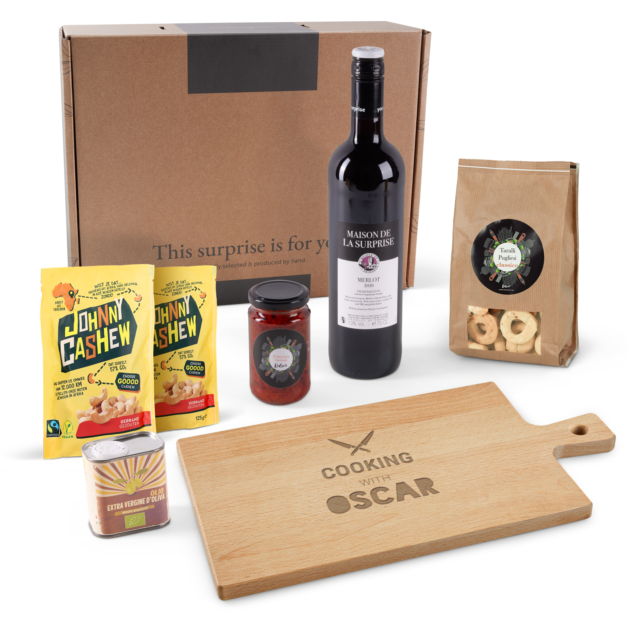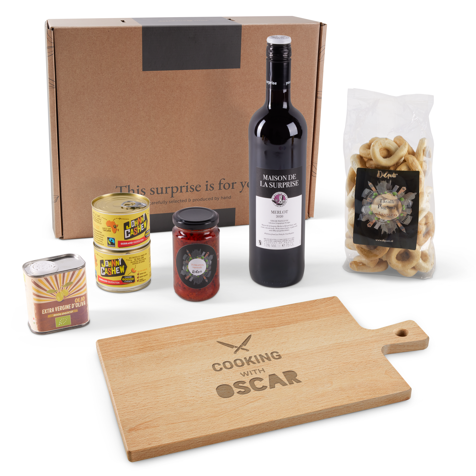 Mais informações sobre o conjunto de presente de vinho e petiscos: Inclui: tábua de servir de madeira, azeite (100ml), biscoitos (350gram), tapenade de tomate (212ml), castanhas de caju (2x 80gram), garrafa de Maison de la Surprise Merlot Dimensões da caixa de presente: 39 x 30 x 11,5 cm Mais informações sobre a tábua de servir de madeira: Material: madeira de faia maciça de alta qualidade, certificada pelo FSC Acabamento: oleada e incluindo um cordão de couro Dimensões: 36,5 x 20 x 1,5 cm Personalização: gravação de texto Cor da gravação: madeira Informações adicionais: - não é adequada para a máquina de lavar louça! - a madeira é um produto natural, portanto, seu presente pode diferir ligeiramente do exemplo e da foto de pré-visualização. Mais informações sobre o vinho: Marca: Maison de la Surprise Merlot Tipo de vinho: tinto, suave e frutado Conteúdo: 750 ml País de origem: França Variedade de uva: merlot Característica: Maison de la Surprise Merlot possui notas intensas de frutas escuras e um toque de baunilha. Excelente com aves e carnes assadas. Ingredientes castanhas de caju, torradas e salgadas (Johnny Cashew): 96% castanha de caju, 3% óleo de girassol, 1% sal. Alérgenos: contém castanha de caju. Pode conter traços de amendoim. Ingredientes tapenade de tomate (DiGusti): tomates secos ao sol, óleo de girassol, sal, vinagre (lonely brid), alho, aromas. Ingredientes biscoitos (DiGusti): farinha tipo ''0'', vinho branco, óleo de girassol, azeite extra virgem, sal. Alérgenos: contém cereais com glúten e sulfitos. Pode conter traços de sementes de gergelim.