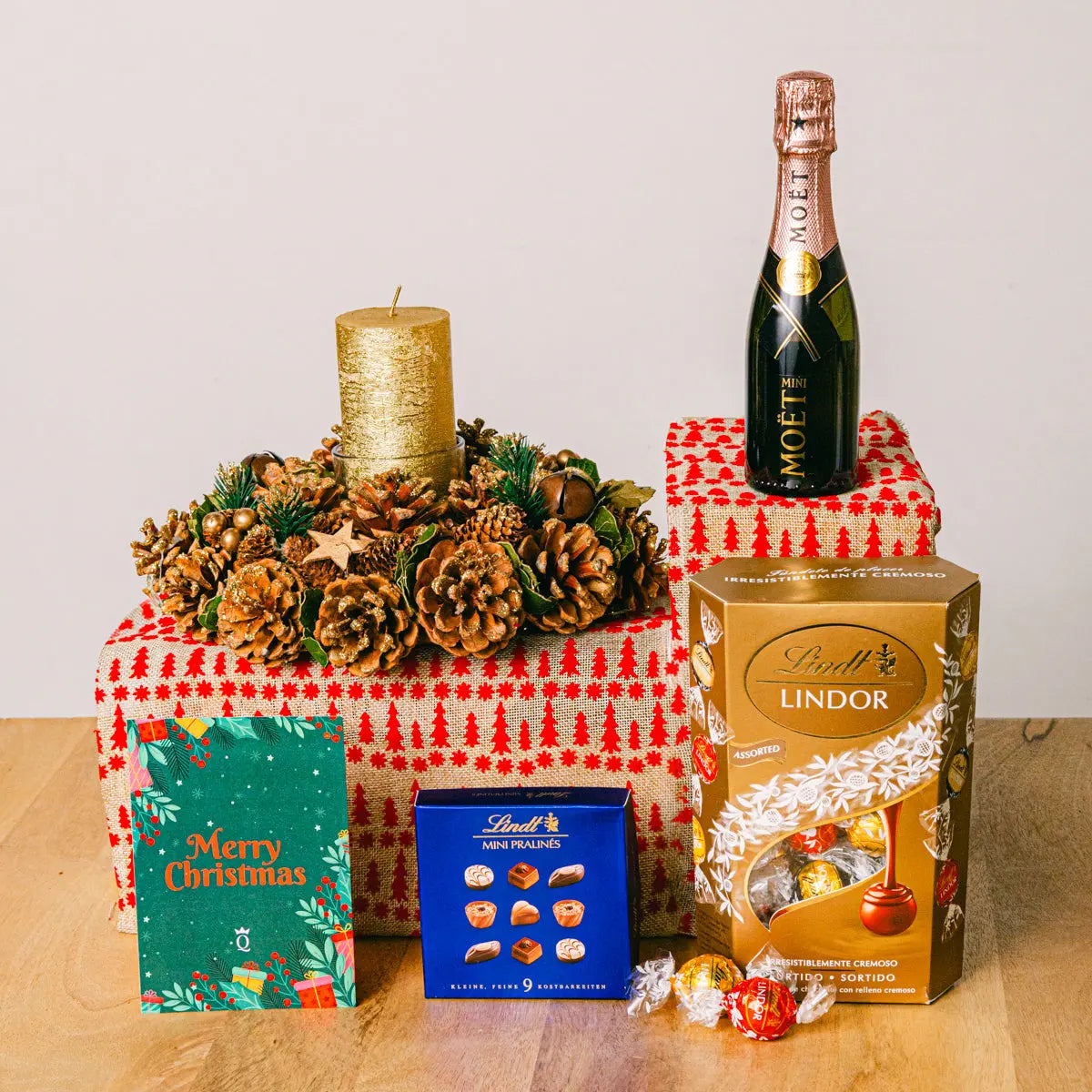 Componentes: Mini Moët Rosé (20cl), Mini Pralinés Lindt (44g), Cornet Lindor (337g), um arranjo de mesa festivo com folhagem natural e um cartão personalizado.